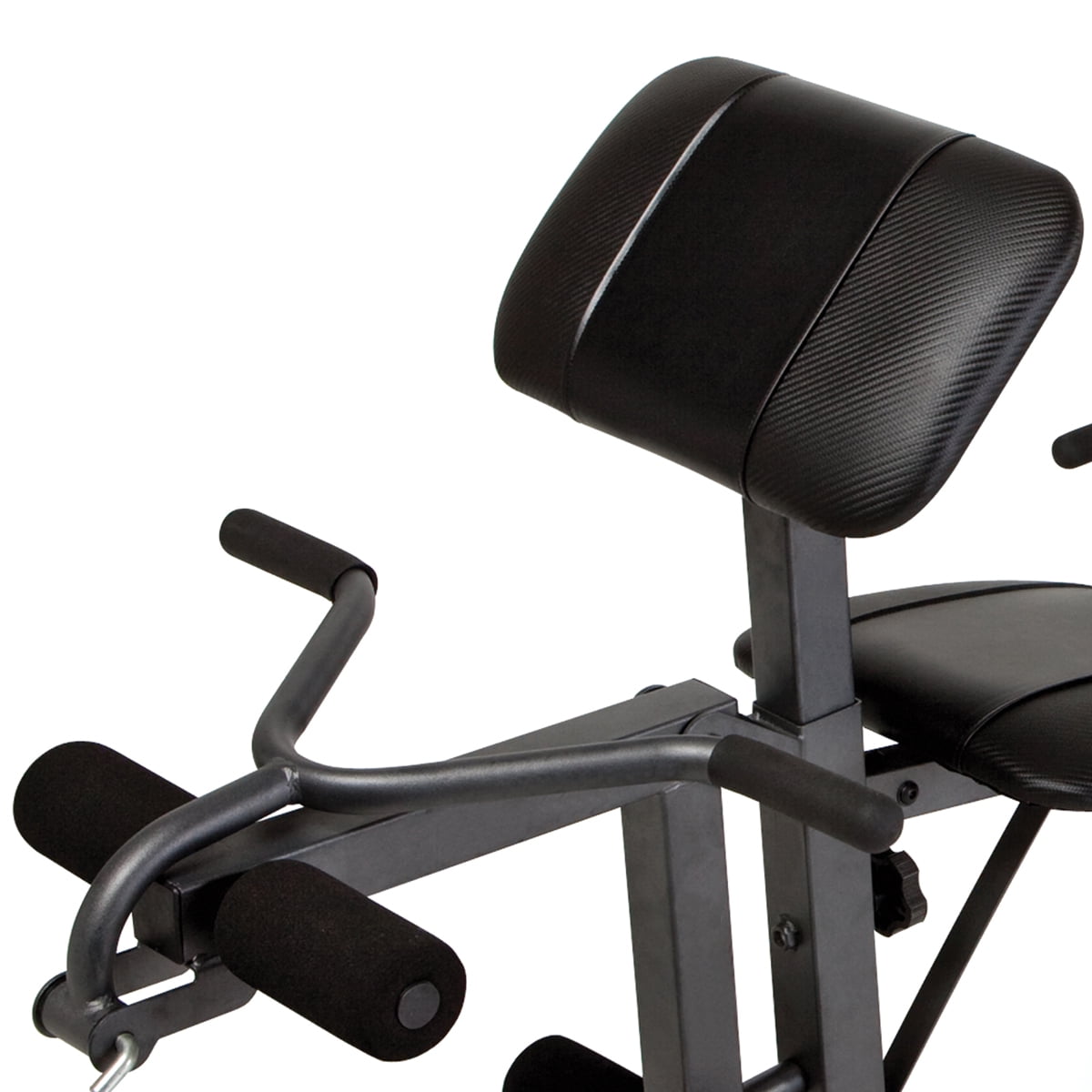 14-gauge, square steel tubing: 1″ x 2″ and 2″ x 2″ Upholstery: Rolled construction with high density foam and accentuated vinyl Finish: Durable powder coat Adjustable preacher curl bicep pad Dual-function leg developer with pivot point that aligns with knee joints Adjustable, 4-position back pad Comfortable foam roller pads Independent pec-fly arms Accepts standard size barbell and weight plates Compact frame design Durable construction Easy to assemble Exercise most major muscle groups Maximum weight capacity 300lb on the uprights Maximum weight capacity 100lb on the butterflies Maximum weight capacity 100lb on the leg developer Maximum weight capacity 100lb on the arm curl Maximum user’s weight: 300lb Assembled Dimensions: 66″L x 53″W x 47″H