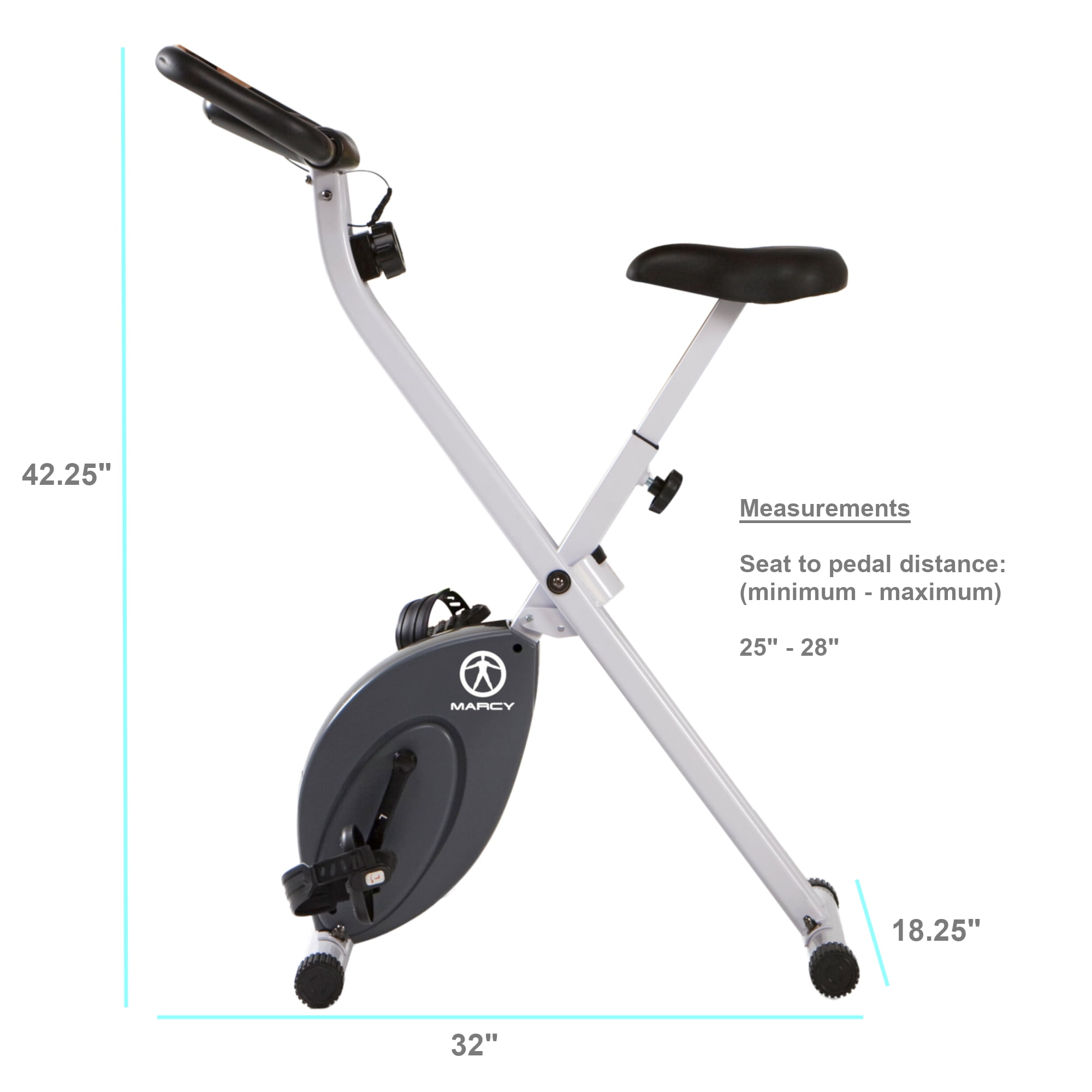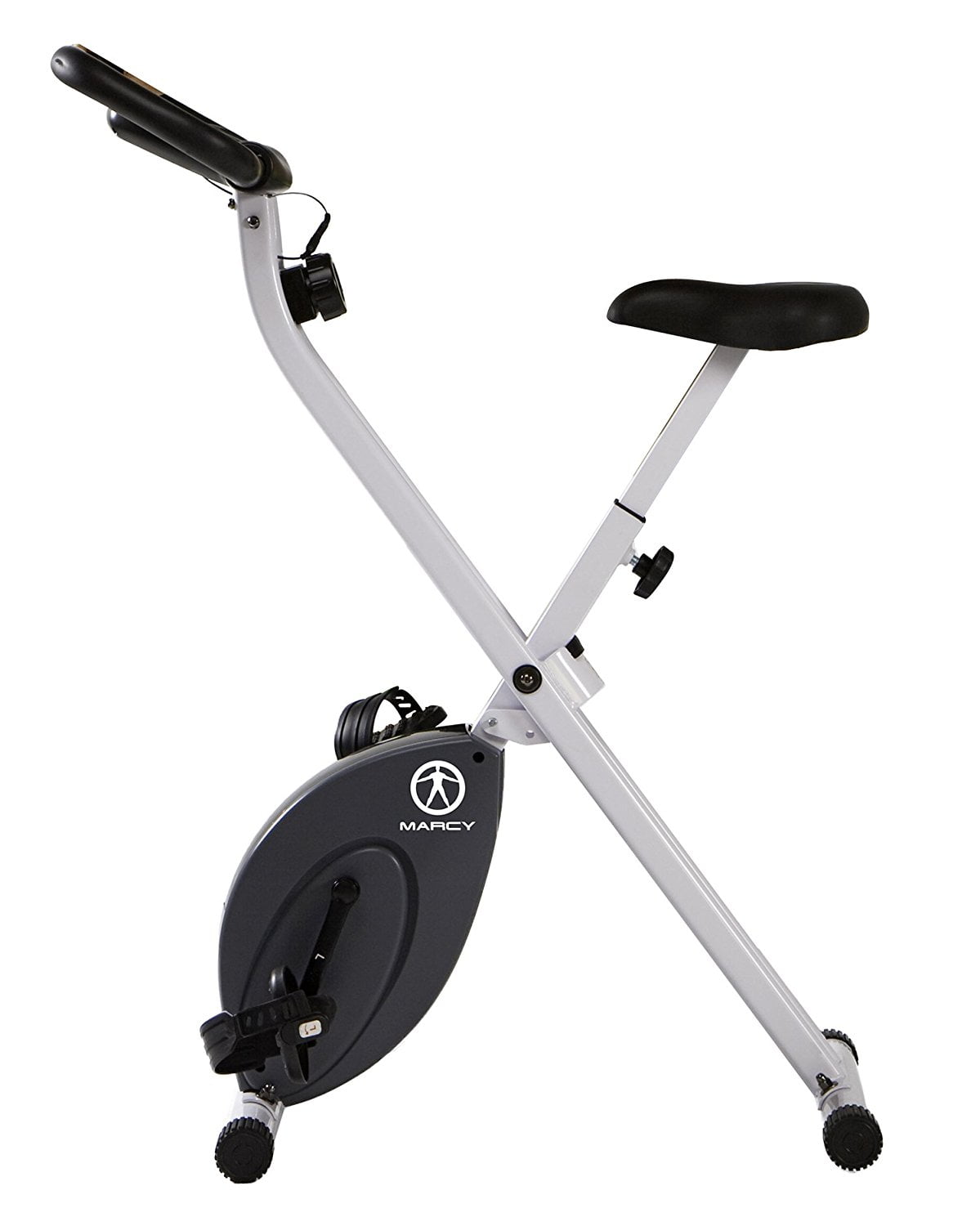 **Marcy Foldable Exercise X-Bike** Work out at home in a compact space Magnetic resistance for smooth pedaling Padded seat and handle bar for maximum comfort Durable steel frame construction Wide, non-slip pedals Multi-function electronic display Time Distance Speed Calories burned Compact, lightweight foldable design Item weight: 40 lbs Item dimensions: 32″ x?18.25″ x 45.25″ Part #: NS652 Warranty: Two-year Impex Warranty