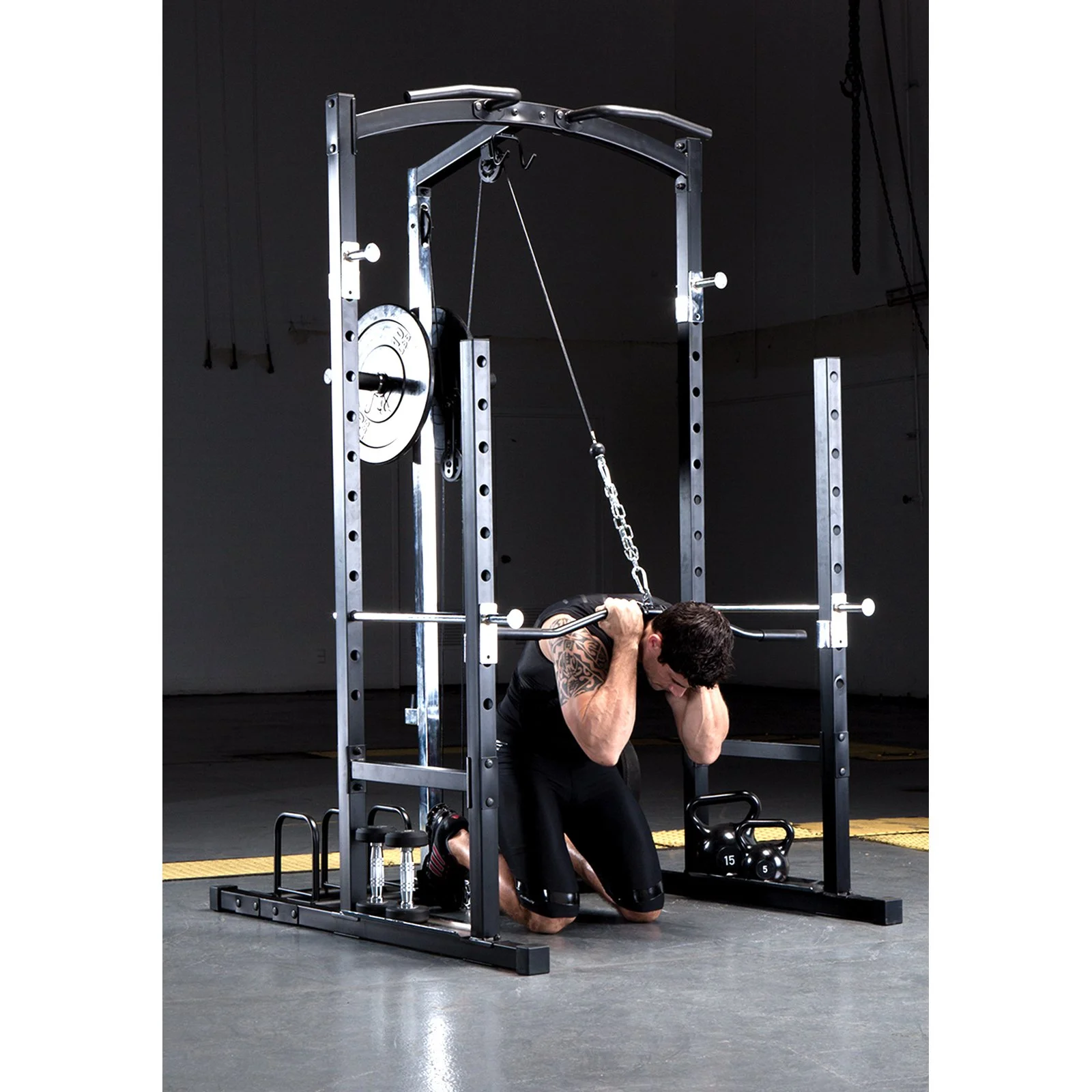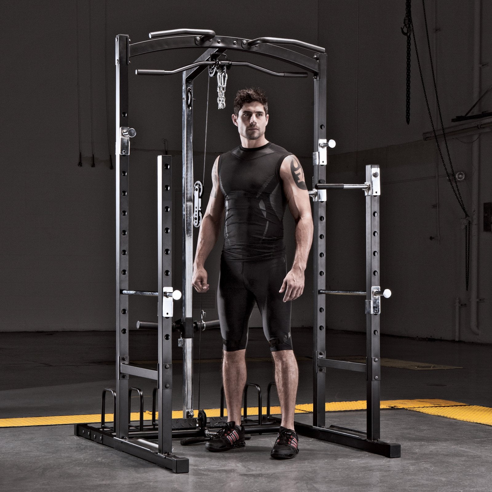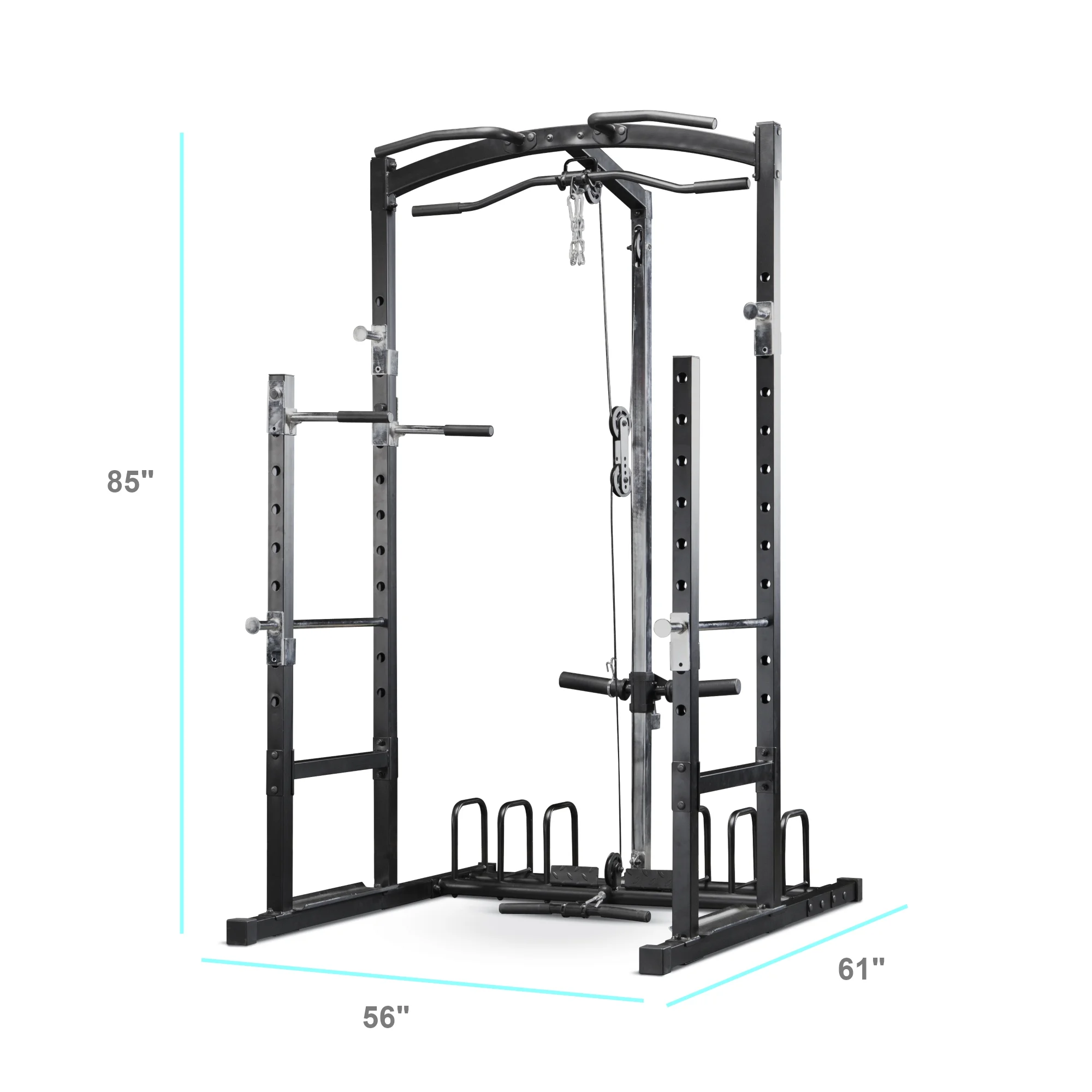 Marcy Home Gym Cage System Workout Station for Weightlifting, Bodybuilding and Strength Training MWM-7041: High and low pulley positions for upper and lower body exercises Lat and triceps bar Wide-grip pull-up handles Adjustable-height chromed dip handles Adjustable, commercial-style Olympic barbell catches Adjustable, commercial-style safety catches Olympic plate loaded trolley Foot plate for seated row exercises Kettle weight and weight plate storage organizer Open, full-cage design for safe training Heavy-duty, high-quality construction MWM-7041 cage system for a variety of workouts Based on the classic power rack design found in most health clubs and gyms Ideal for strength training in the comfort of your own home