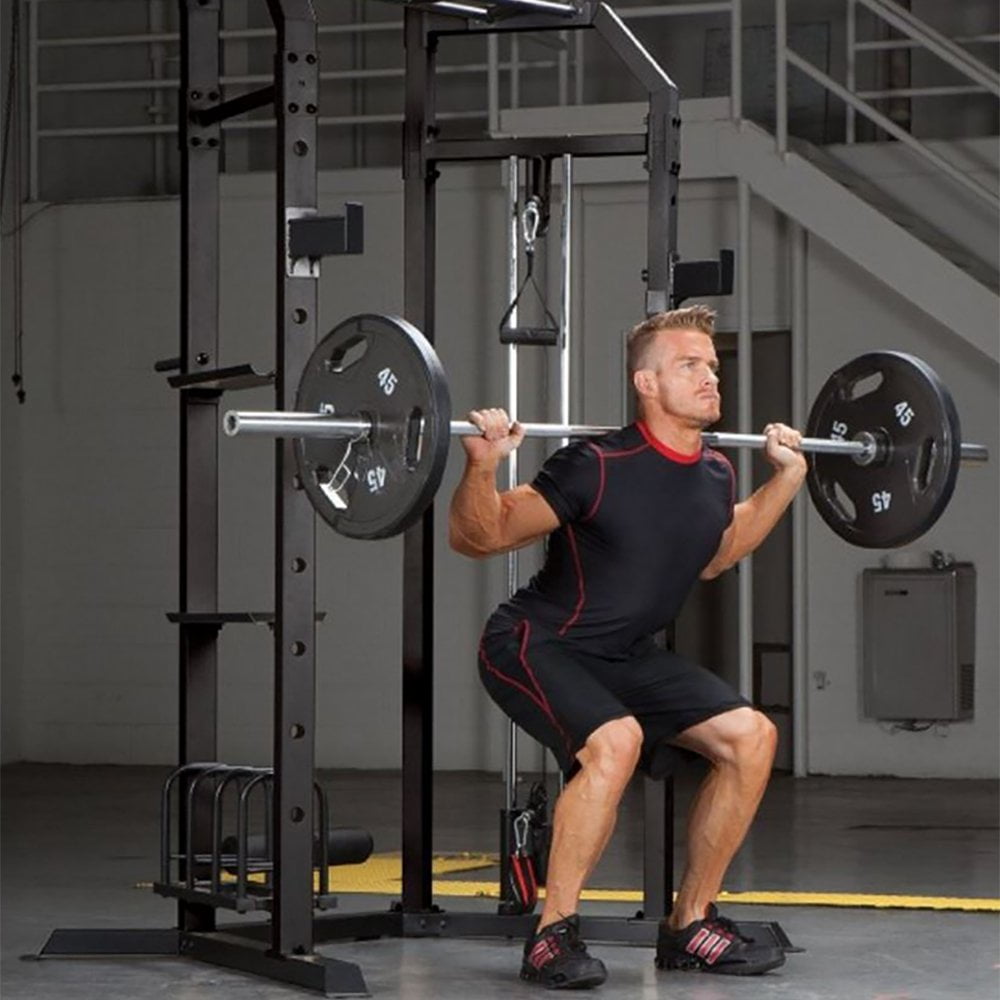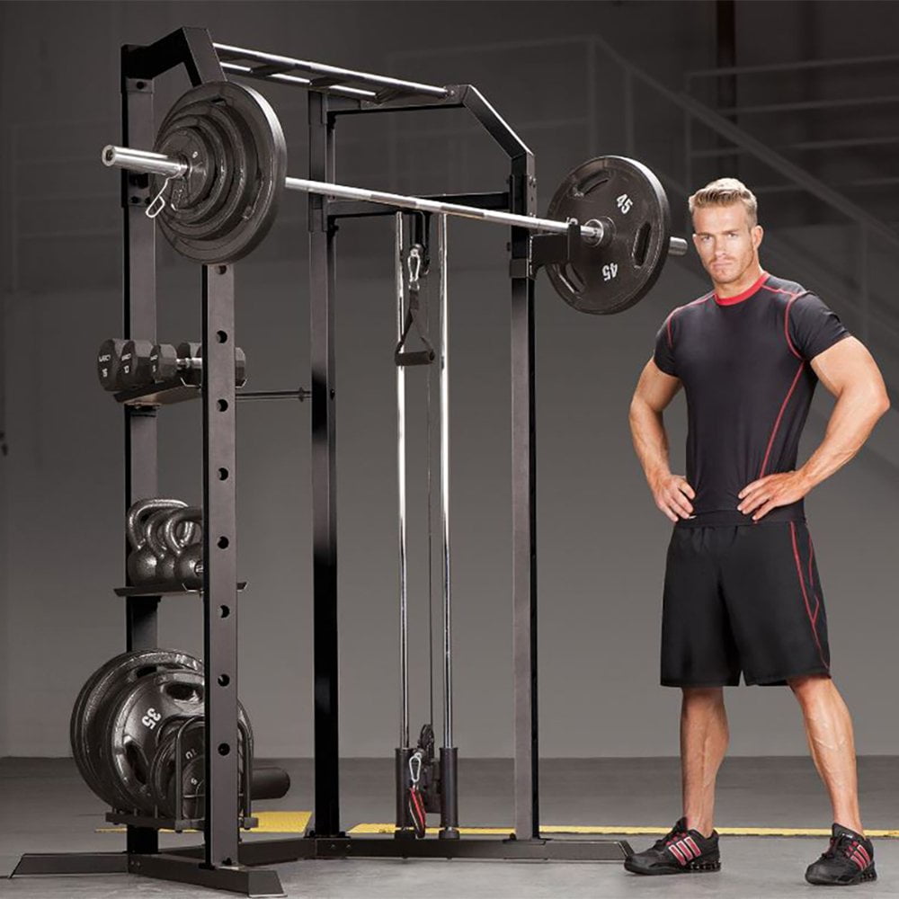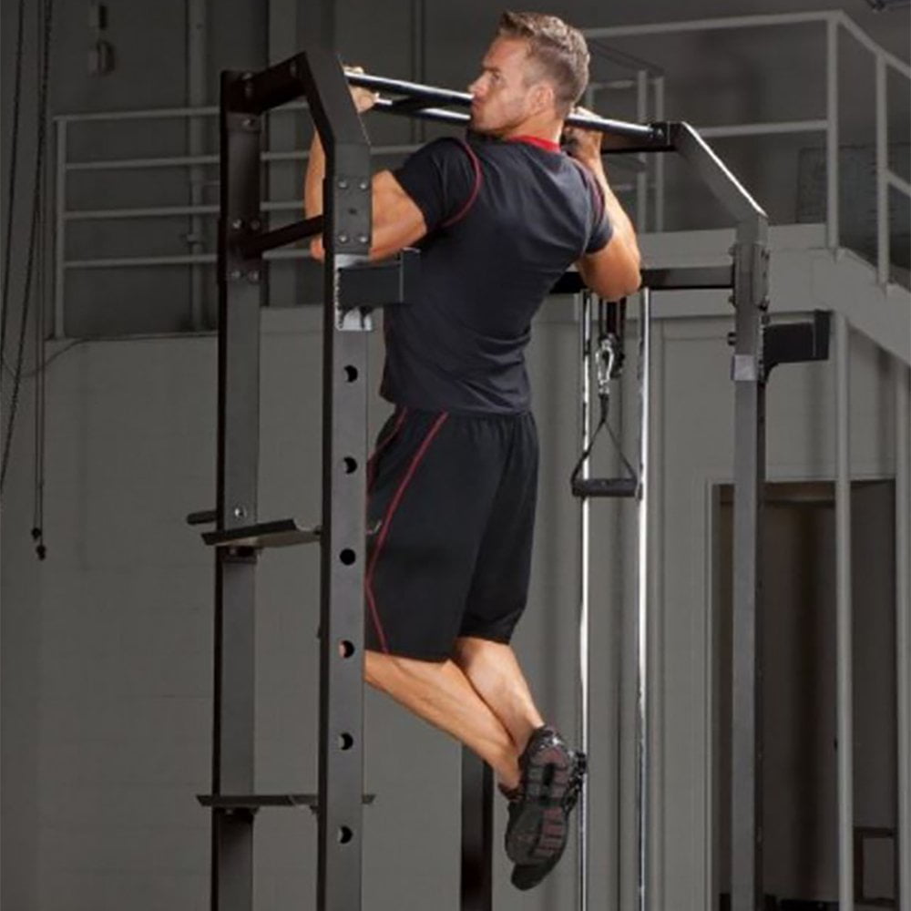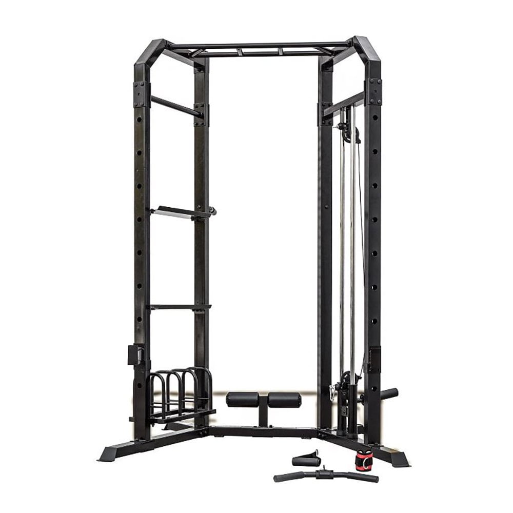 Strengthen your triceps and chest and feel good about your physique with help from the Marcy Olympic Strength Pull-Up Cage System. This multi-handle pull-up station has wide and narrow grips and dip handles for more fit and toned muscles. Use this system at home and tone your whole body with the pull-up bar, high and low pulleys, 6 positions adjustable utility bench with leg developer, sit up and abdominal station, and dips bar. This bad boy is heavy duty for high-intensity training, so be prepared to work hard and get results. Its versatile and multi-functional design allows you to adjust the commercial style bar catches, store your dumbbell and kettle weights, and organize your weight plates on the storage organizing rack. Although a bench and weights are not included, there is plenty of storage area for them.