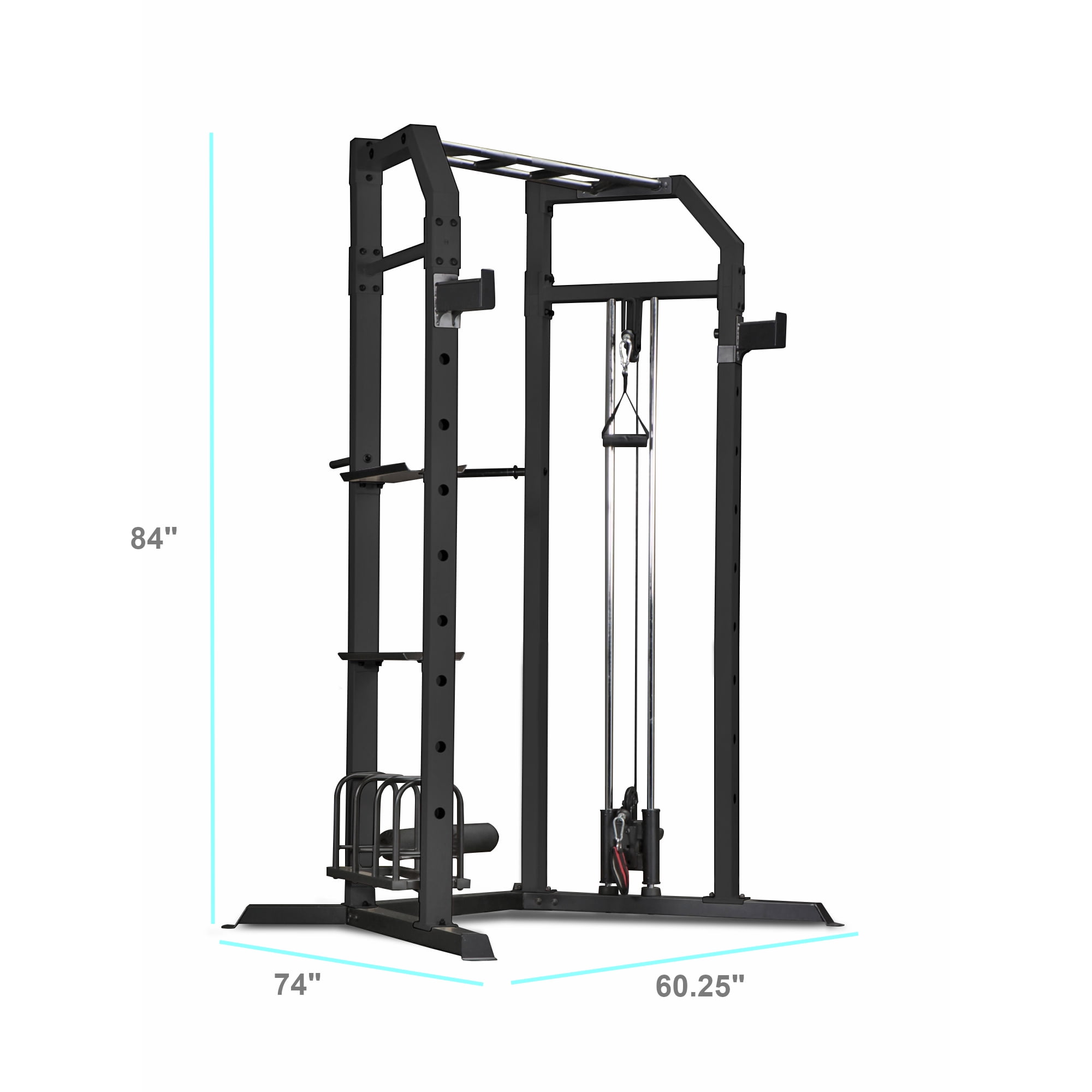 Impex Marcy Olympic Strength Cage System For Triceps And Chest Development: Assembly required Multi handle pull up station with wide and narrow grips Dip handles for greater triceps and chest development Adjustable commercial-style bar catches High and low pulleys for upper and lower body exercises Dumbbell and kettle weights storage shelves Weights not included Sit up angle securing pads Bench and weights sold separately Pull Up Bar: 300 pounds Sliding Weight Post: 155 pounds Plate Rack: 410 pounds Each Dumbbell Kettlebell Tray: 265 pounds Bar Catch: 300 pounds The cable system generates a 1:1 ratio of resistance from the weights loaded on sliding weight post Dimensions (L x W x H): 46 x 60 x 87 inches Weight: 96 pounds