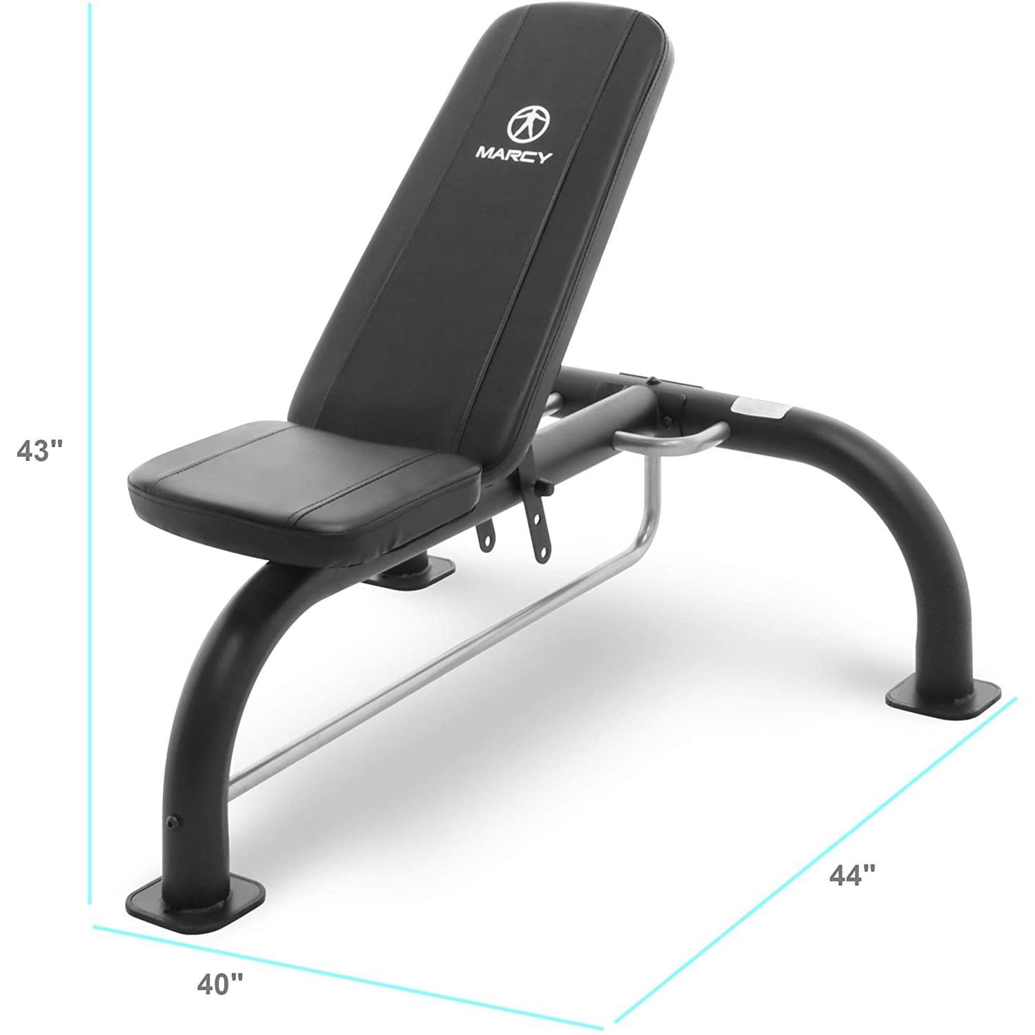 The Marcy Utility Bench is a multi-purpose bench with 6 different reclining positions that allow for multiple workouts including chest press, incline press, military press, and decline press. This Marcy Utility Bench also folds flat for convenient storage. Positions vary from 1 degree angle to 81 degree angles. Compact design with heavy duty steel frame construction and a burable powder coated finish that is sure to last for years to come. Dimensions: 43.75 x 35.5 x 42.