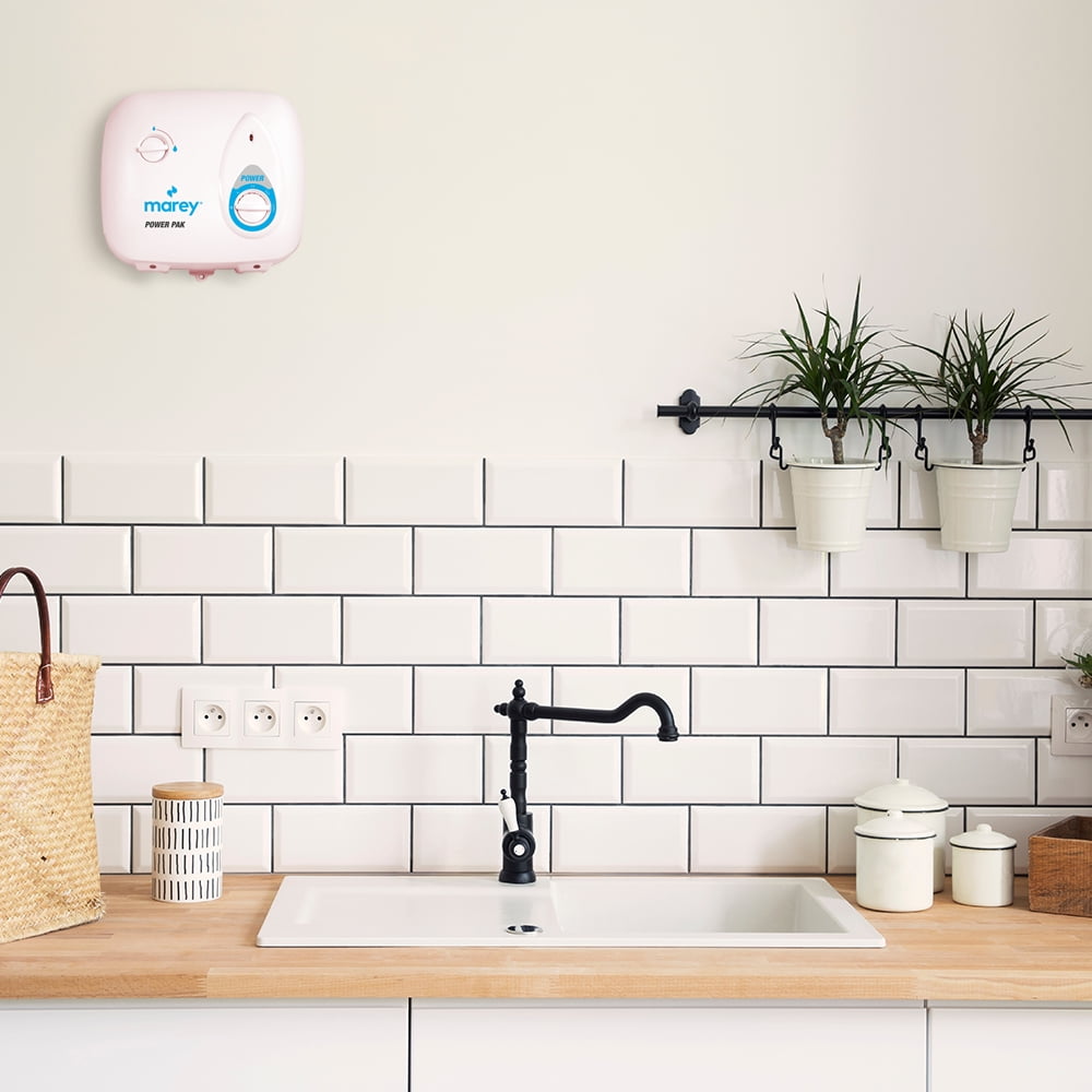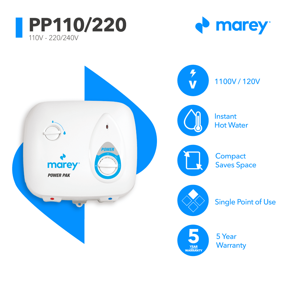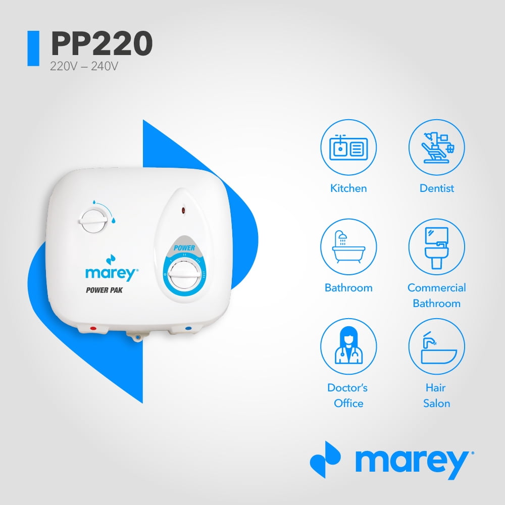 Enjoy hot water and major energy savings with the Marey Power Pak 2.0 GPM PP220 Electric Tankless Water Heater. This versatile, tankless water heater allows you to regulate energy consumption by adjusting power settings: 2200-4400-6600-8800 Watts. The heater can be wired to a 10, 20, 30, or 40 Amp breaker. The Marey Power Tankless Water Heater Power Pak heats water only when needed, helping you save energy and money on your electricity bills. The water heater has a Volume Capacity of two gallons per minute and can supply hot water for up to 2 points of use simultaneously in a tropical climate. This versatile water heater can be installed under the sink, in the bathroom, or anywhere else you need hot water. Activate the water tank easily with very low water pressure. Bring warm flowing water to your home with Marey.