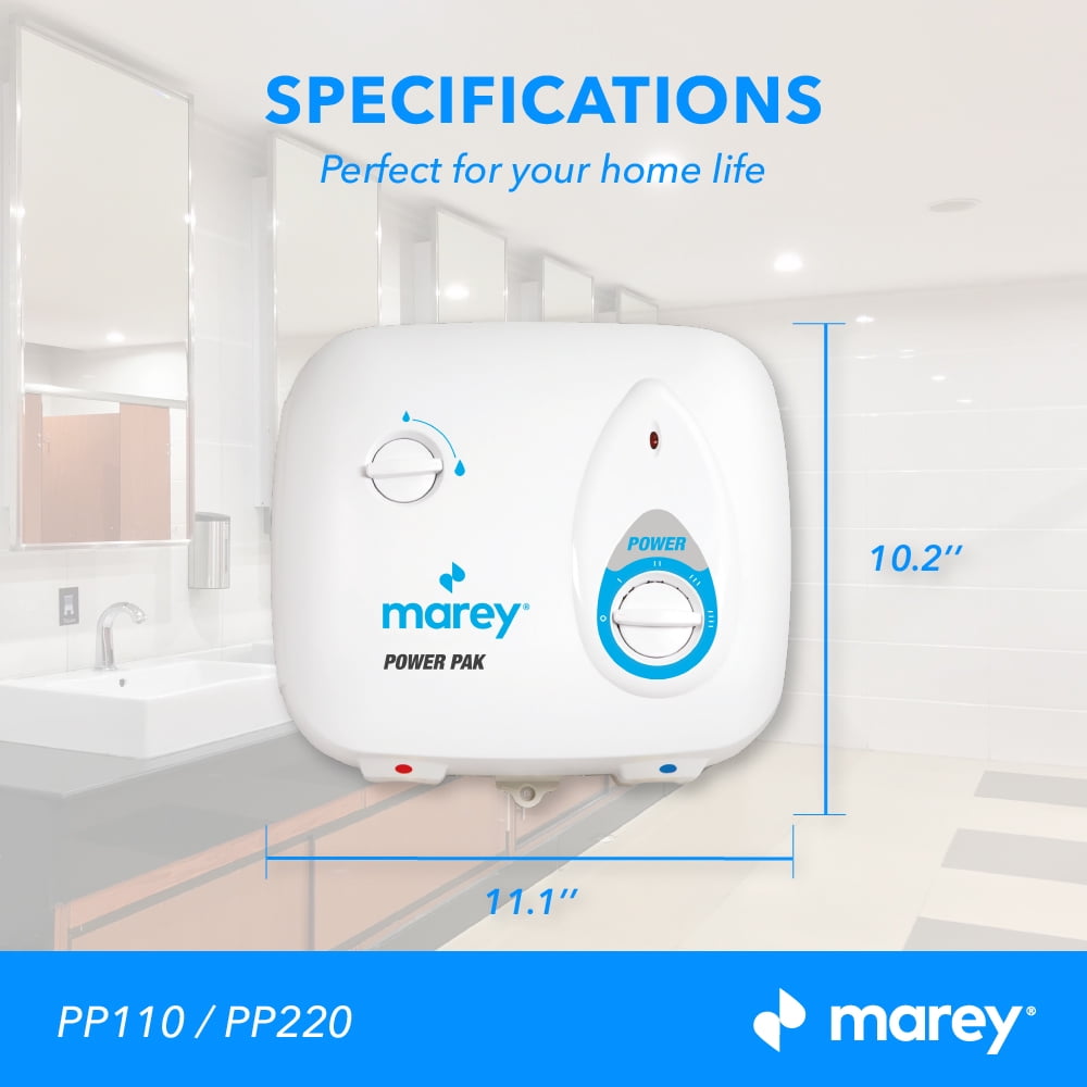 Regulate energy consumption with the Marey Power PP220 Electric Tankless Water Heater Power Pak Adjustable power settings from 2200 to 8800 Watts. Tankless water heater is able to be wired to a 10, 20, 30, or 40 Amp breaker Reliable water heater can be used as a point of use or to supply hot water to an entire apartment or small house Volume Capacity of 2 gallons per minute for up to 2 simultaneous points of use in warmer clients. Reduce electricity usages and save on energy costs for water heating Heater includes a filter on the water inlet to prevent sediments from damaging the unit Color: White Dimensions (L x W x H): 11 x 5 x 12 inches Weight: 7 pounds