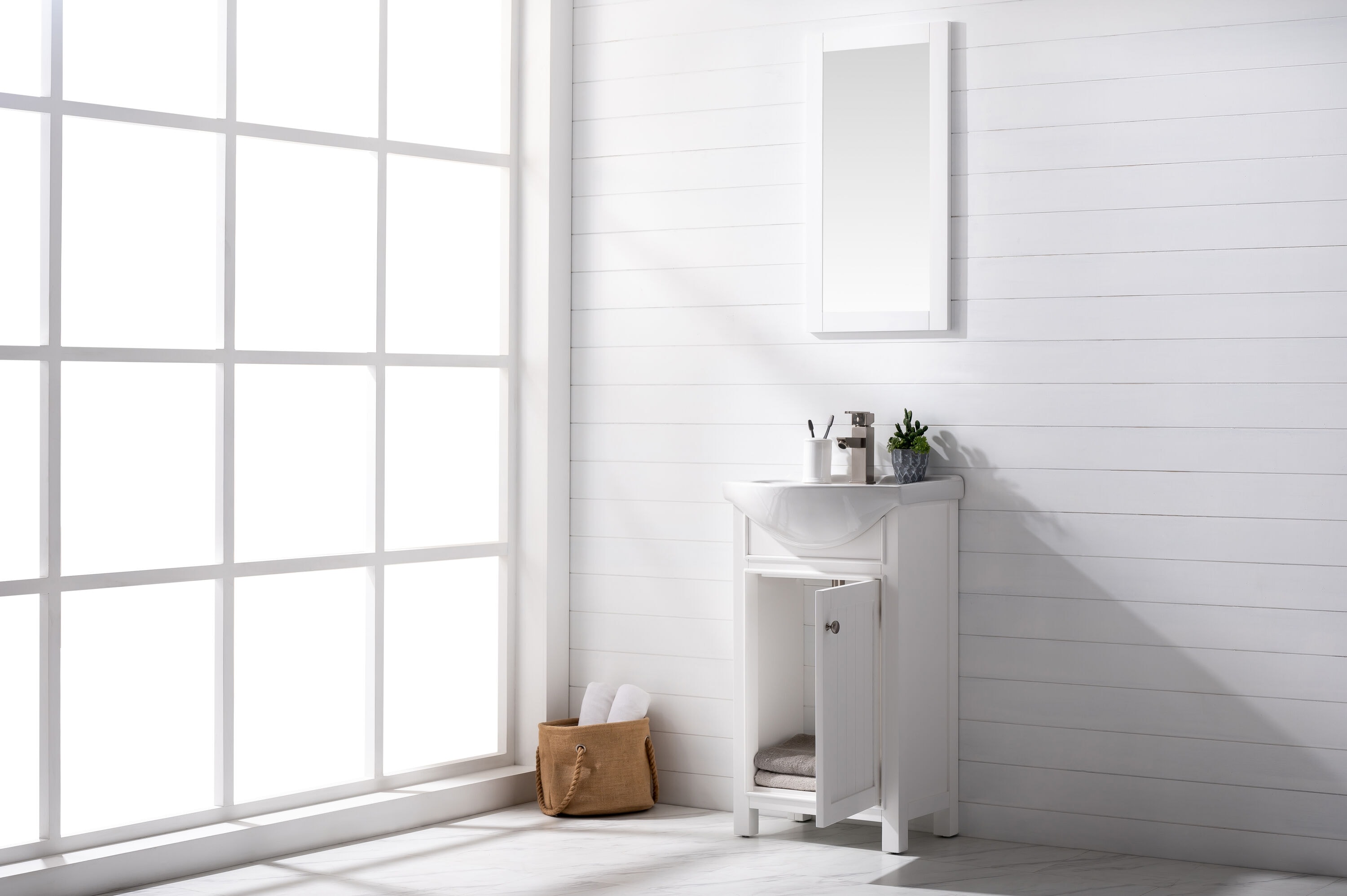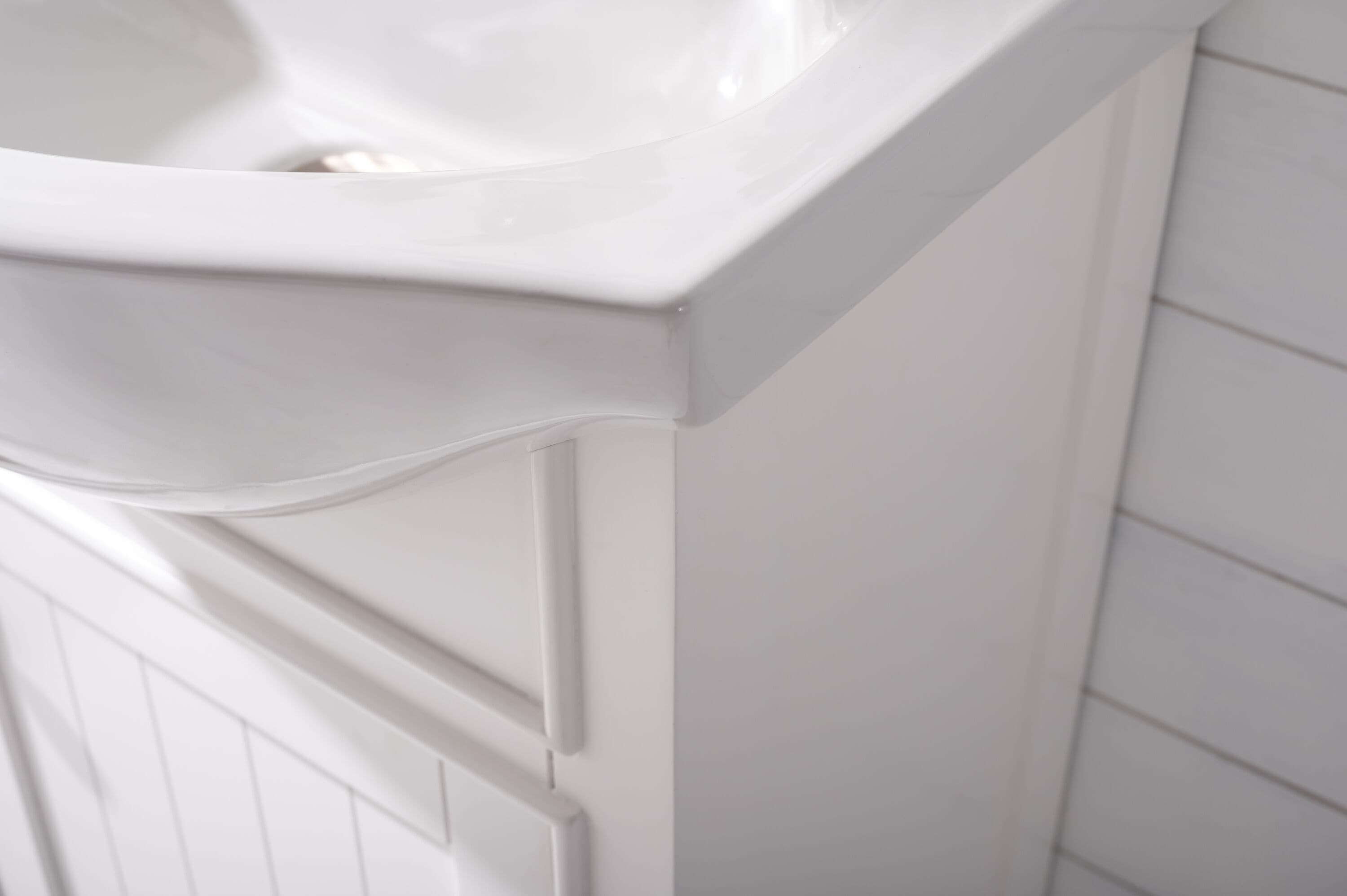 The Marian 20 in. single sink vanity by Design Element provides the perfect finishing touch to your bathroom remodel project. Featuring a solid wood frame, this vanity will maintain its beauty and functionality year after year. The porcelain countertop and integrated sink with overflow perfectly matches the styling of the cabinet, and is extremely simple to maintain. Opening the soft closed door reveals an ample storage space. The included brushed finished hardware provides the perfect finishing touch to the white cabinet. Faucet and drain are not included.