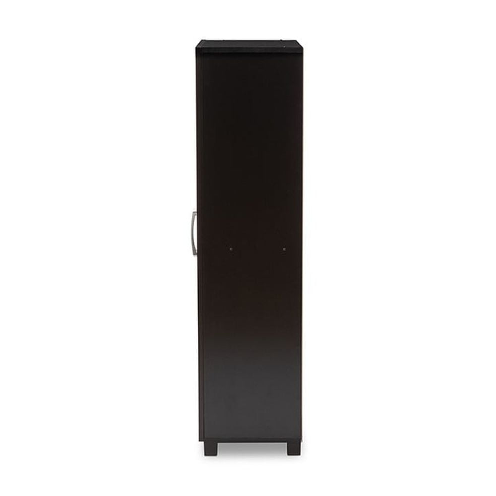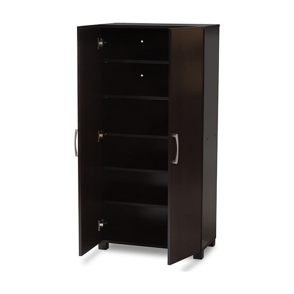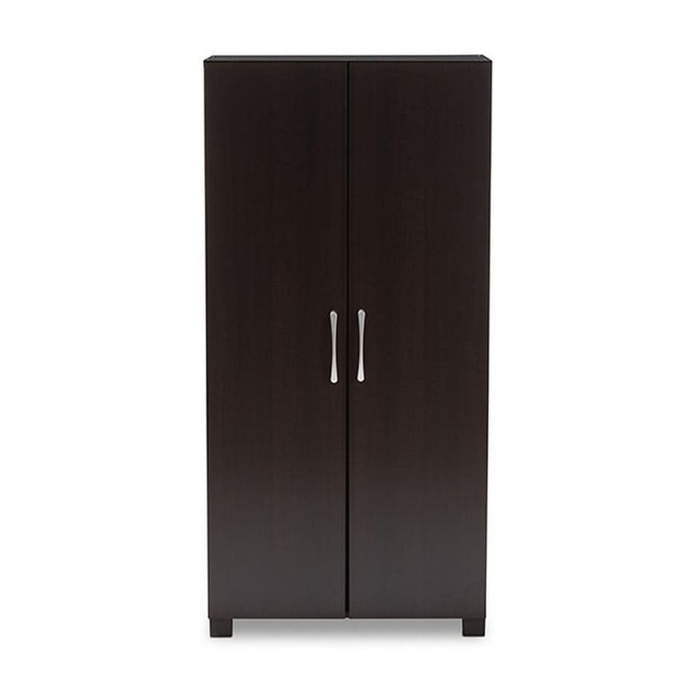 Marine Modern and Contemporary Wenge Dark Brown Finished 2-Door Wood Entryway Shoe Storage Cabinet Stylish and compact, the Marine cabinet is the solution to efficient shoe storage. Constructed from engineered wood, the Marine showcases an elegant wenge dark brown finish. Two doors conceal six shelves with storage space for up to 12 pairs of shoes. Circular cut-outs on the back of the cabinet enable air circulation and prevent mold growth on your shoes. Silver PVC door handles and black PVC legs complete the look. The Marine cabinet is made in Malaysia and requires assembly. Specifications: Engineered wood construction Wenge dark brown finish Six (6) shelves provide shoe storage for 12 pairs of shoes Cut-outs on back provide ventilation and deter mold growth Silver-finished PVC handles Black PVC legs Assembly required