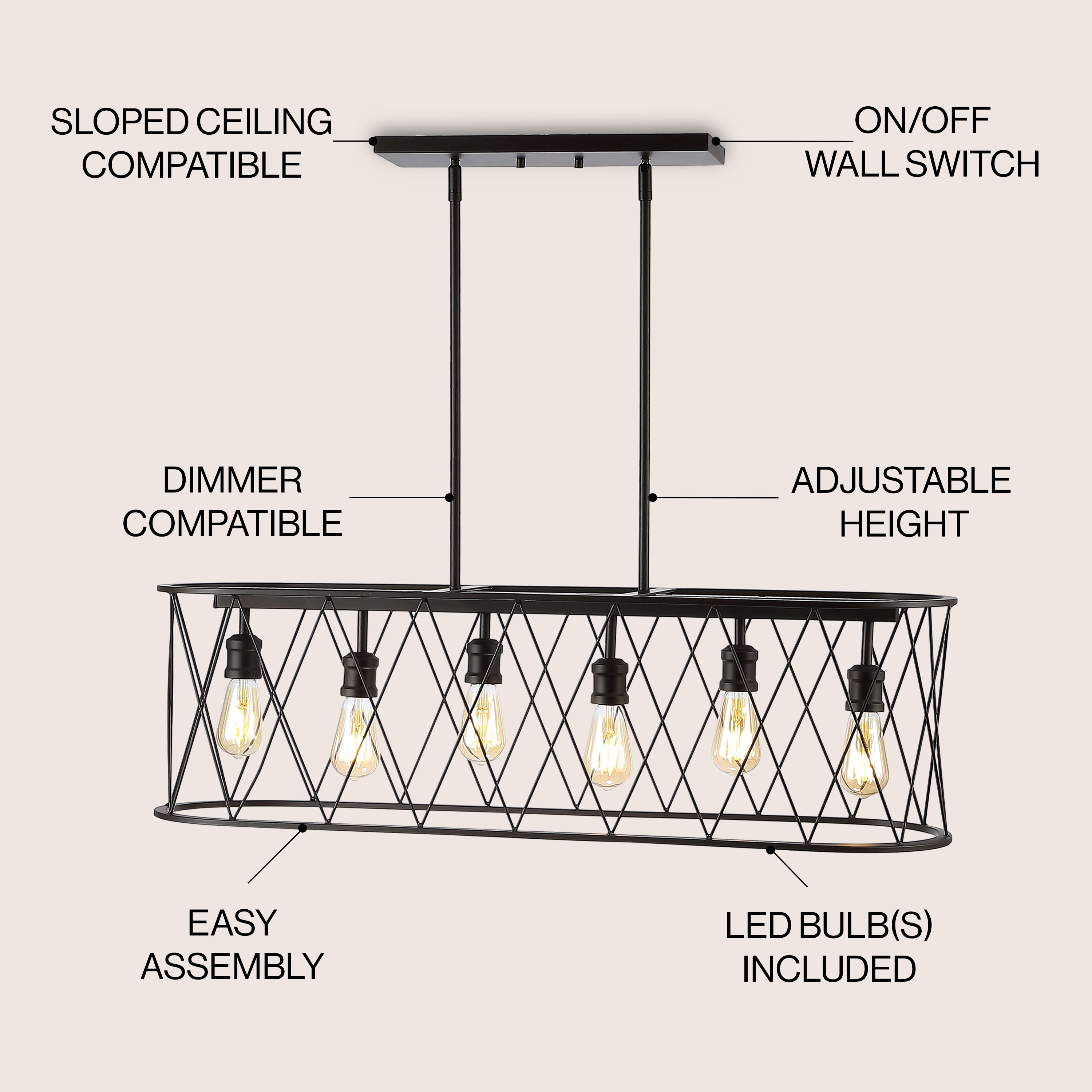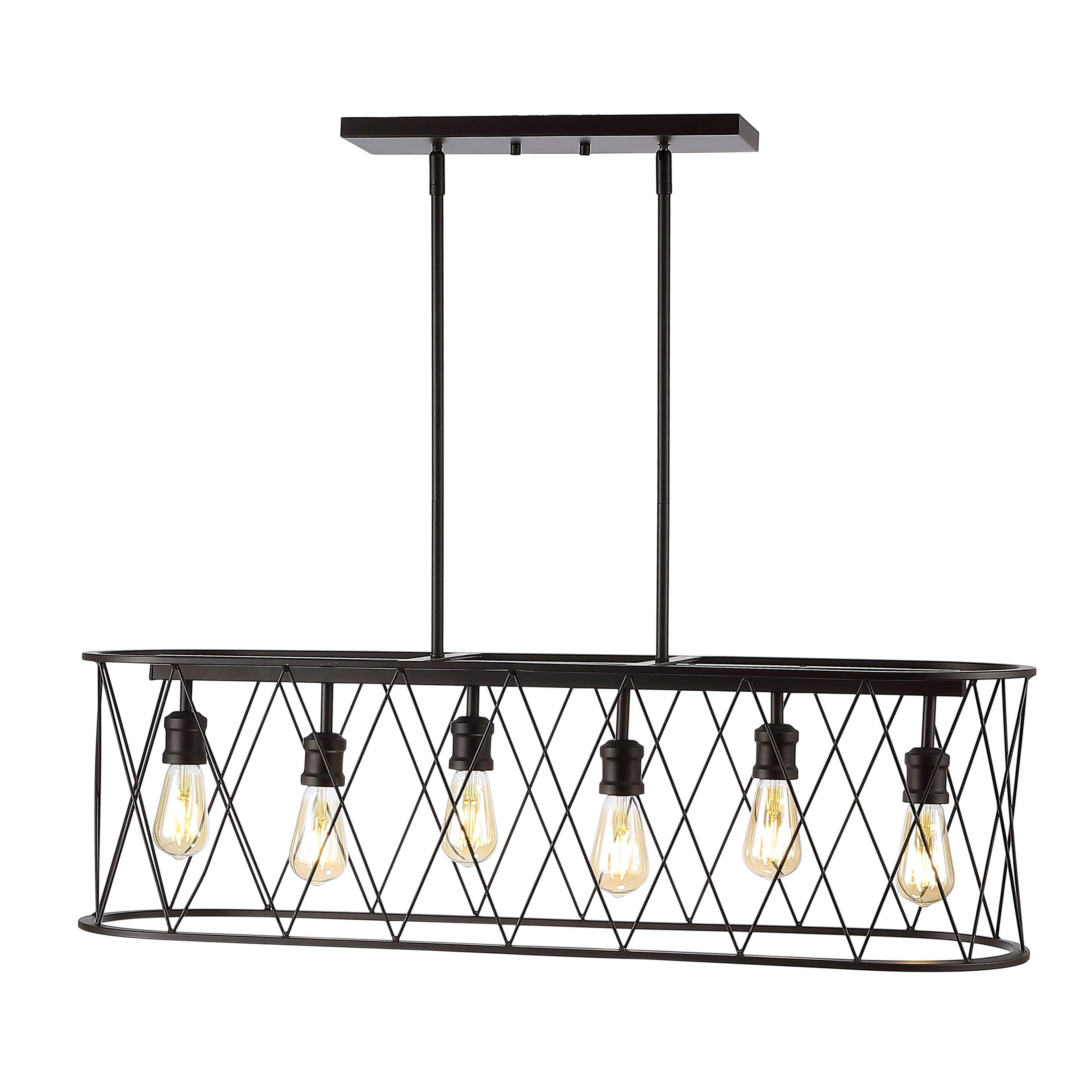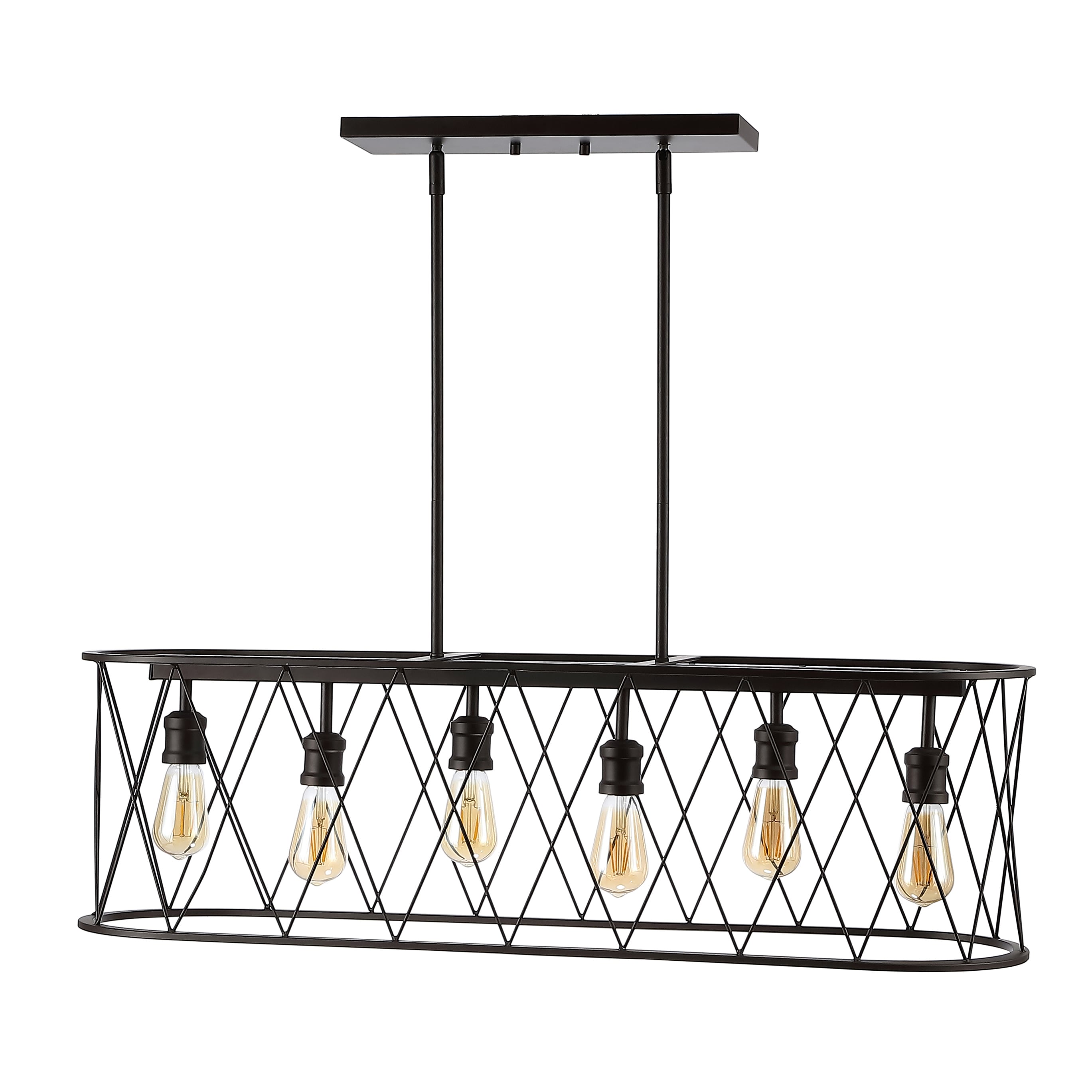 This long, oval pendant is ideal for your modern farmhouse, rustic kitchen or industrial interior design. Features six Edison-style LED bulbs inside a black-bronze metal diamond-patterned basket shade. The linear design is sized for a kitchen island, or hang it over a rustic dining table.