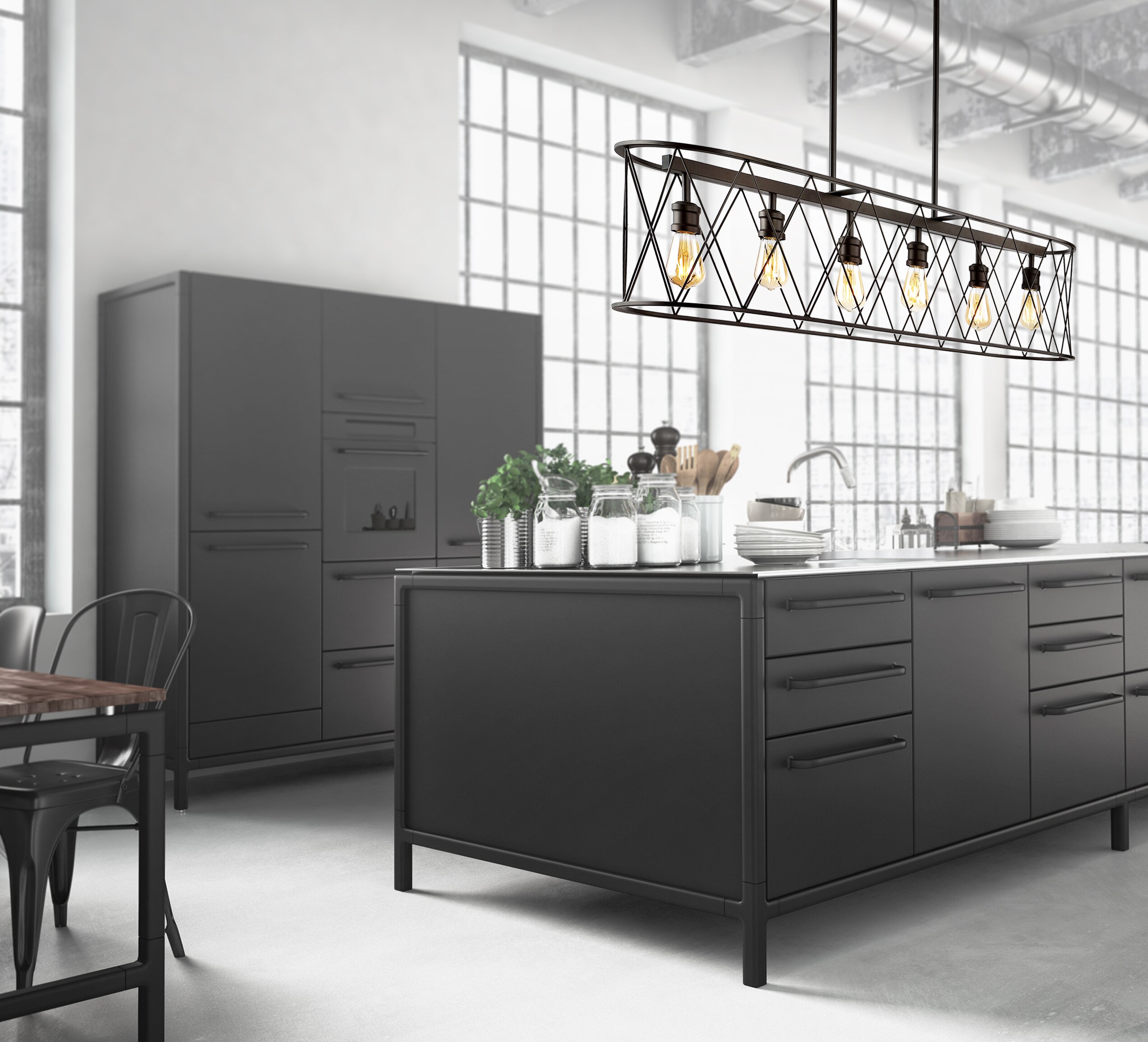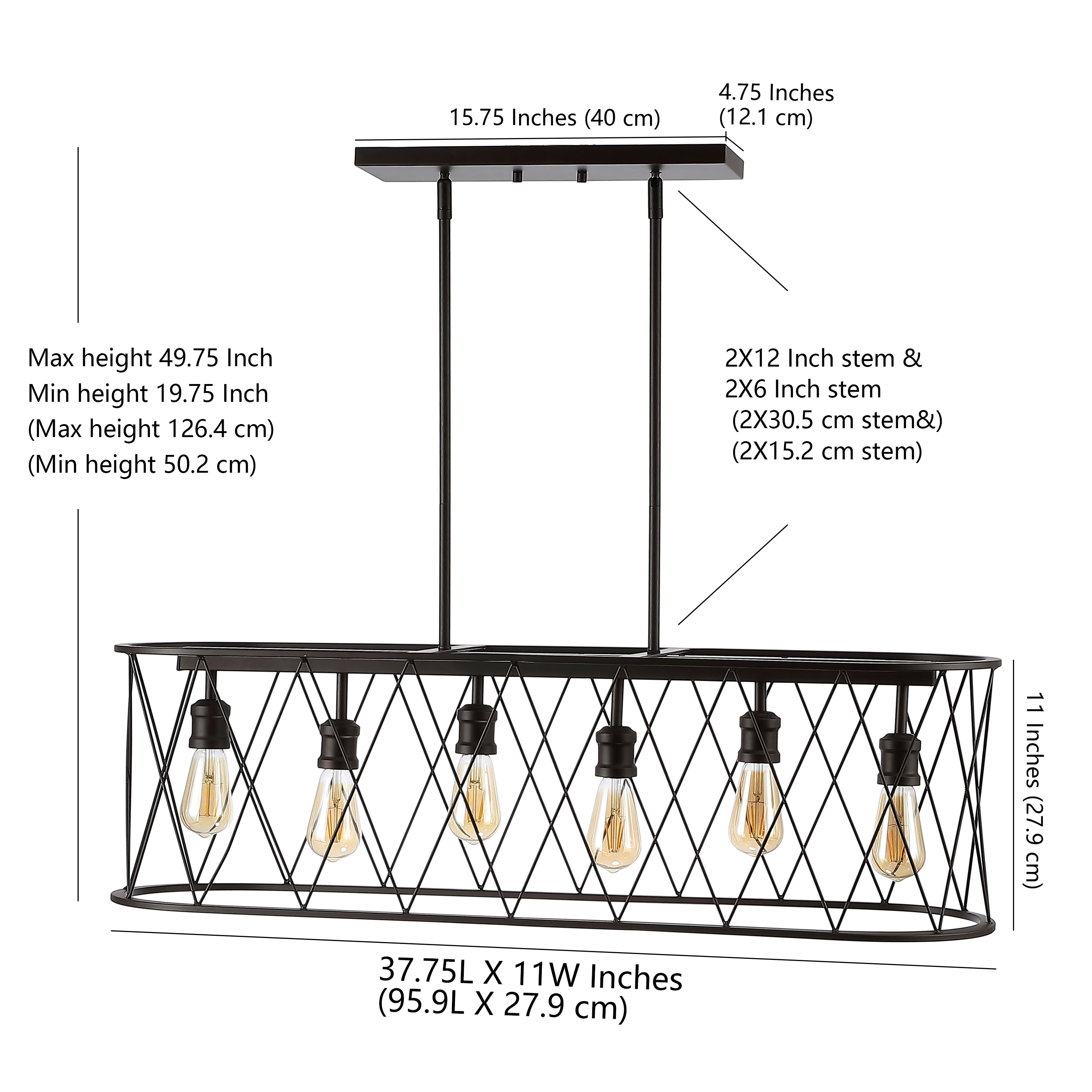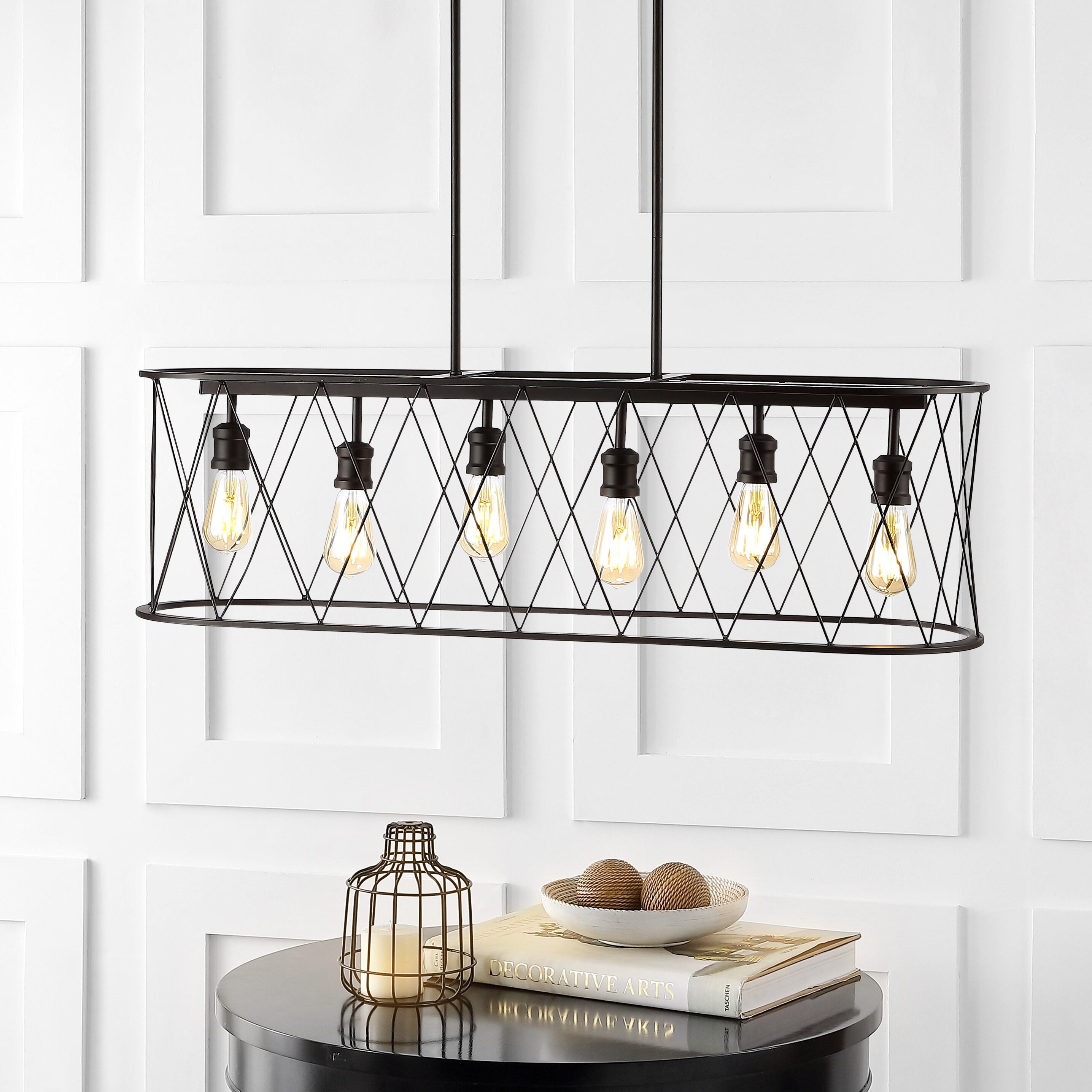This long, oval pendant is ideal for your modern farmhouse, rustic kitchen or industrial interior design. Features six Edison-style LED bulbs inside a black-bronze metal diamond-patterned basket shade. The linear design is sized for a kitchen island, or hang it over a rustic dining table.