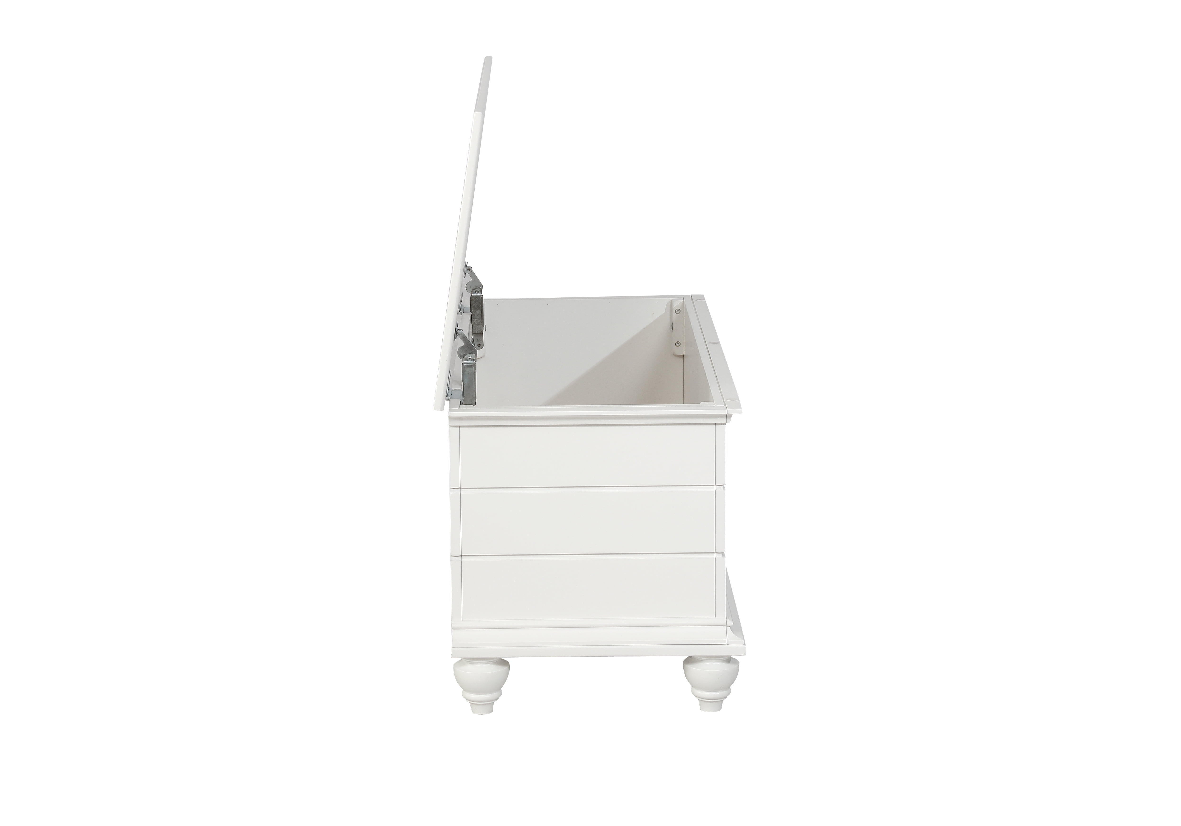 Beautiful white finish Rubberwood, MDF with paint on outside, Cedar veneer on inside Features shiplap siding, turned legs and decorative molding Farmhouse or coastal design style Top opens wide to reveal ample storage space Child safe hinges and breath holes Some assembly required Assembled Dimensions: 40.5″ W x 17.5″ D x 19″ H Weight Capacity: 275 Ships in one box