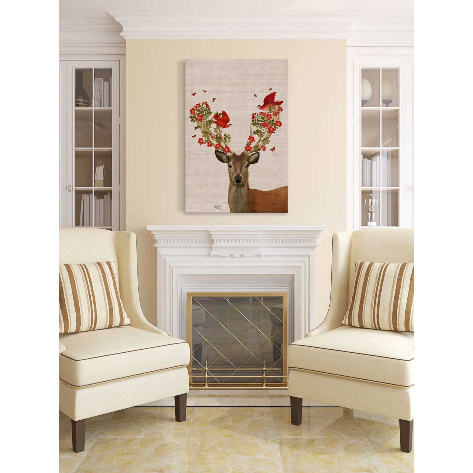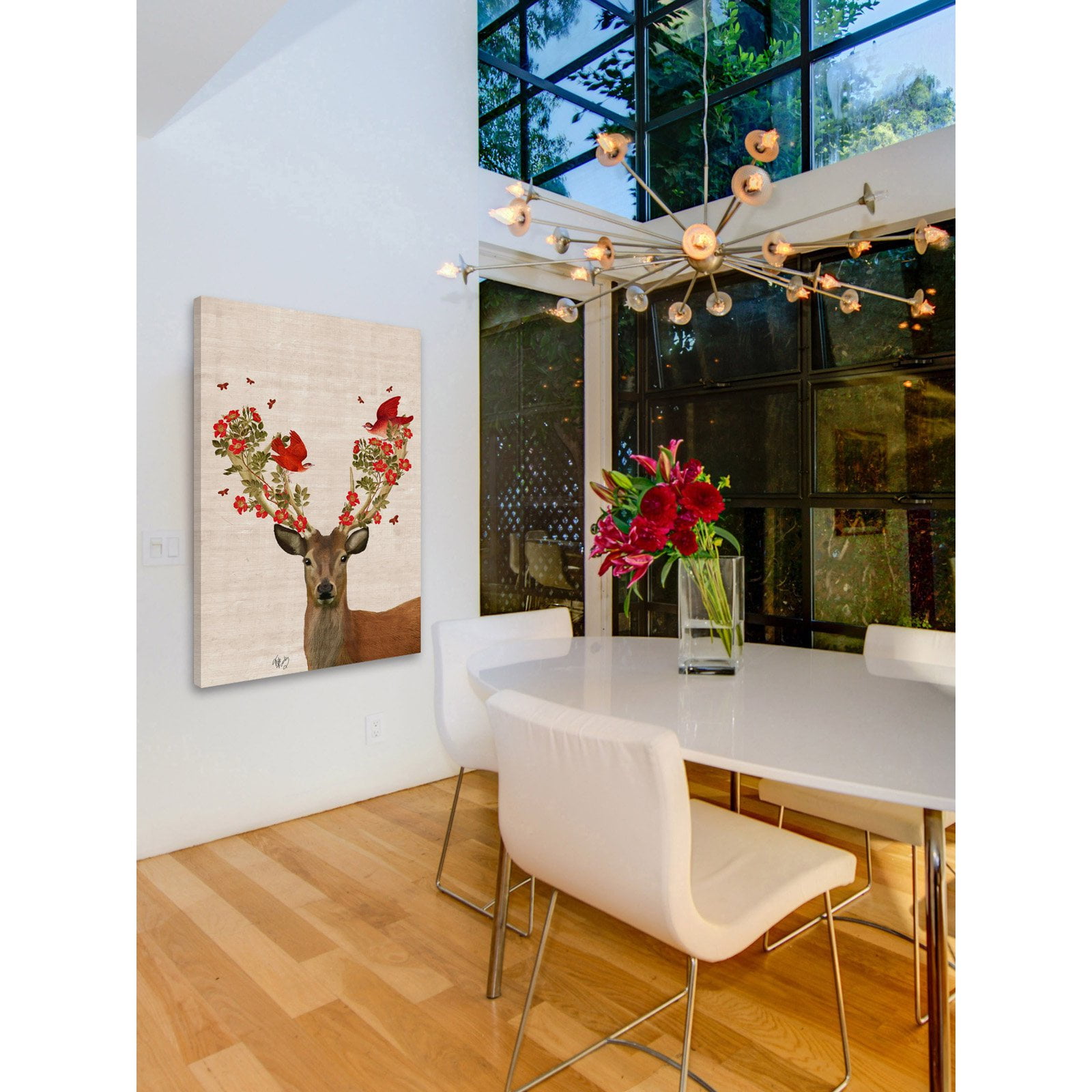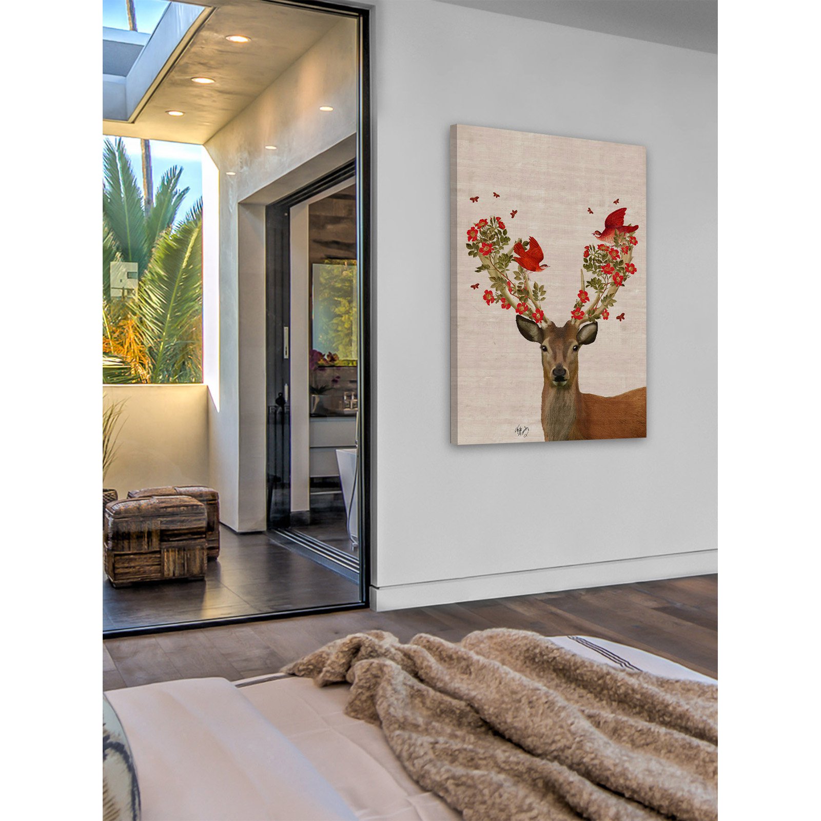 Select an available size For indoor use Deer with bright red birds and flowers on antlers Crafted of canvas and non-warping wood Professionally hand-stretched