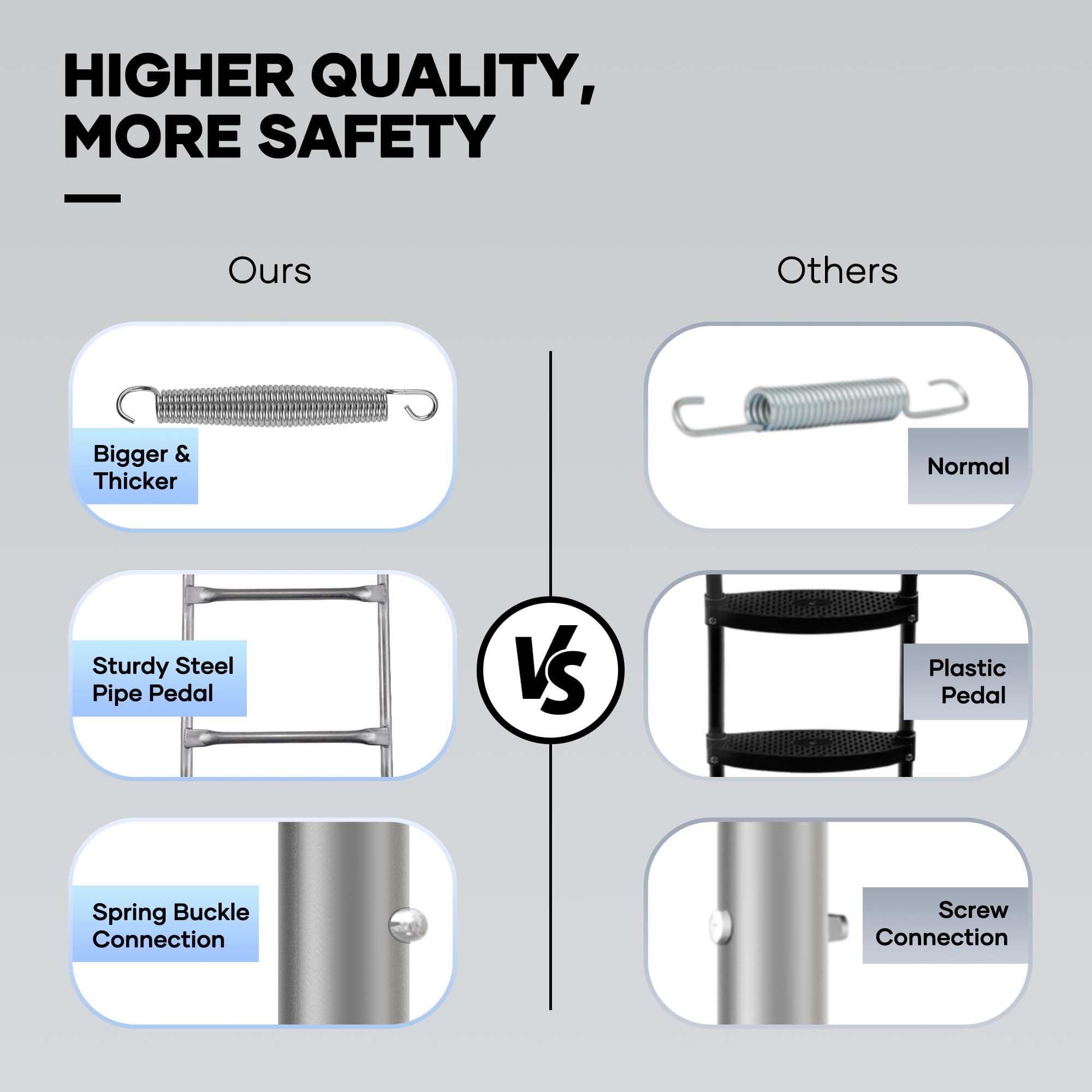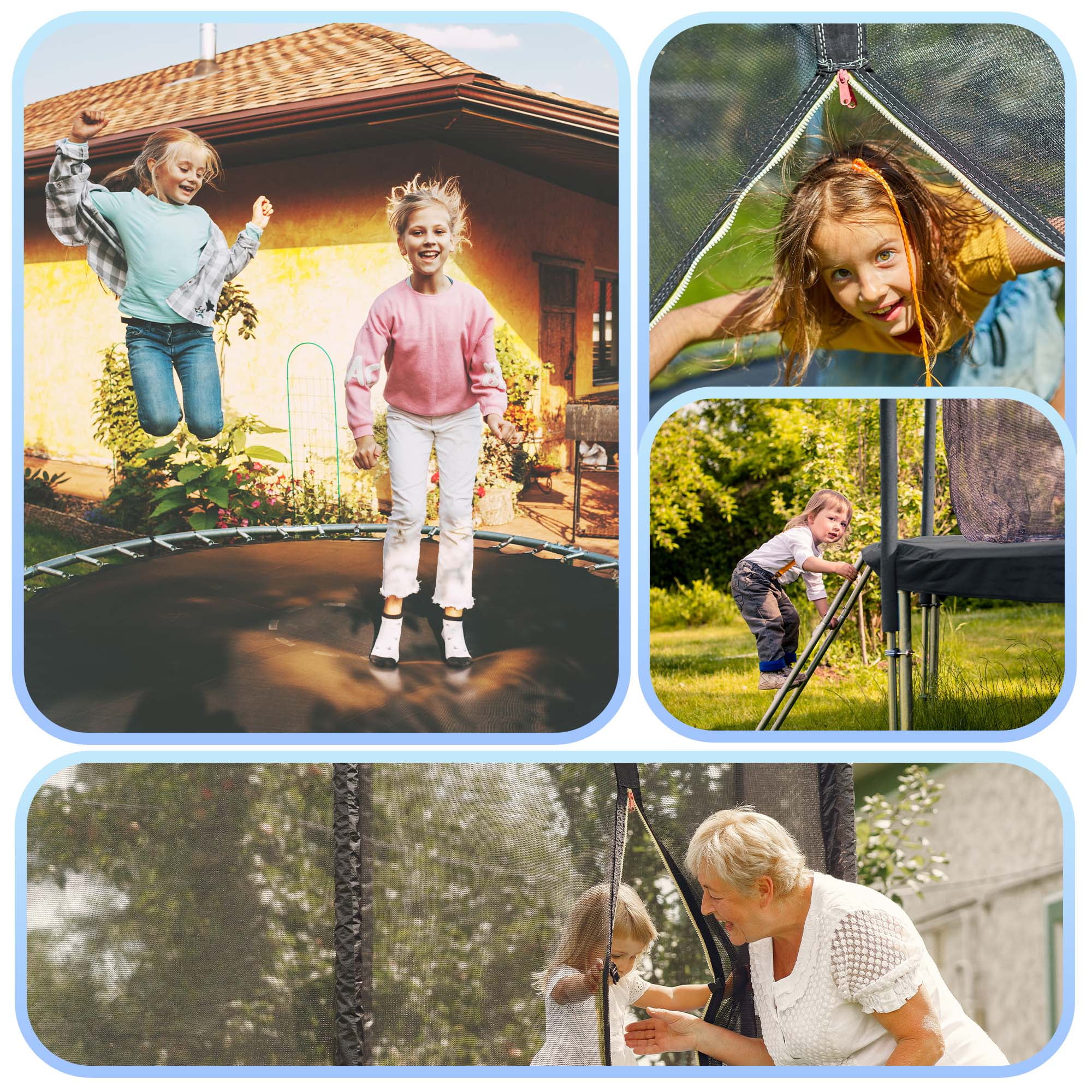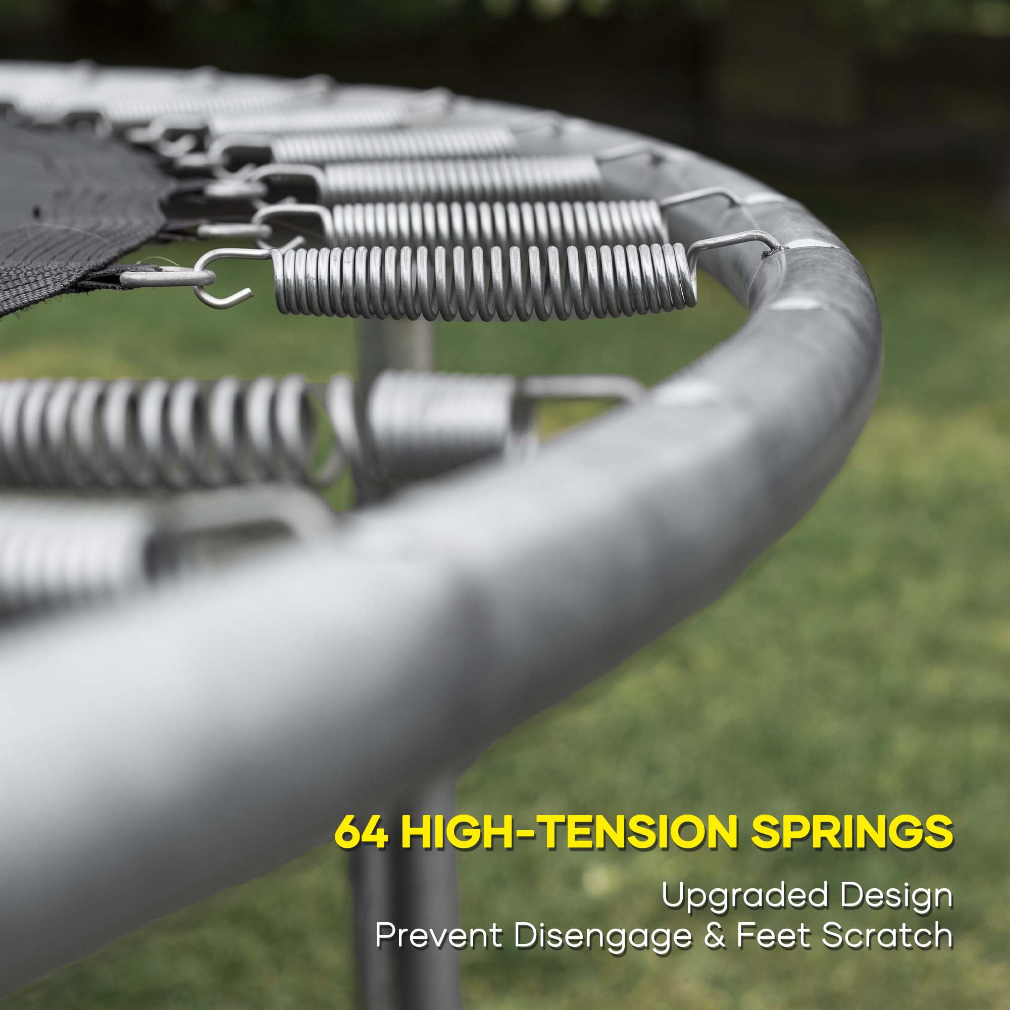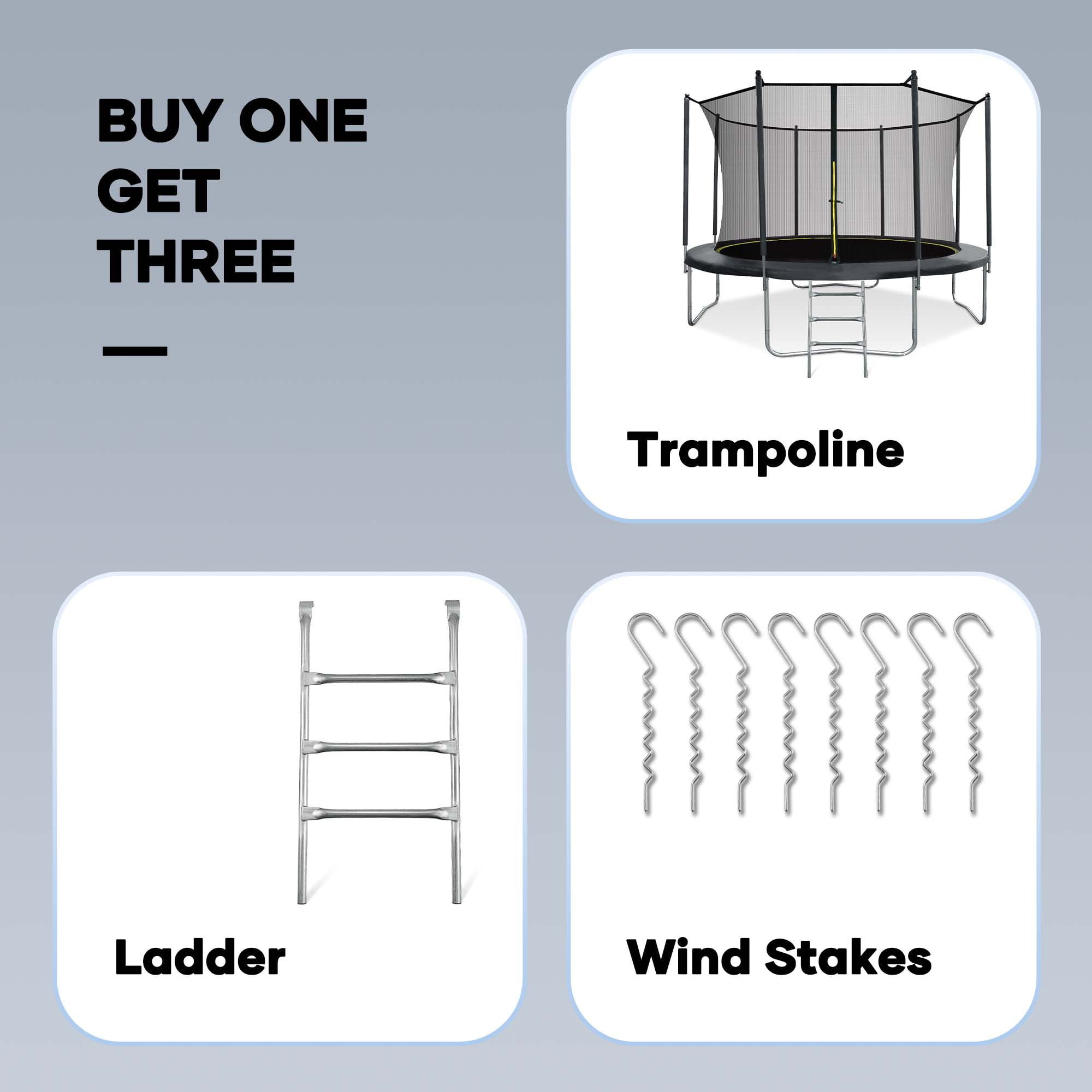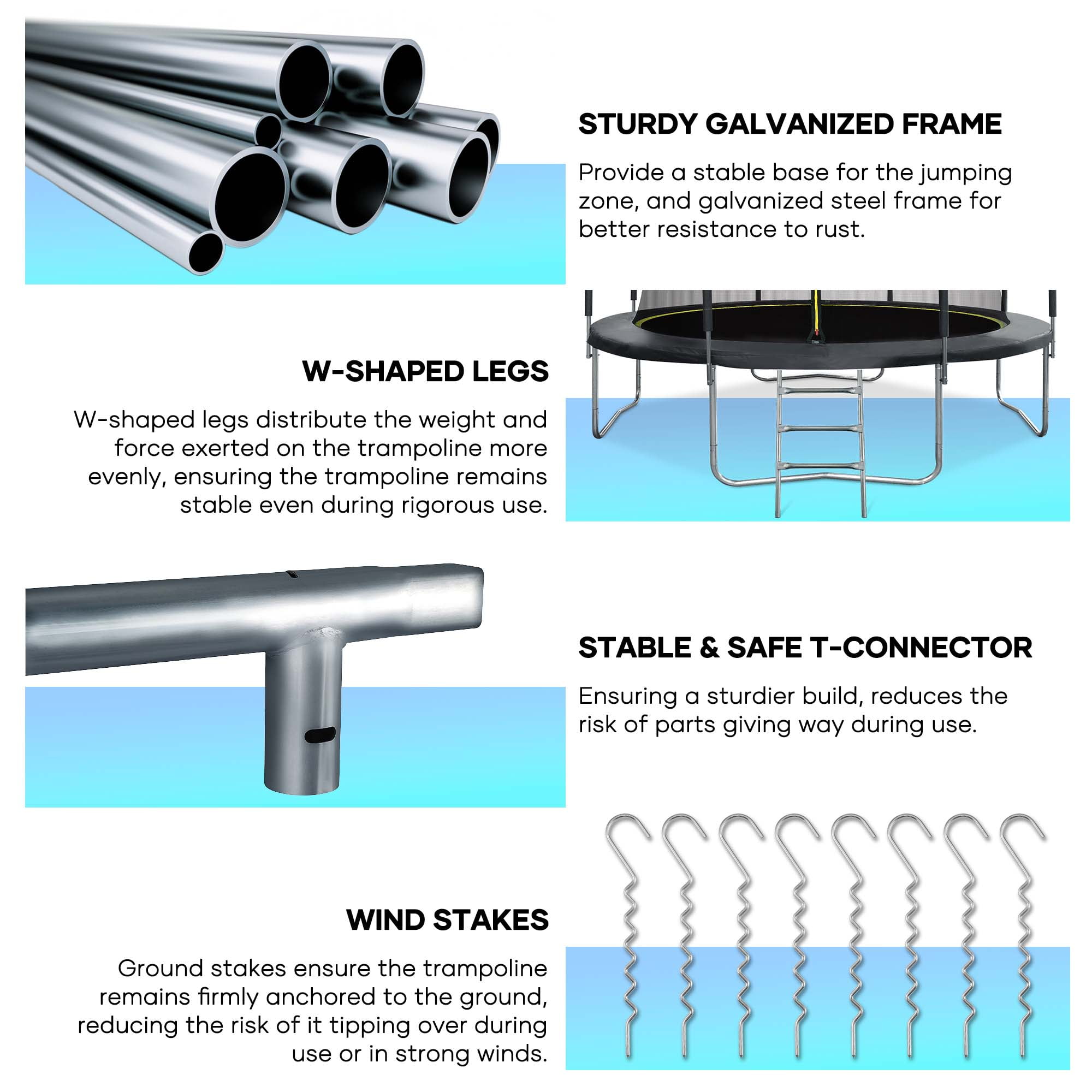 HEAVY-DUTY JUMPING PAD & SPRINGS: MARNUR 10 FT trampoline is wrapped in 64 galvanized drum springs(plus 2 extra springs), providing a strong elasticity for kids to exercise and have fun. The trampoline for kids features a fully galvanized steel frame for better resistance to rust and corrosion. SAFETY ENCLOSURE NET: The trampoline is made of environmental PE. The safety enclosure net for this trampoline eliminates gaps between the enclosure net and the jumping surface, protecting children from potential pinch points and openings. All our trampolines are tested for safety and durability.U- SHAPED STEEL LEGS:4 U-shaped steel legs at the bottom of this trampoline ensure its stability during use. No matter indoor or outdoor, the 8 contact points increase friction and help the trampoline maintain its position. It is recommended to place a rubber mat underneath to avoid shifting if you place it on concrete when using MARNUR trampoline. EXTRA WIND STAKES PROVIDE MORE STABILITY: Includes additional wind stakes to keep your tent firmly anchored—even in gusty weather. Perfect for added peace of mind during outdoor adventures. EASY ASSEMBLY: Our backyard trampoline includes a steel frame, enclosure net, spring cover pad, jumping mat, ladder, and all the installation tools you need. All parts including the hardware of the 10 FT trampoline are listed and numbered in the instruction. Average assembly time: 1 hour for 2 people. You can also scan the QR code in the user manual for the detailed installation video.