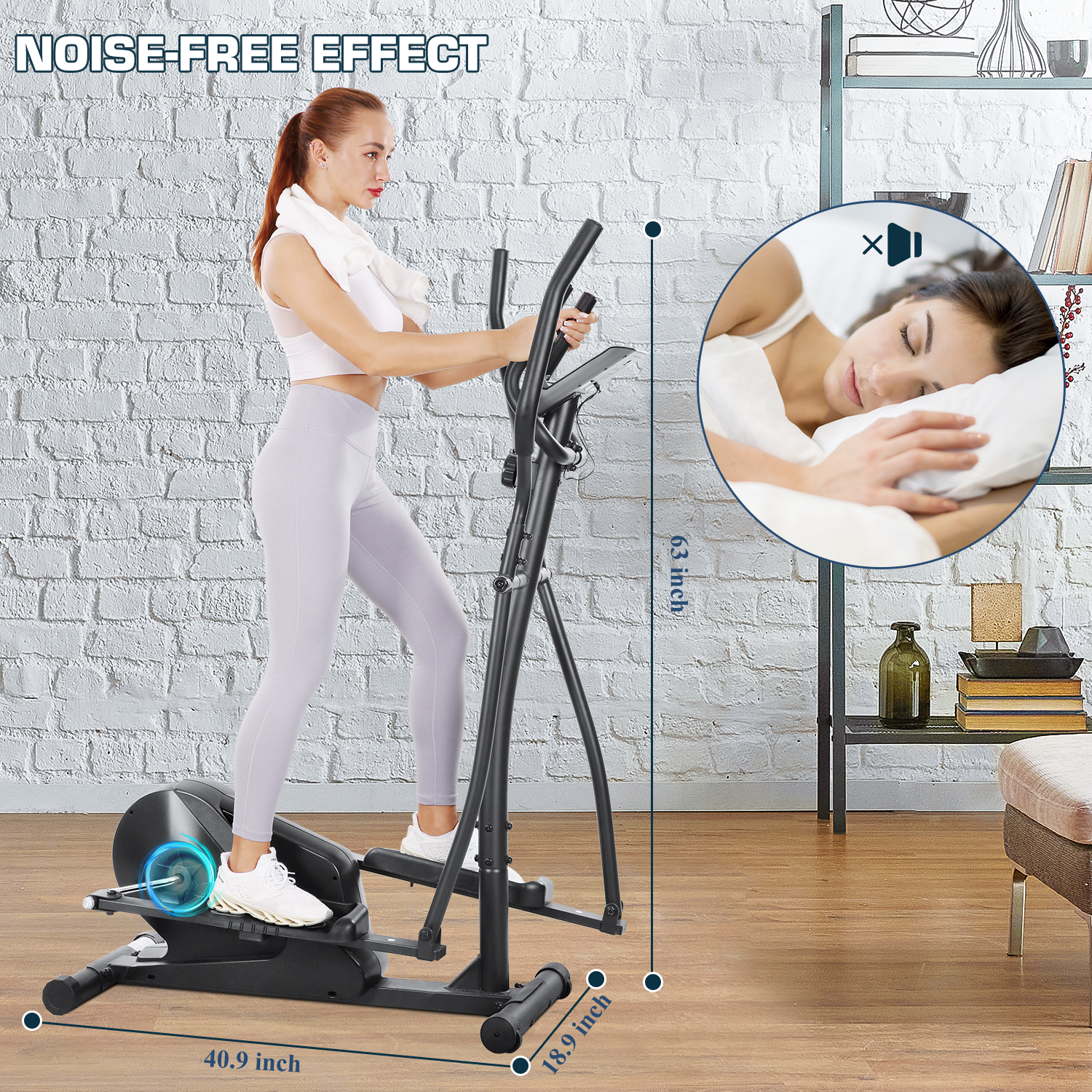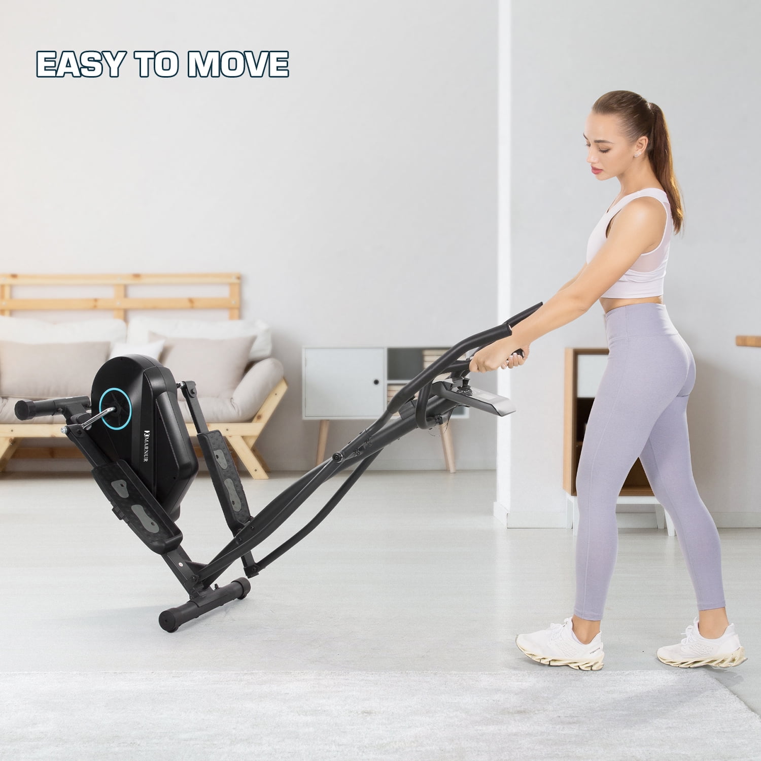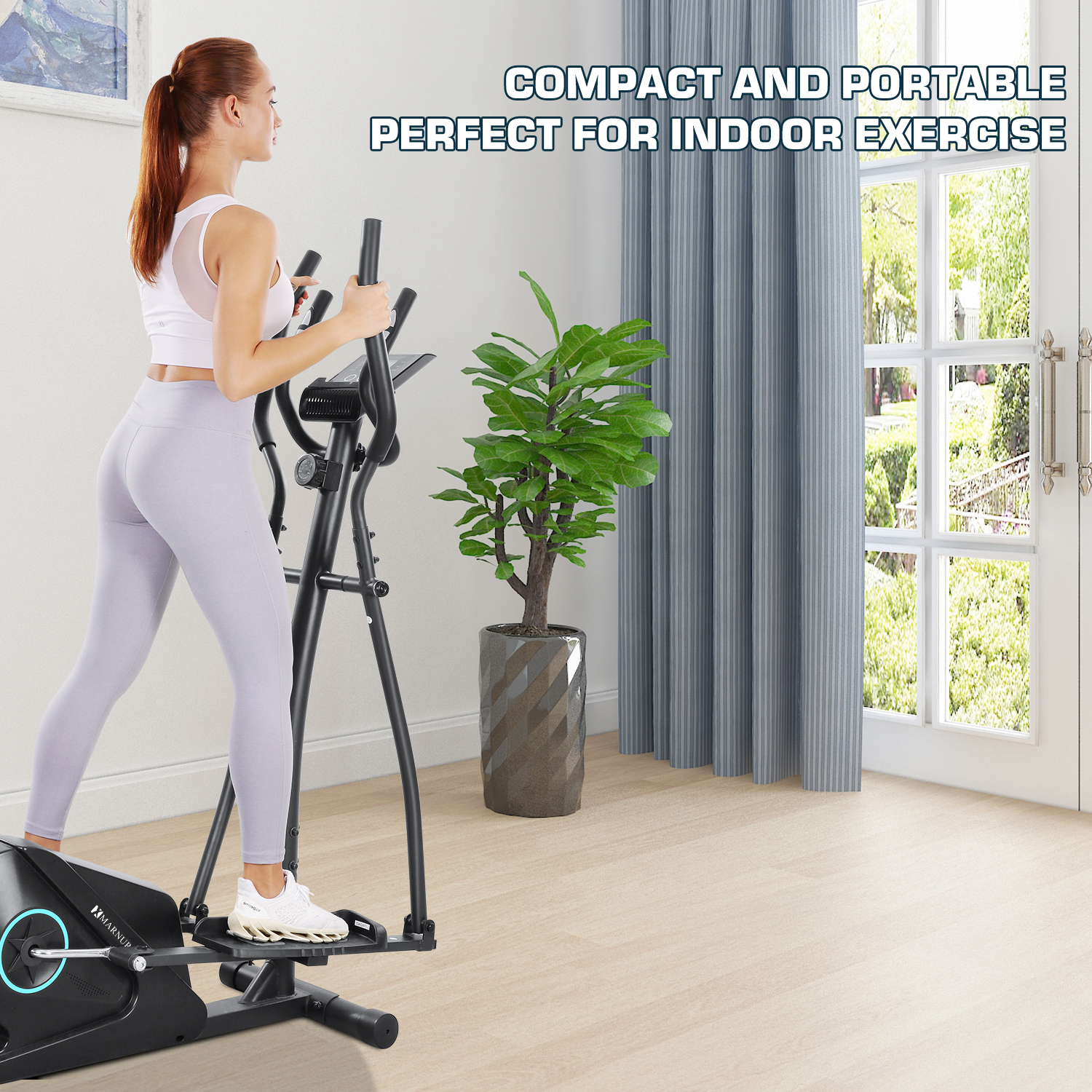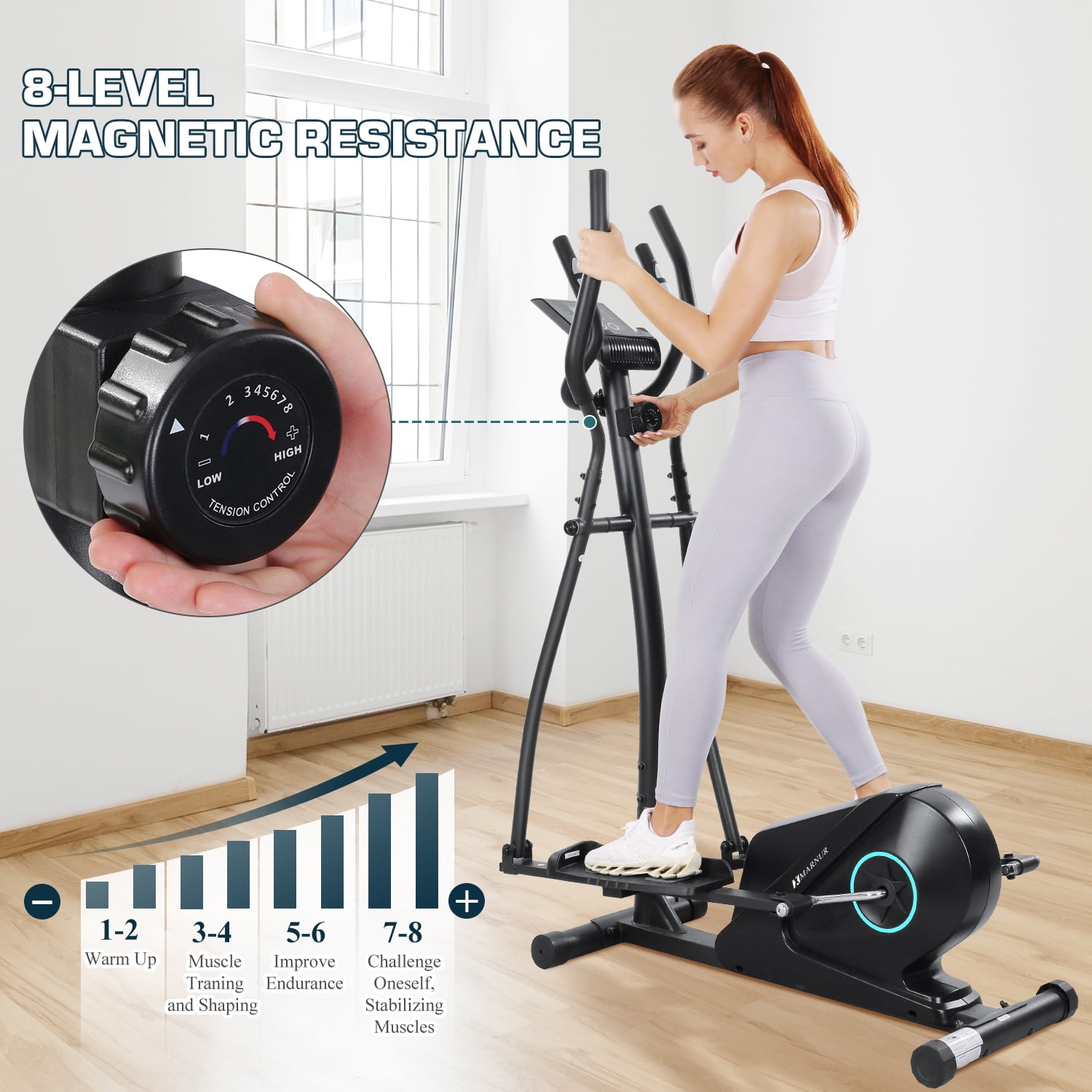 Marnur Elliptical exercise machine provides low-impact full-body exercise, ideal for joint protection and comprehensive fitness benefits. With adjustable resistance levels, elliptical caters to various fitness levels, making it a versatile piece of equipment suitable for home use. Key Feature 8-Level Resistance: Elliptical machine for home use can adjust 8 resistance levels according to your exercise plan to ensure your exercise is scientific. 1-3 level of an aerobic warm-up 4-6 level of cardio-pulmonary exercise 7-8 level of fat reduction and shaping. Quiet and Smooth: Elliptical machine is equipped with an 11 lbs super inertial flywheel, with uniform and stable resistance and smooth pedaling. What’s more, the magnetic flywheel has zero friction and no noise. Movable and Compact: Elliptical machine is designed with two front wheels, which allows you to move it conveniently. You can just tilt this elliptical to 45° and push it. LCD Monitor and Heart-Rate Detector and Device Holder: Elliptical is equipped with an LCD monitor, which displays time, speed, distance, calories, pulse, and odometer.