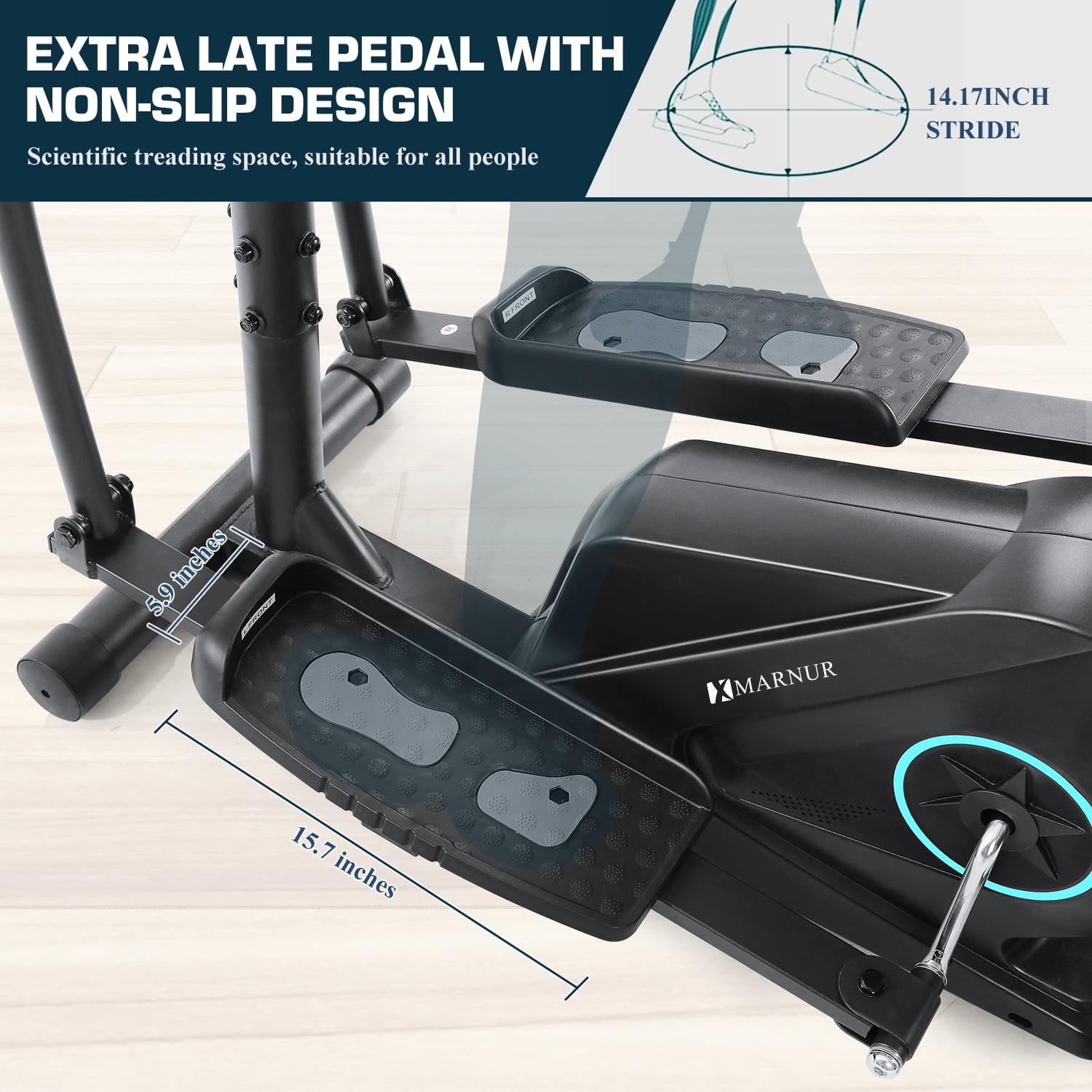 The dimension of MARNUR elliptical machine is 40.9 x 18.9 x 63 inches. The gross weight of the elliptical training machine is 72.17 lbs. The foot pedal size of the elliptical machine is 15.7 x 5.9 inches Elliptical Exercise Machine Stride Length: 14.17 Elliptical machine weight capacity is 286.6 lbs Package Content: 1 x Elliptical machine (Accessories and tools), 1 x User manual. Easy to assemble.