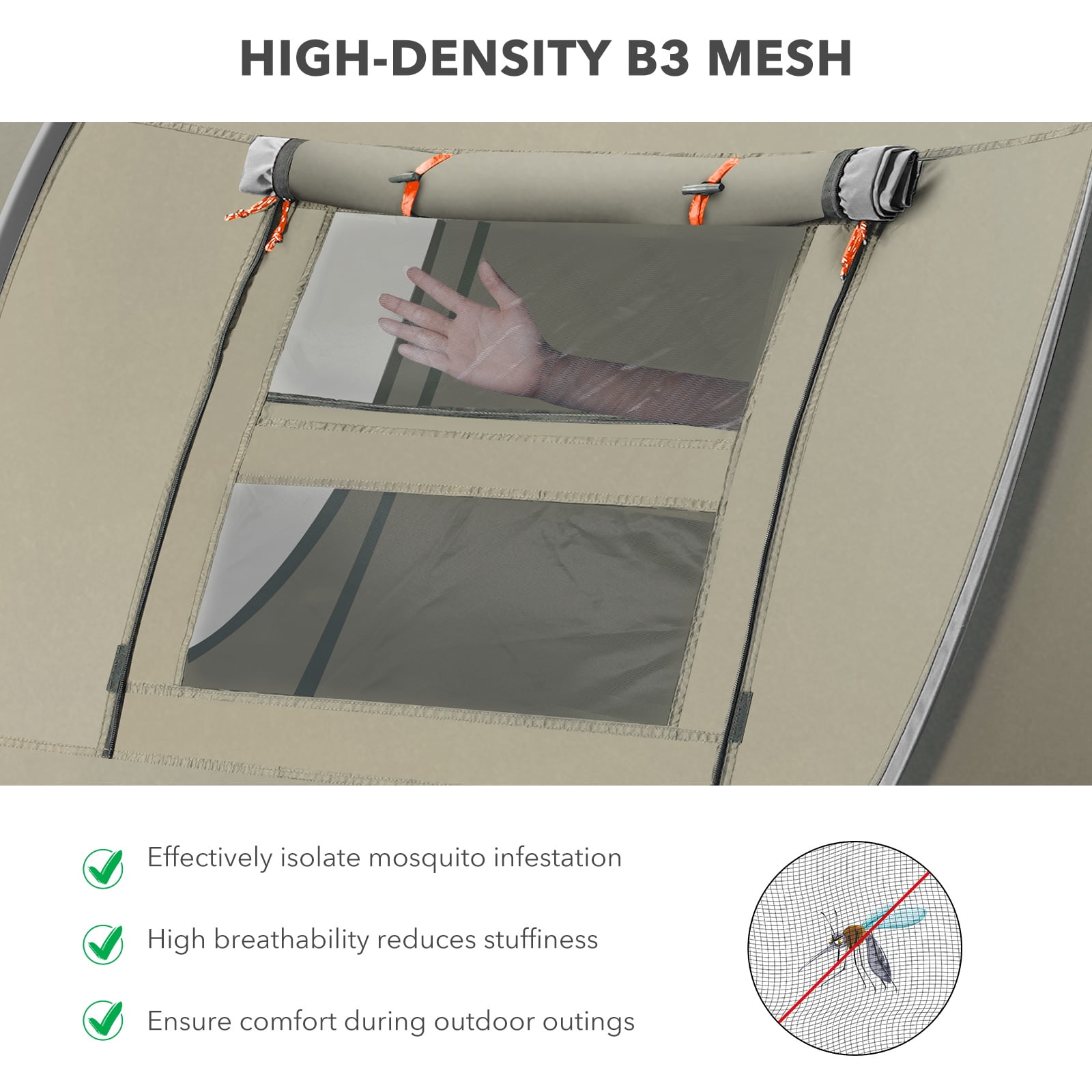 The camp tent features a 10-second setup. The instant design of the pop-up tent allows you to set up the inner tent within 1 minute. One person can set it up without any difficulty. PU taping for both rainfly seam and inner tent seam, PE Tube floor with welded corners, which keep the inside of the instant tent dry during light rain. You can connect the electrical cord easily, and the port of the instant camping tent can be fully closed when not in use. Includes tent stakes, carry bag, mud mat, gear pockets, and gear loft. The mesh roof and ground vent of the instant camp tent guaranteed much better ventilation compared to normal tents, this also minimizes the water condensing inside the tent at night.2 Side Huge Mesh Windows & Double Doors Two Side mesh windows on the left and right of the pop up tent allow for air circulation. With double doors on both the front and back of the pop up tent, it’s easy to step out from either side and provide enough airflow.