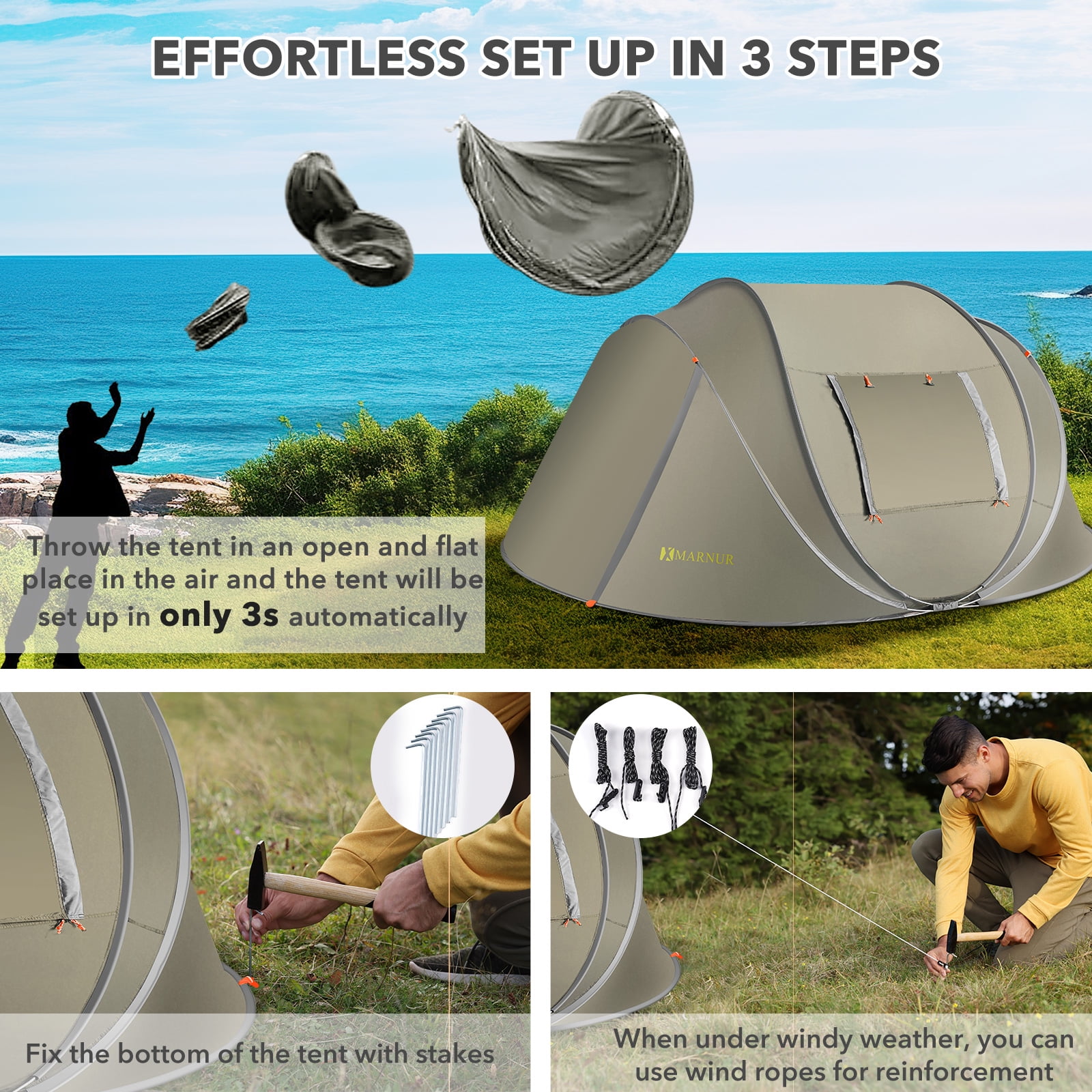 MARNUR Instant Tent 4-Person Camp Tent, Auto Setup Pop Up Tent, Pordable, Huge Door & Windows, Outdoor, Green