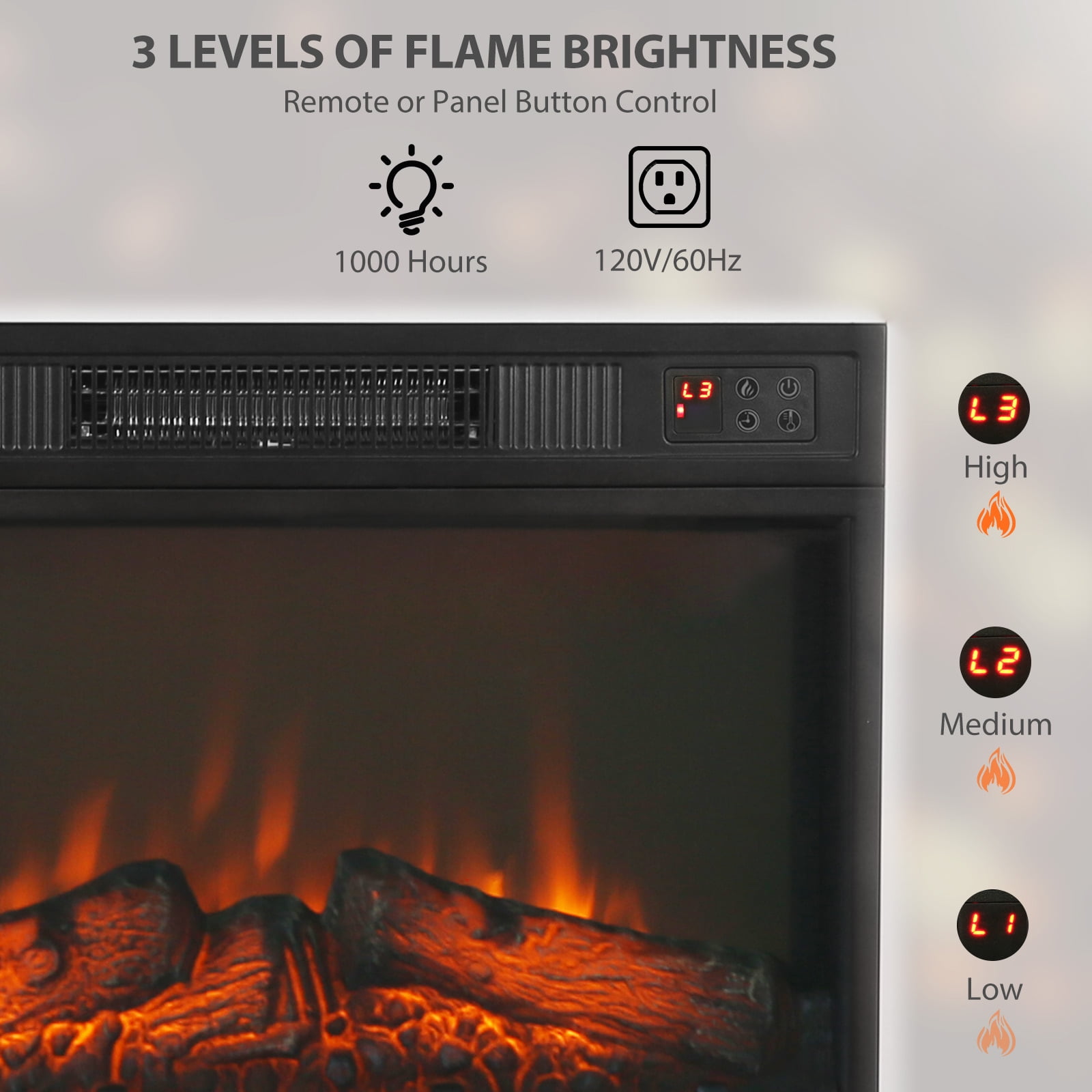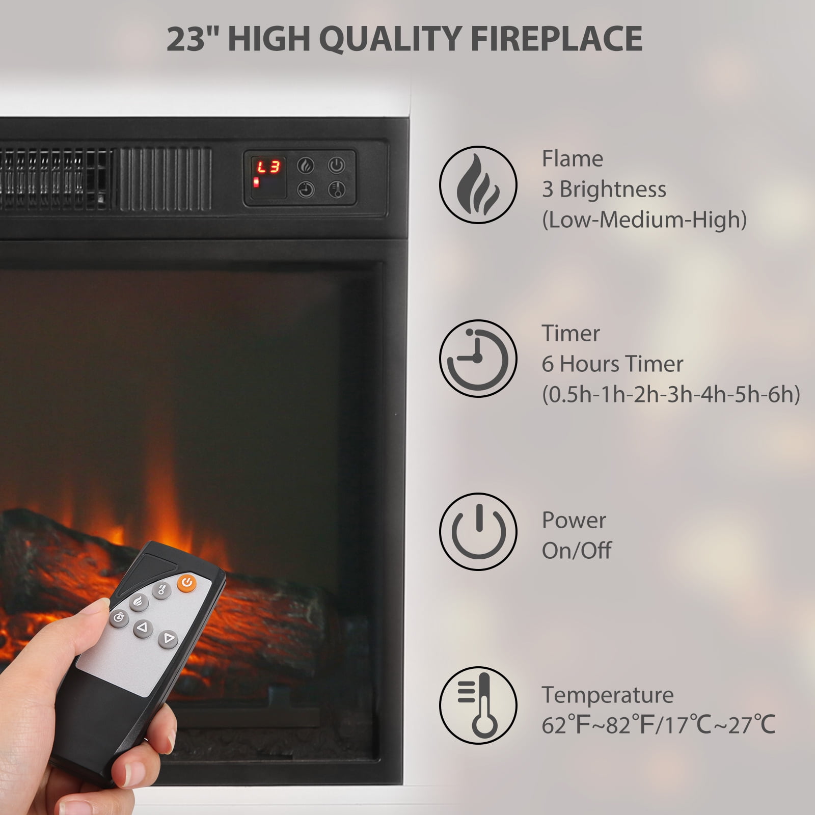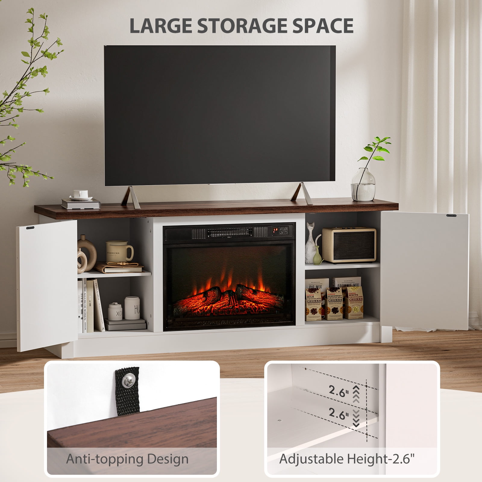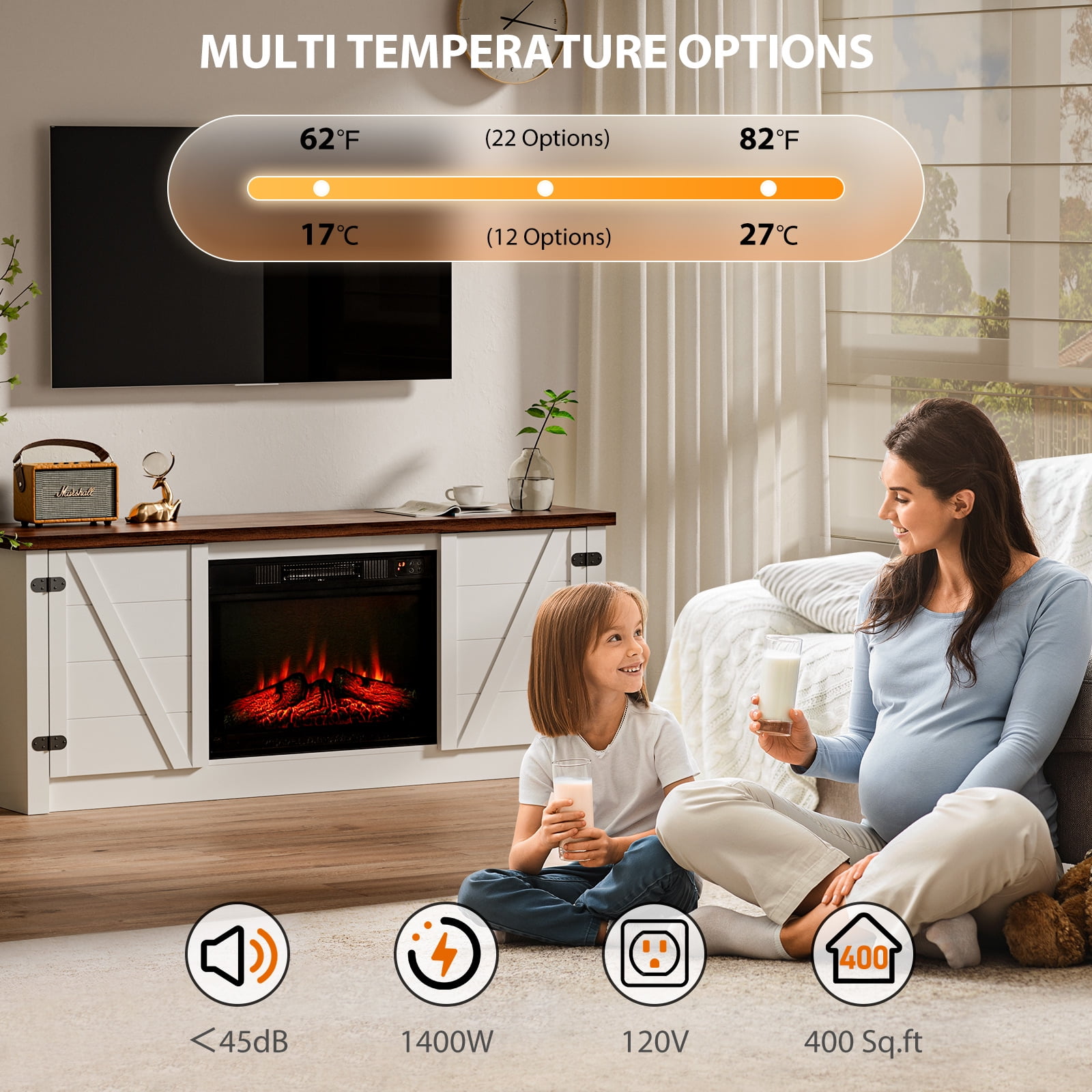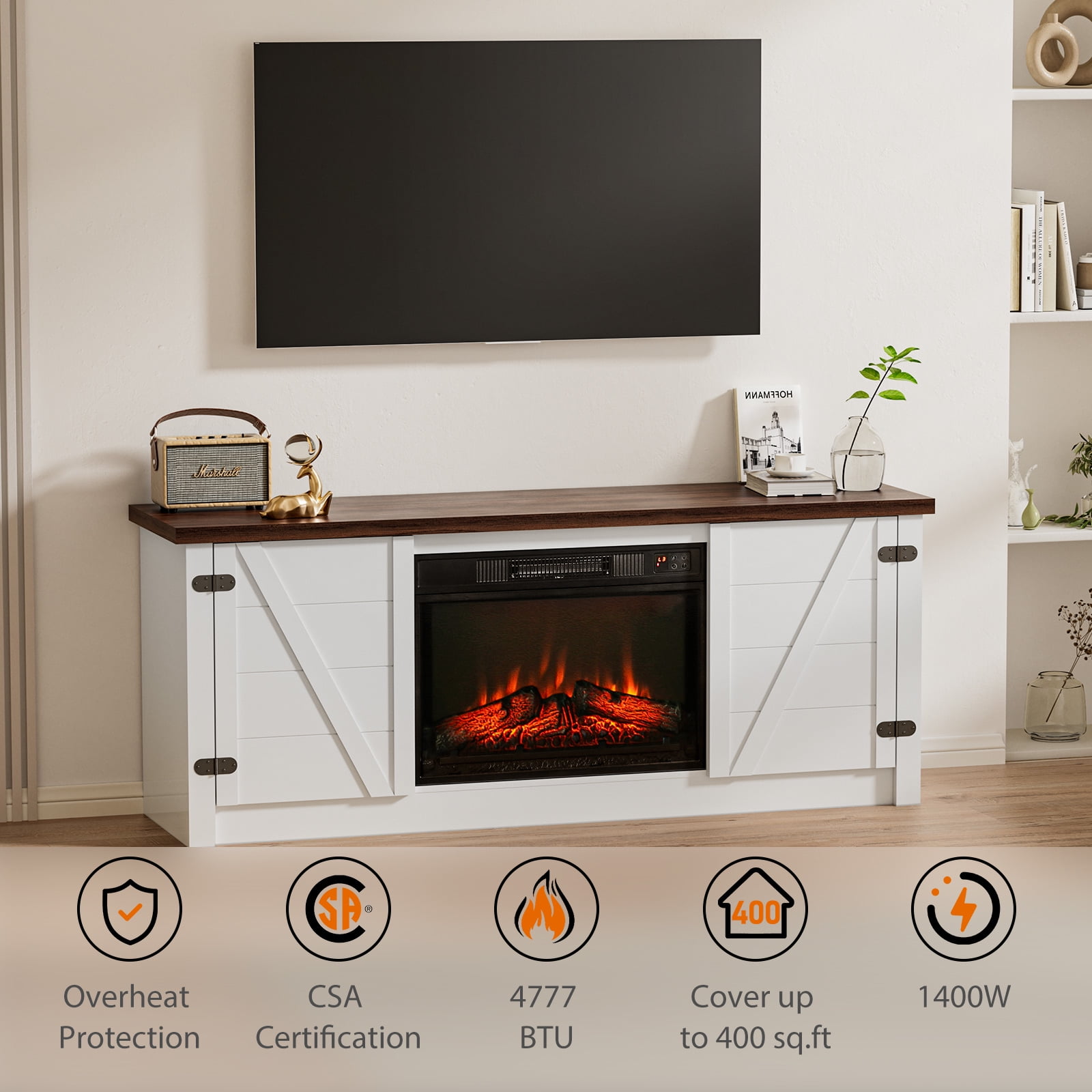 Elevate your home’s ambiance and functionality with the MARNUR Farmhouse Style Fireplace TV Stand, a perfect blend of rustic elegance and modern practicality. This versatile piece serves as both a stylish TV stand and a powerful heating solution, making it an essential addition to your living space. The MARNUR Farmhouse Style Fireplace TV Stand is more than just a piece of furniture—it’s a lifestyle upgrade. With its combination of rustic charm, ample storage, and efficient heating, this TV stand will enhance your living space in every way. Bring warmth, style, and organization to your home with this beautiful and functional piece. Specifications: For TV Stand Brand: MARNUR Style: Farmhouse Adjustable Shelf: Yes Number of Shelves: 2 Applies to: TVs up to 65″ Dimension: 59″ x 15.4″ x 23.7″ (L x W x H) For Fireplace Front Panel Dimension: 23″ x 17″ (L x H) Voltage: 120 V, 60 Hz Watts: 1400 Watts Timer: 7 Levels/6 Hours (0.5-1-2-3-4-5-6h) Maximum Output: 47770 BTUs Temperature Range: 62℉~ 82 ℉ Key Features: For TV Stand: Large storage space with 2 cabinets with door; 59″ wide tabletop fits TV up to 65 inches; Easy assembly; Adjustable Shelves; For Fireplace: Botton touch control & remote control; 3-level flame brightness with realistic 3D flame effects; High power output 4777BTU warms up 400sq.ft room; CSA and UL certificated; Integrated timer (0 – 6 hours)