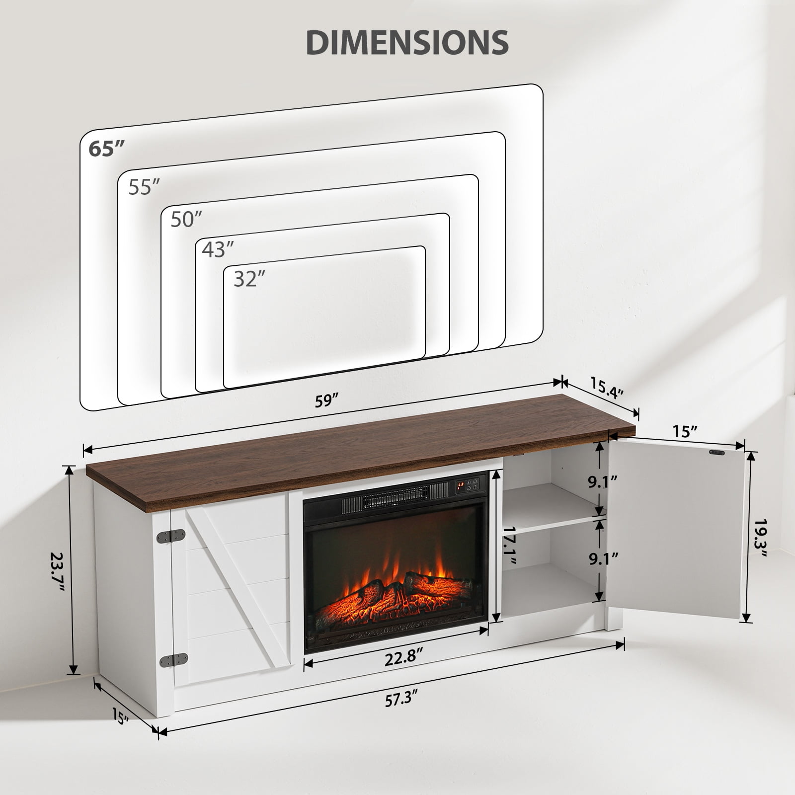 Farmhouse Style Fireplace TV Stand: The MARNUR Fireplace TV Stand captures the essence of farmhouse charm with its classic design, featuring a rich wood finish and clean lines that bring warmth and character to any room. The rustic appeal of this stand adds a touch of sophistication, making it the ideal focal point in your living room, bedroom, or entertainment area. Large Storage Space with 2 Cabinets with Doors: Designed with functionality in mind, this TV stand offers ample storage space to keep your living area organized and clutter-free. The two cabinets with doors provide concealed storage for media accessories, games, and other essentials, while the adjustable shelves inside allow you to customize the space to suit your needs. The spacious 59″ wide tabletop easily accommodates TVs up to 65 inches, providing the perfect platform for your home entertainment system. (Number of Shelves: 2) 23 Inch Electric Fireplace with Remote Control: The centerpiece of this TV stand is the built-in 23-inch electric fireplace, offering both style and functionality. The fireplace features realistic 3D flame effects with 3 levels of brightness, creating a cozy and inviting atmosphere in your home. Whether you prefer a subtle glow or a more intense flame, the adjustable settings allow you to customize the ambiance to your liking. Efficient Heating & Safety Features: The 1400W fireplace heater is not just for show—it provides efficient heating with a high power output of 4777 BTU, capable of warming up a 400-square-foot room. Certified by CSA and UL, this fireplace ensures safety and reliability. It offers both Fahrenheit and Celsius display options and can be controlled using the touch buttons or the handy remote control. The integrated timer allows you to set the fireplace to turn off automatically between 0 to 6 hours, and the temperature can be adjusted from 62°F to 82°F, giving you complete control over your comfort. Easy Assembly: The MARNUR Fireplace TV Stand is designed for easy assembly, allowing you to set it up quickly and efficiently. With a detailed, illustrated user manual, you can follow the step-by-step instructions to assemble your new TV stand without the frustration of complicated instructions.