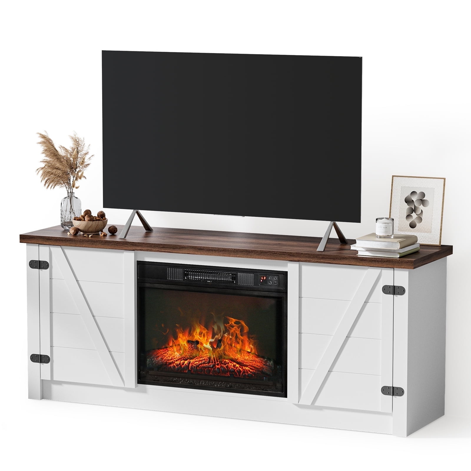 MARNUR Electric Fireplace TV Stand for TVs up to 65″, Farmhouse Entertainment Center with 2 Doors, Rustic Wood, White