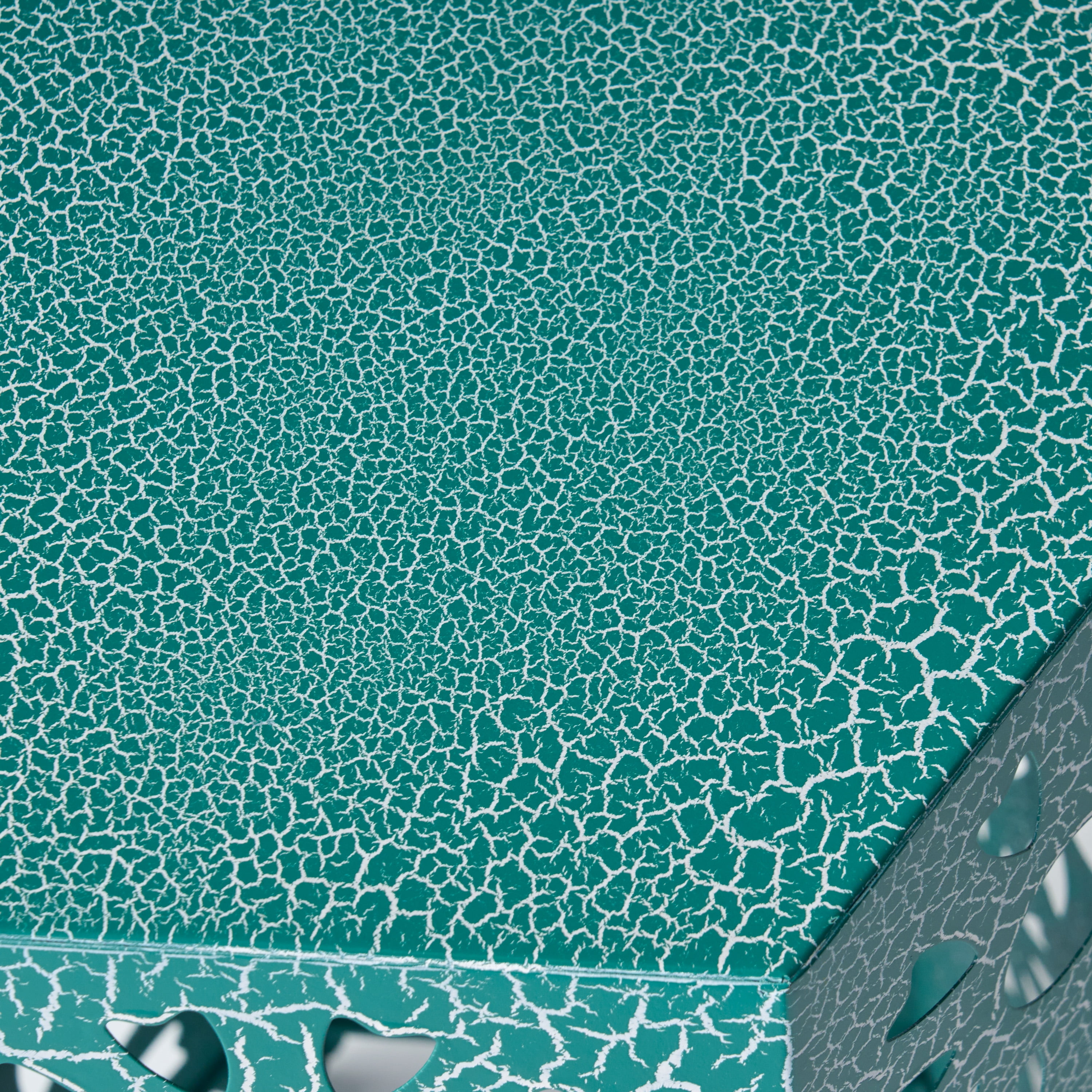 Includes: One (1) Table Material: Iron Tubing Finish: Crackle Teal No Assembly Required Hand Crafted Details Dimensions: 12.00 inches deep x 10.50 inches wide x 18.50 inches high