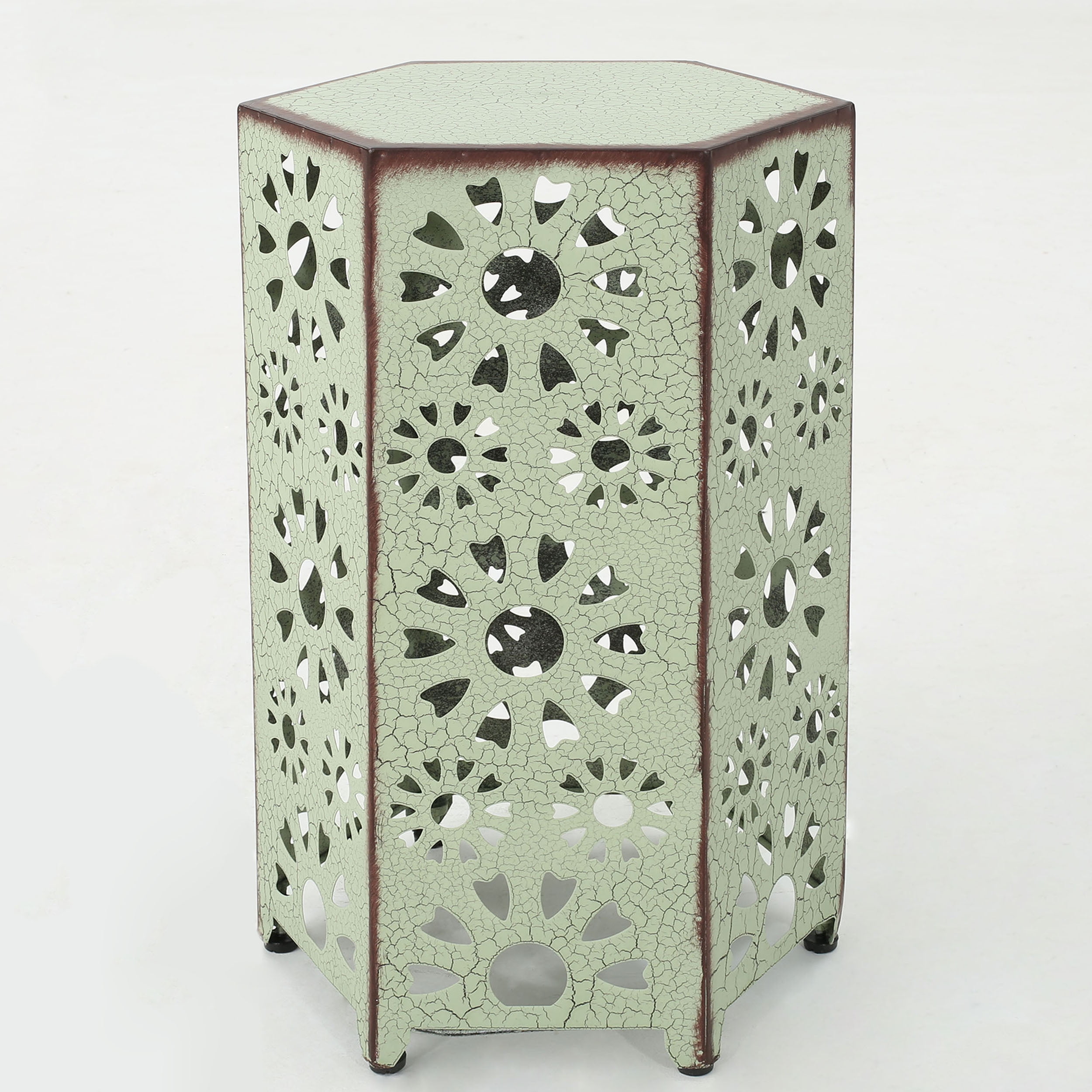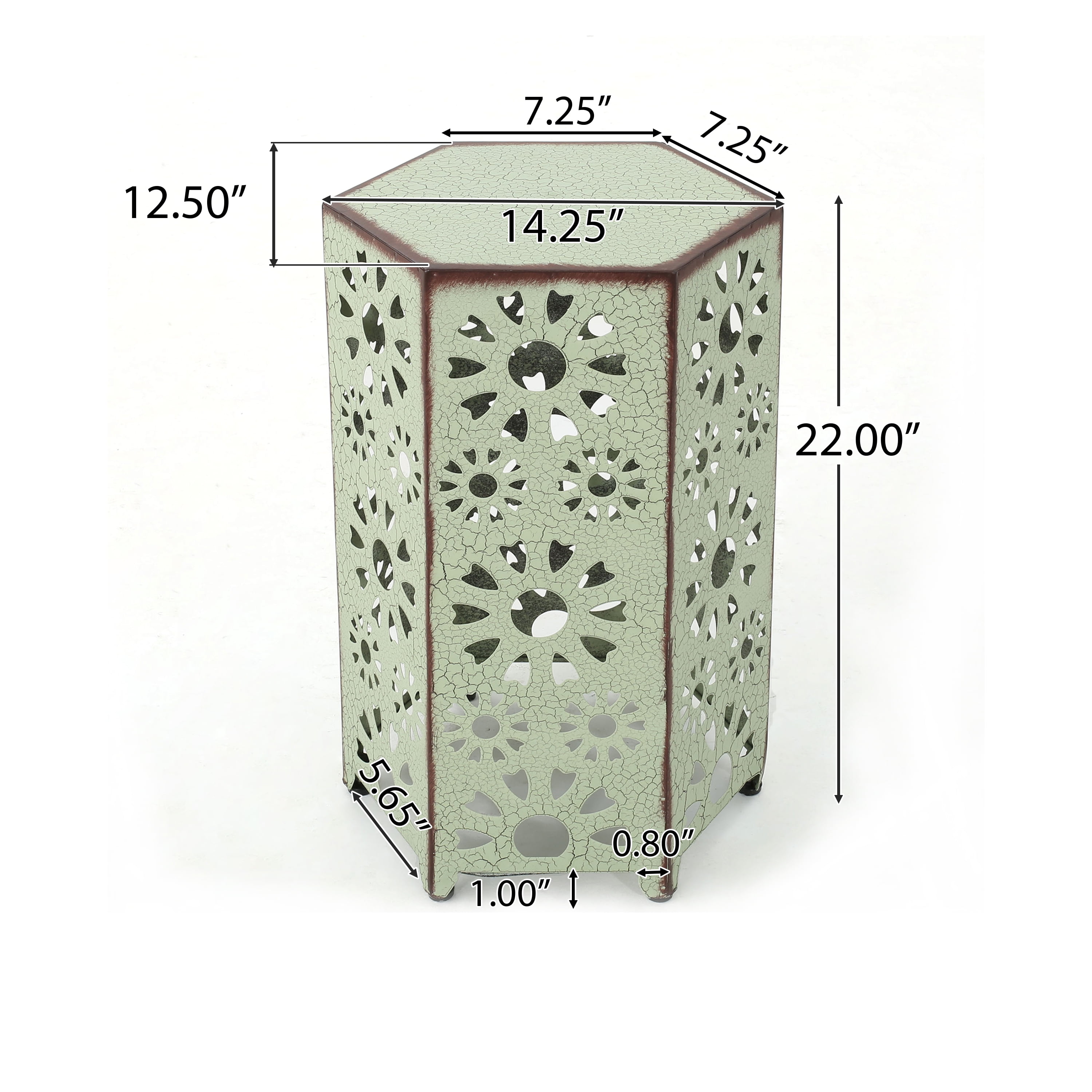 Includes: One (1) Table Material: Iron Tubing Finish: Crackle Green No Assembly Required Hand Crafted Details Dimensions: 14.25 inches deep x 14.25 inches wide x 22.00 inches high