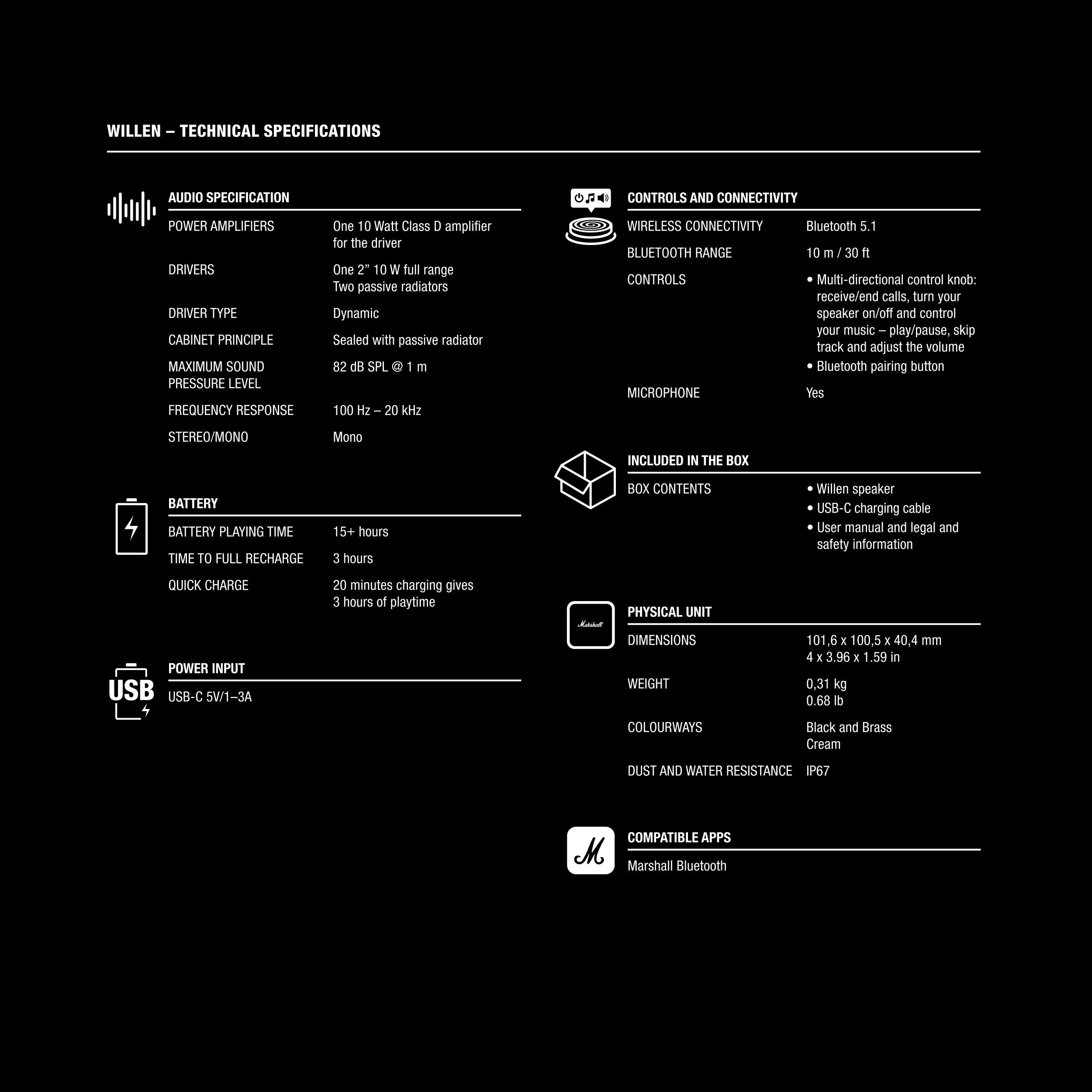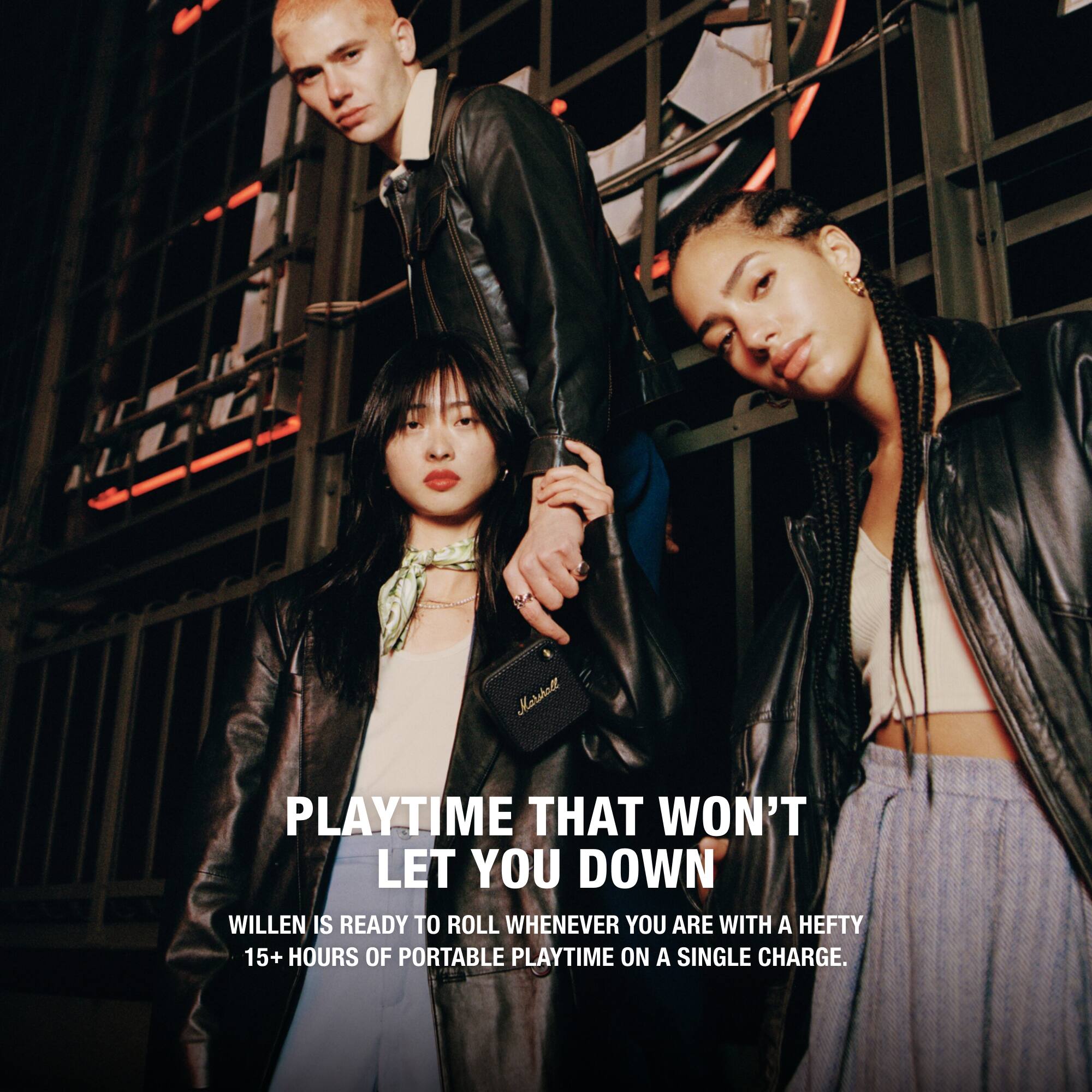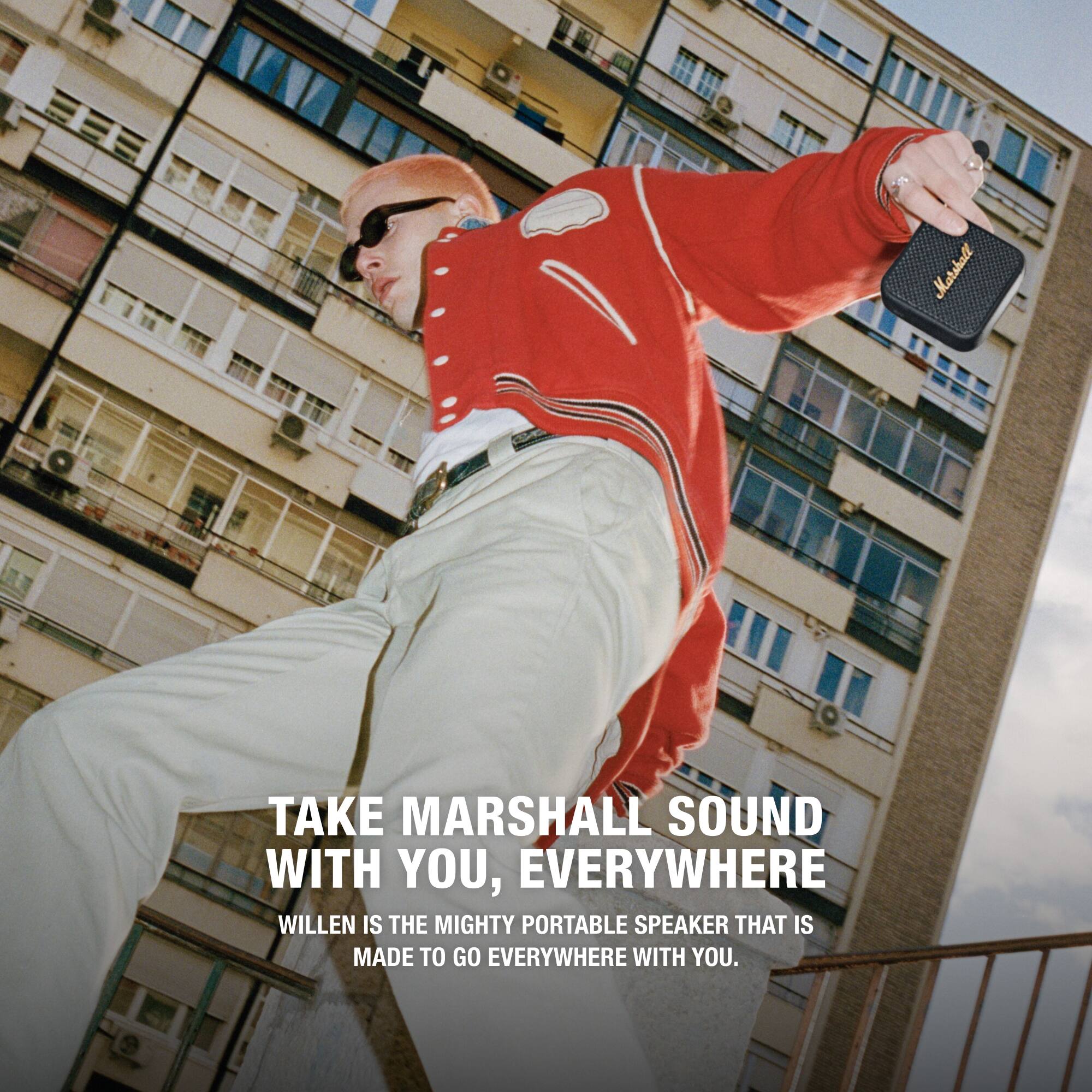 Willen is the mighty portable speaker that is made to go everywhere with you. Built with one 2’’ full range driver and two passive radiators, this speaker brings you the heavy Marshall sound you can’t live without. A top-of-class IP67 dust- and water-resistance rating means it’s always ready for the road. Willen brings together the iconic Marshall design with a ruggedness that dares you to push its limits. All this, plus its hefty 15+ hours of listening on a single charge and mounting strap mean that Willen is raring to go wherever you go.