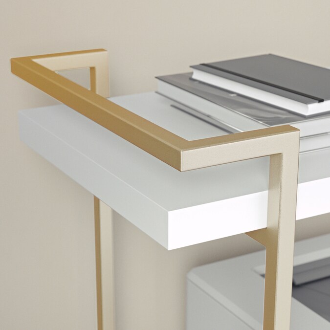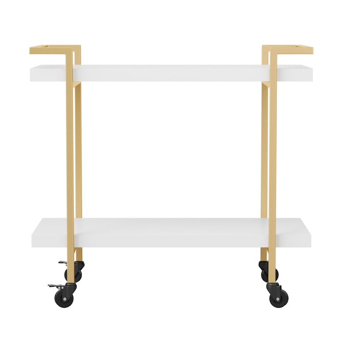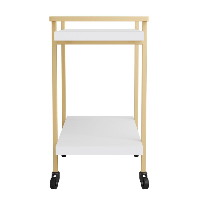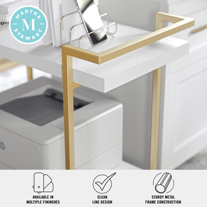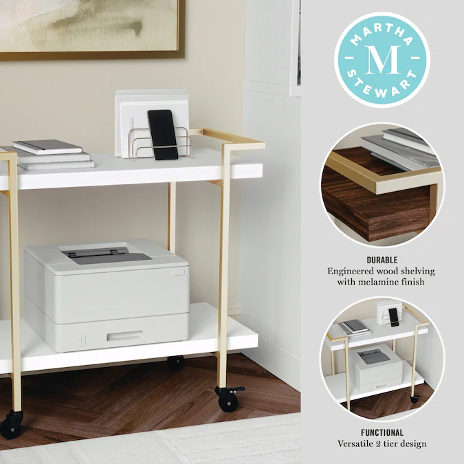 The Martha Stewart Liam 2 Tier Mobile Printer Cart allows you to effortlessly and conveniently transport your office accessories to wherever you’re working and roll them out of the way when you need the space. Boasting two sturdy engineered wood shelves in a timeless white finish and an offset steel frame in polished brass this moveable storage solution lends modern sophistication to any home office area. Locking casters keep the cart in place and make for a smooth transfer when it’s time to move your supplies. Assembly is quick and easy with the included tools and step-by-step instructions.