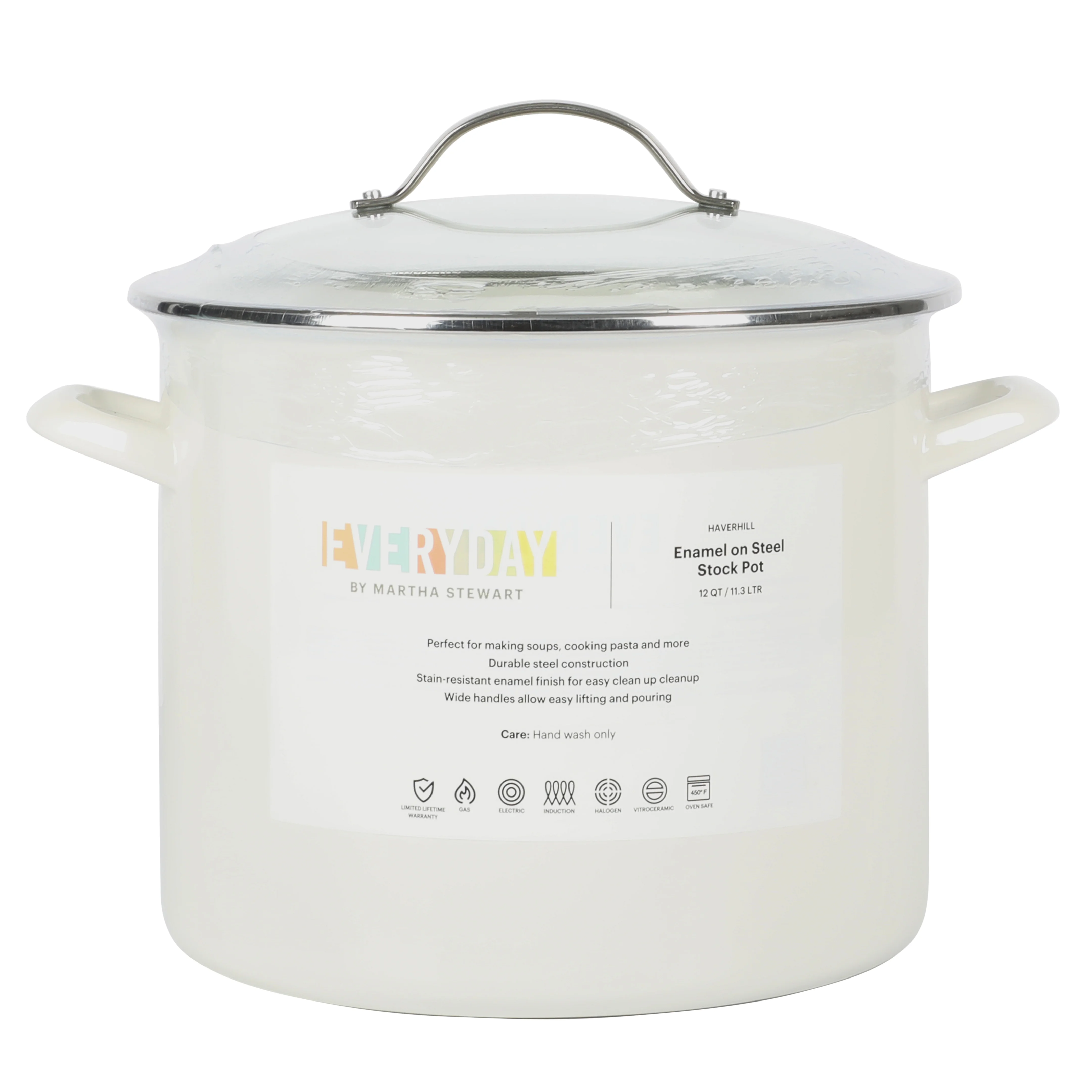 Prepare good food and serve generous amounts of it with the Martha Stewart Everyday Haverhill 12-quart Enamel on Steel Stock Pot with Lid. Crafted from durable steel, it is a sturdy piece of cookware that distributes heat evenly. Beautifully coated with a vibrant enamel finish, the pot is easy to clean to help you spend less time in the kitchen and enjoy entertaining and catching up with friends. Cast side handles offer balance and support when lifting and transferring a generous pot of soup, stew, pasta, shrimp boil, and more. The vented, tempered glass lid provides visibility to monitor cooking progress, while locking in moisture and helping prevent boil-overs. Safe to use on induction, gas, and electric stoves, this stock pot offers versatility to boil, deep fry, reduce, and sauté to learn and perfect family heirloom recipes and trendy, restaurant-quality dishes. Oven safe up to 450°F. Hand wash only. Enjoy beautifully crafted kitchen and tabletop pieces that blend style and function with Everyday by Martha Stewart. Inspired by Martha’s love for elevated dining and entertaining, these products are crafted for the everyday home cook who shares her passion for home-cooked meals, entertaining guests, and sharing moments with family and friends.