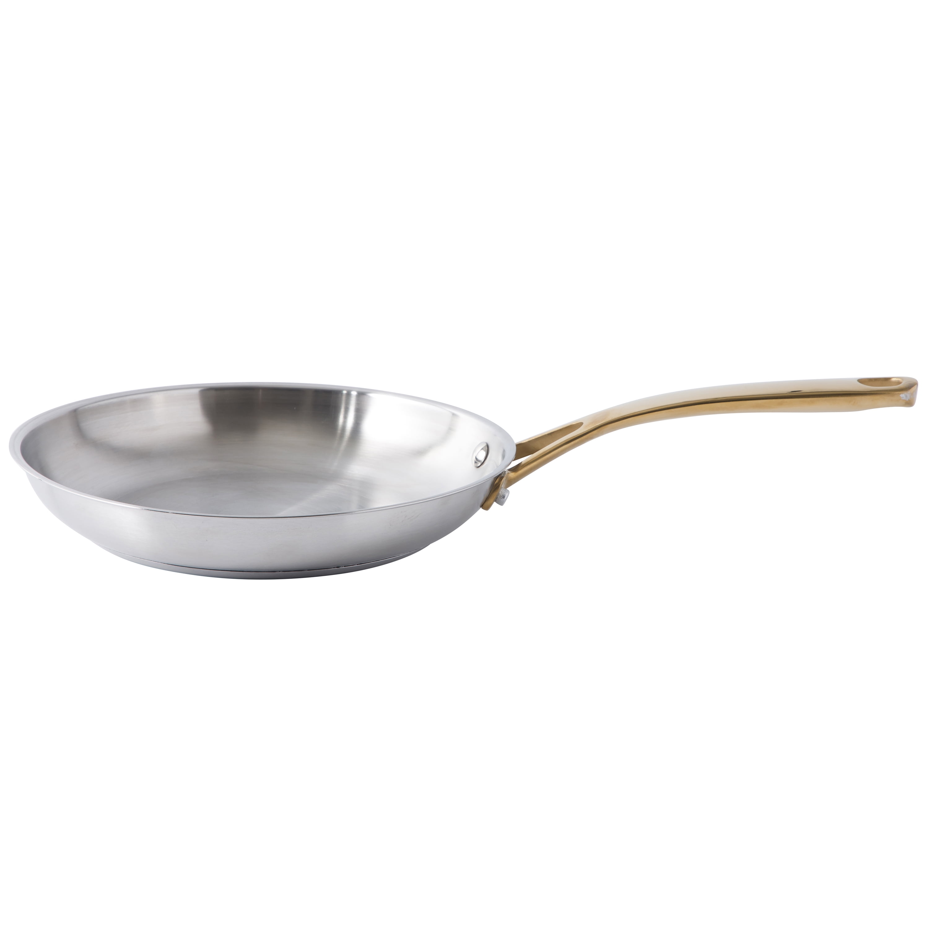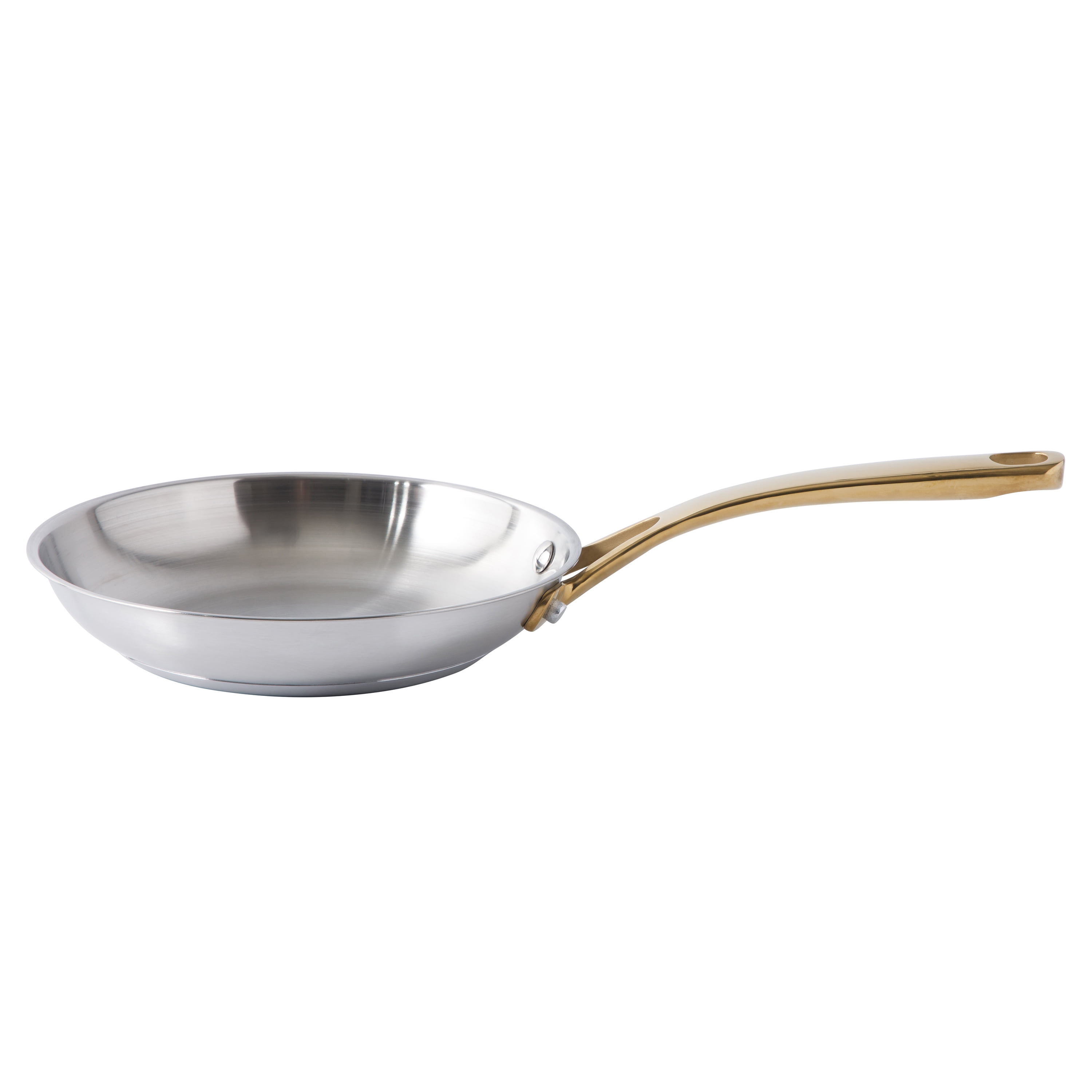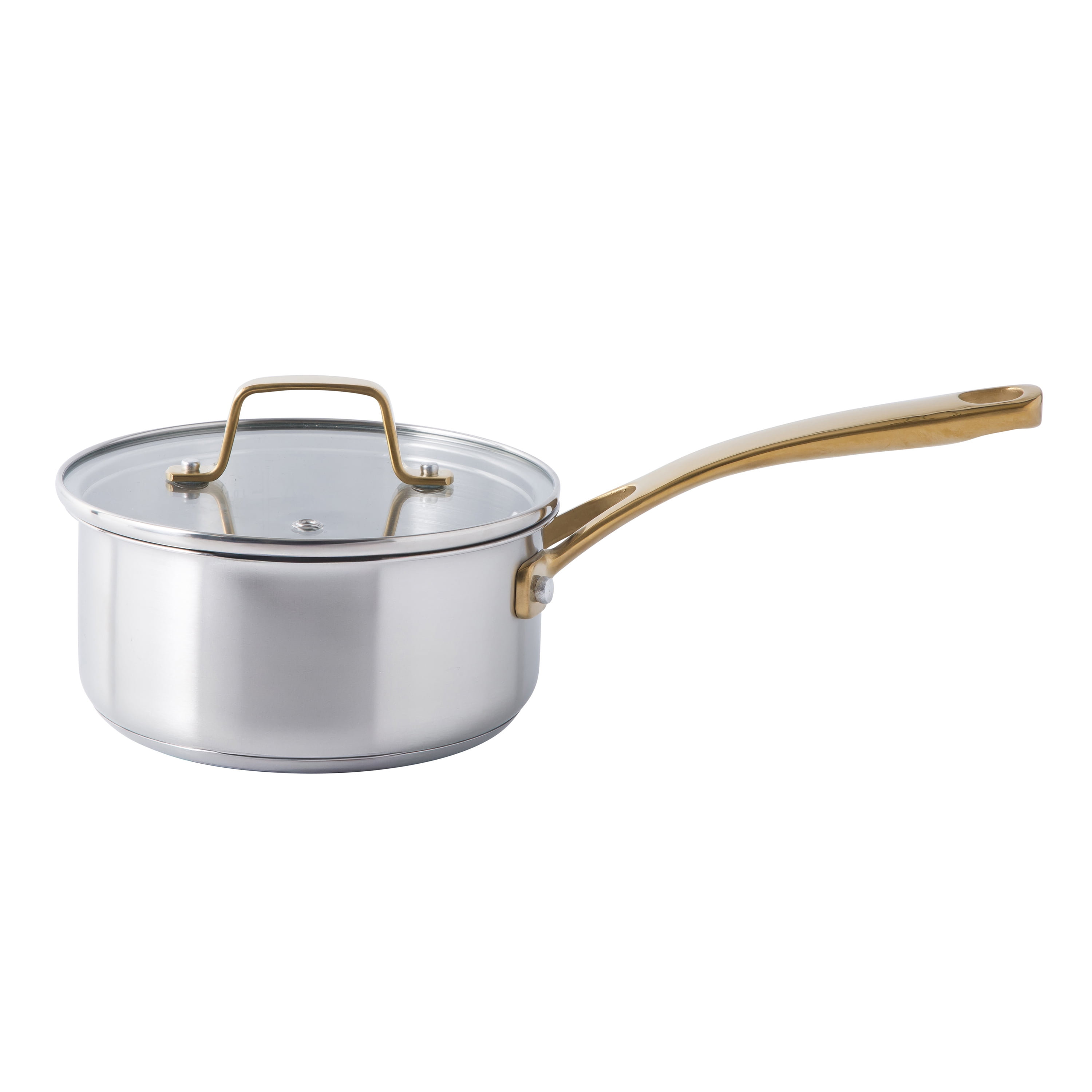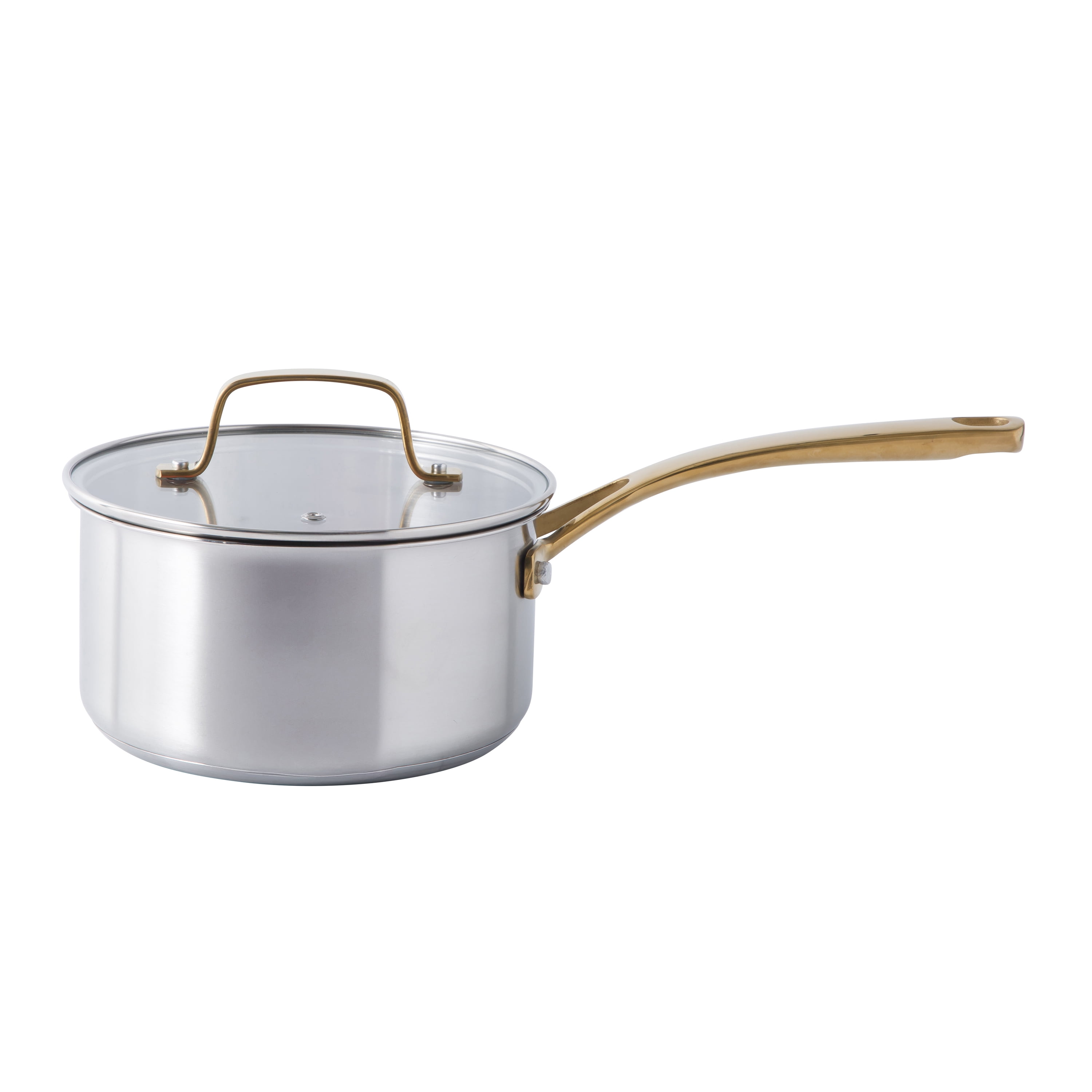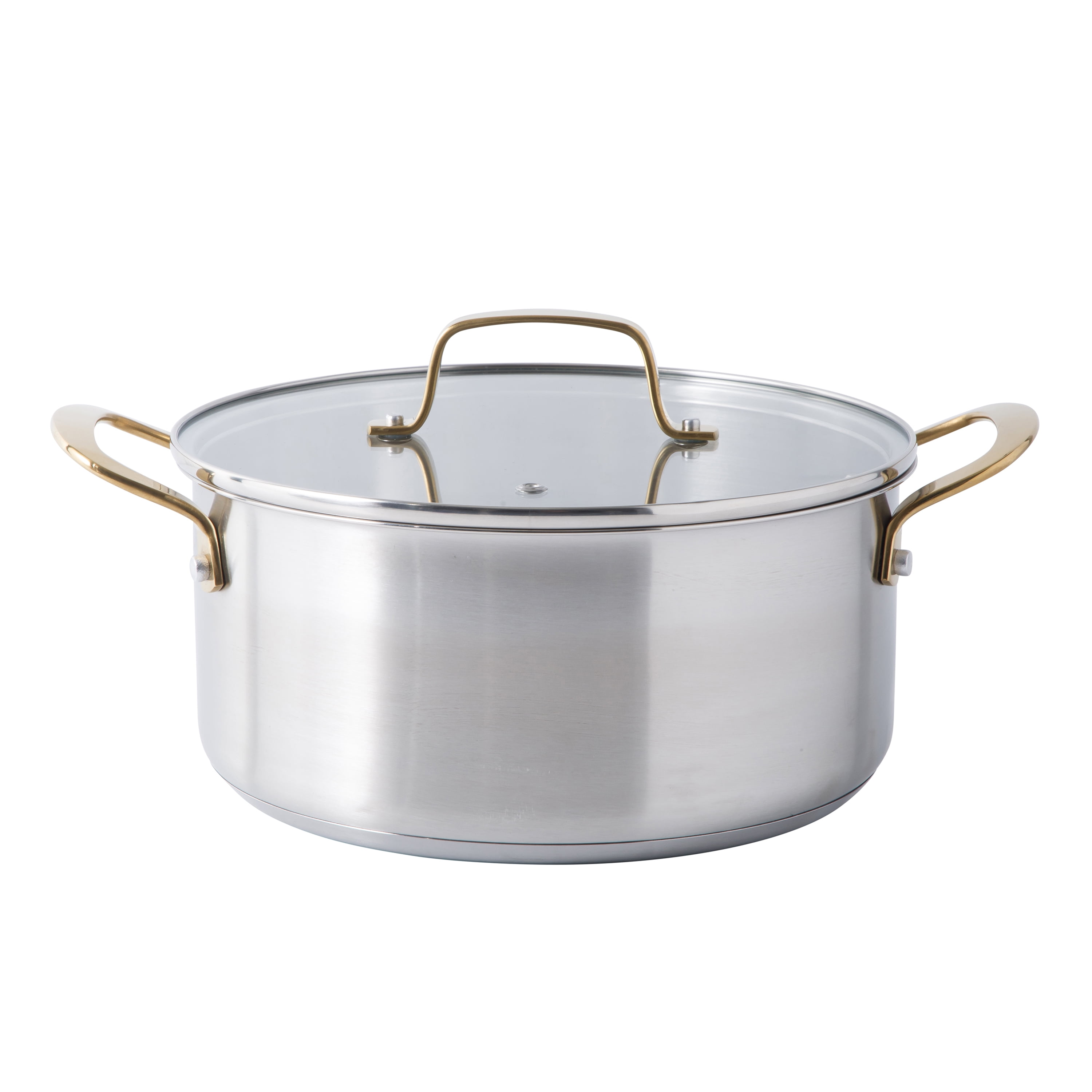 A set includes two frying pans (8 inches and 9.5 inches), two saucepans with lids (1.6 quarts and 2.5 quarts), one 2.8-quart sauté pan with lid and one 5.3-quart Dutch oven with lid 18/8 non-reactive stainless steel provides durability, perfect for everyday use Impact-bonded aluminum base promotes uniform heat distribution to cook evenly with no hotspots Interior measurements for accurate readings and portioning Works with induction, gas, electric, halogen, ceramic and glass stovetops Riveted handles offer a strong grip Tempered glass lid seals in the heat and moisture Built-in vent on the lid allows the steam to escape to help prevent overflows Oven and broiler safe Dishwasher safe, hand wash recommended