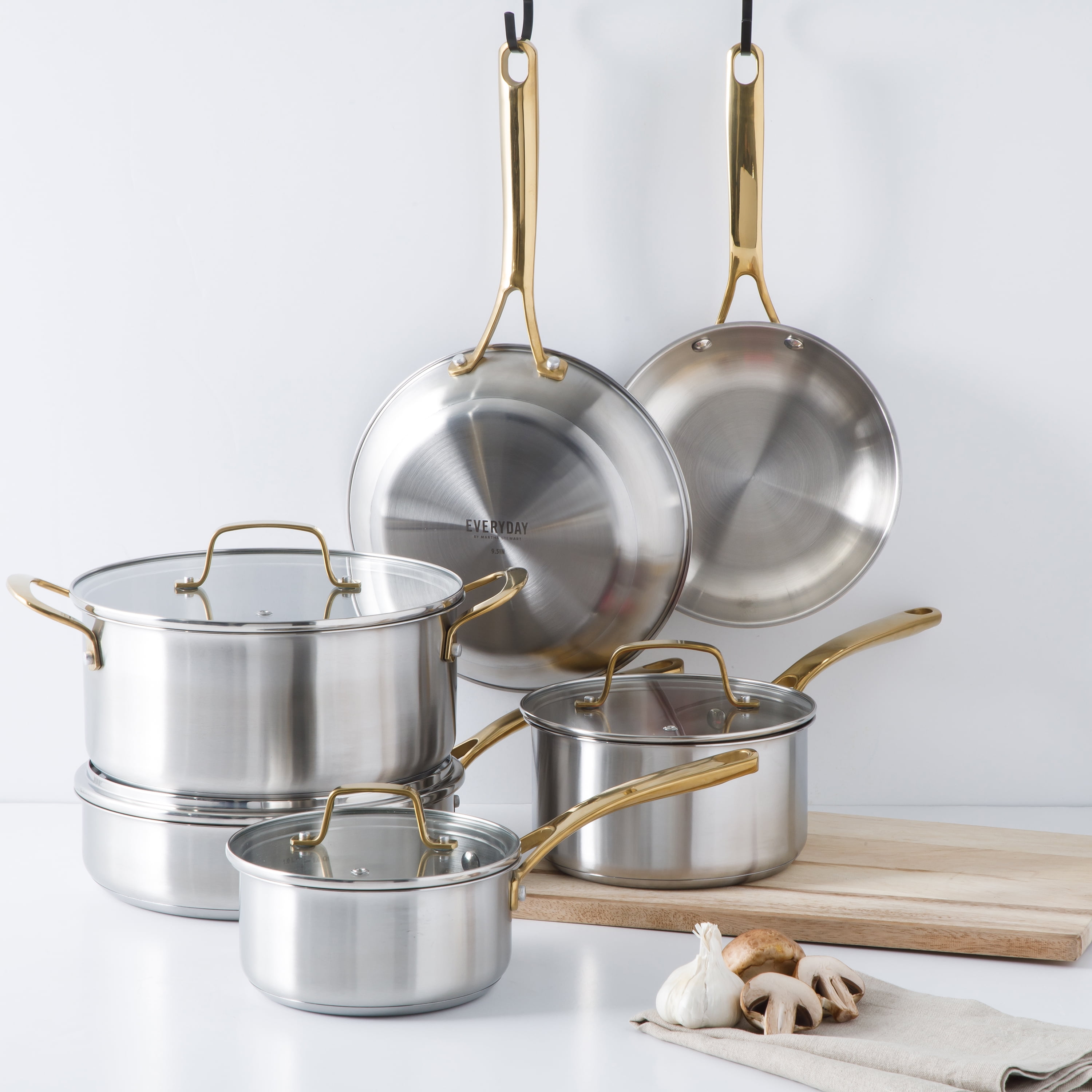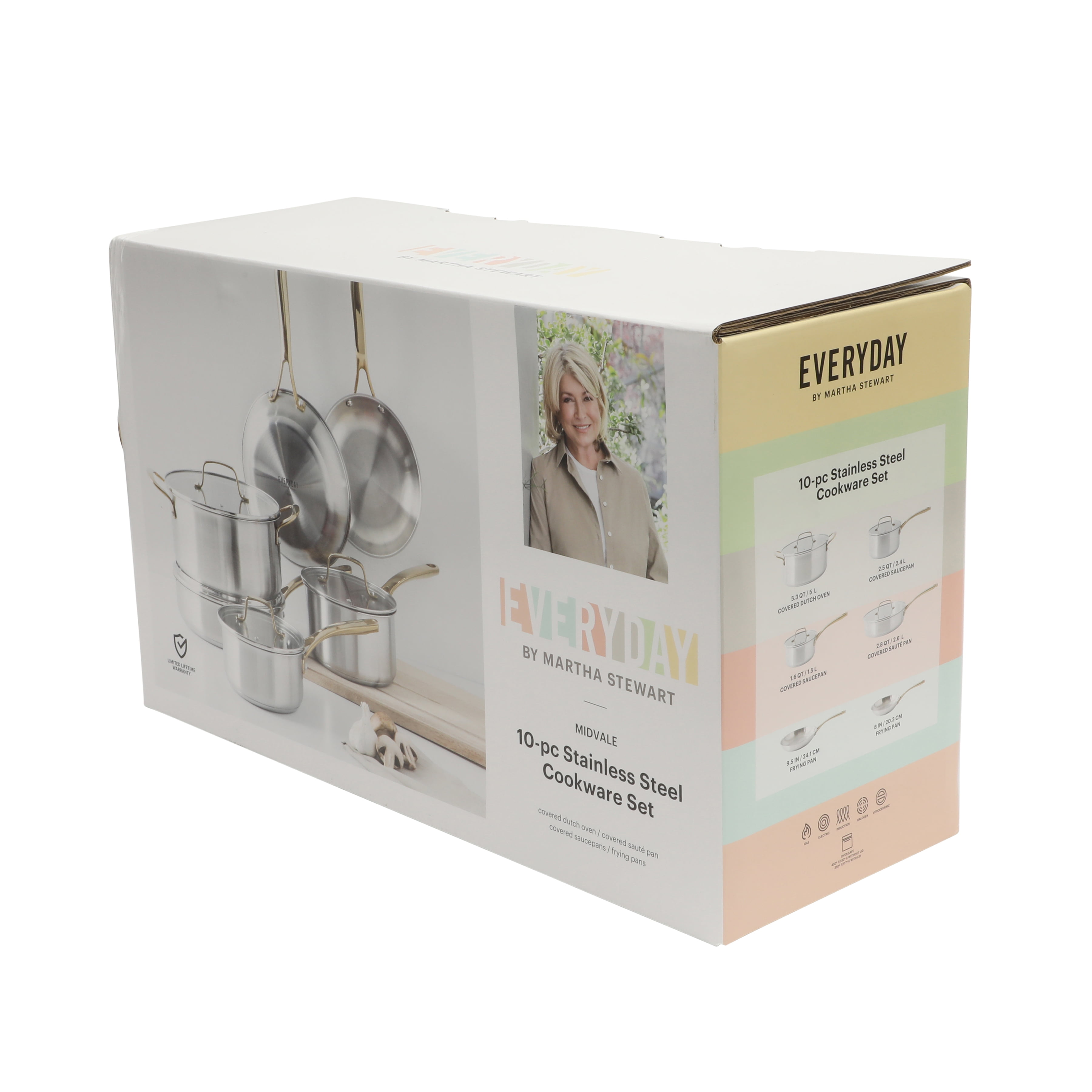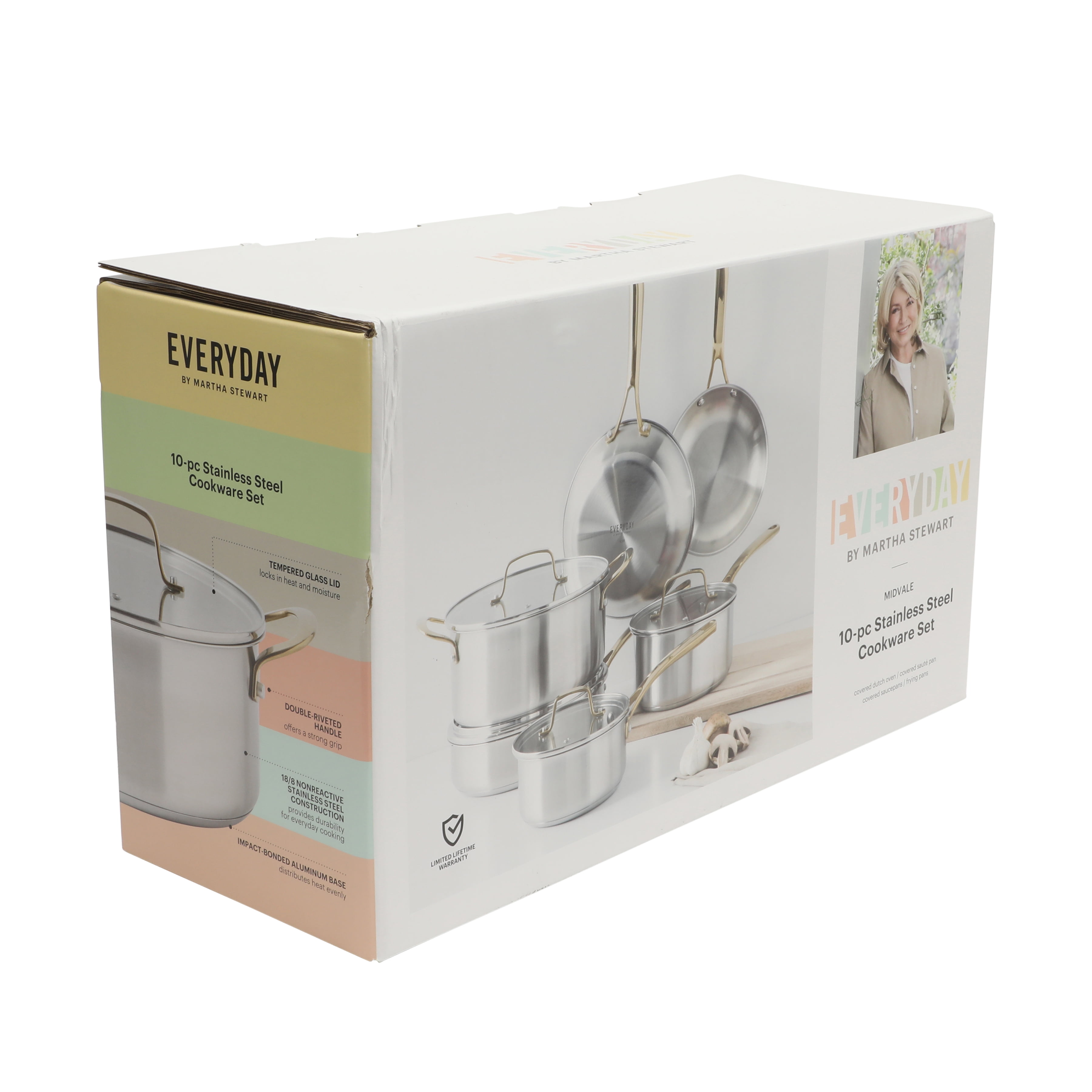 Make every day extra special by serving delicious meals to surprise and delight your family at home. The Everyday by Martha Stewart Midvale 10-piece Stainless Steel Cookware Set is a complete kitchen collection thoughtfully designed to bring both functionality and elegance to your cooking routine. Made from beautiful stainless steel, this set of pots and pans provides excellent durability and modern touch to any style of kitchen. It features an impact-bonded aluminum base to absorb heat from any type of stovetop for uniform heat distribution. Through this process of even heating, homemade meals will come out perfectly cooked based on your favorite cookbook. Favored for achieving the perfect sear on prime cuts of steak, stainless steel cookware is also suitable for making soups, frying eggs, sautéing vegetables and more. Each piece has interior measurement markings to help you avoid guesswork and take uncertainty out of portioning. With these convenient fill lines, there’s no need to eyeball your ingredients because you’ll always know exactly how much water, broth, or soup you’re working with. Vented, tempered glass lids lock in heat and moisture while allowing steam to safely escape, so you can simmer sauces, boil pasta to al dente perfection, or develop deep, rich flavors in your broth — all while keeping an eye on your progress without lifting the lid. Stainless steel rivets securely fasten the handles for a strong and balanced grip, making it easy to lift and transfer the pot, even when it’s full. Oven and broiler safe. Dishwasher safe, hand wash recommended. Enjoy beautifully crafted kitchen and tabletop pieces that blend style and function with Everyday by Martha Stewart. Inspired by Martha’s love for elevated dining and entertaining, these products are crafted for the everyday home cook who shares her passion for home-cooked meals, entertaining guests, and sharing moments with family and friends.
