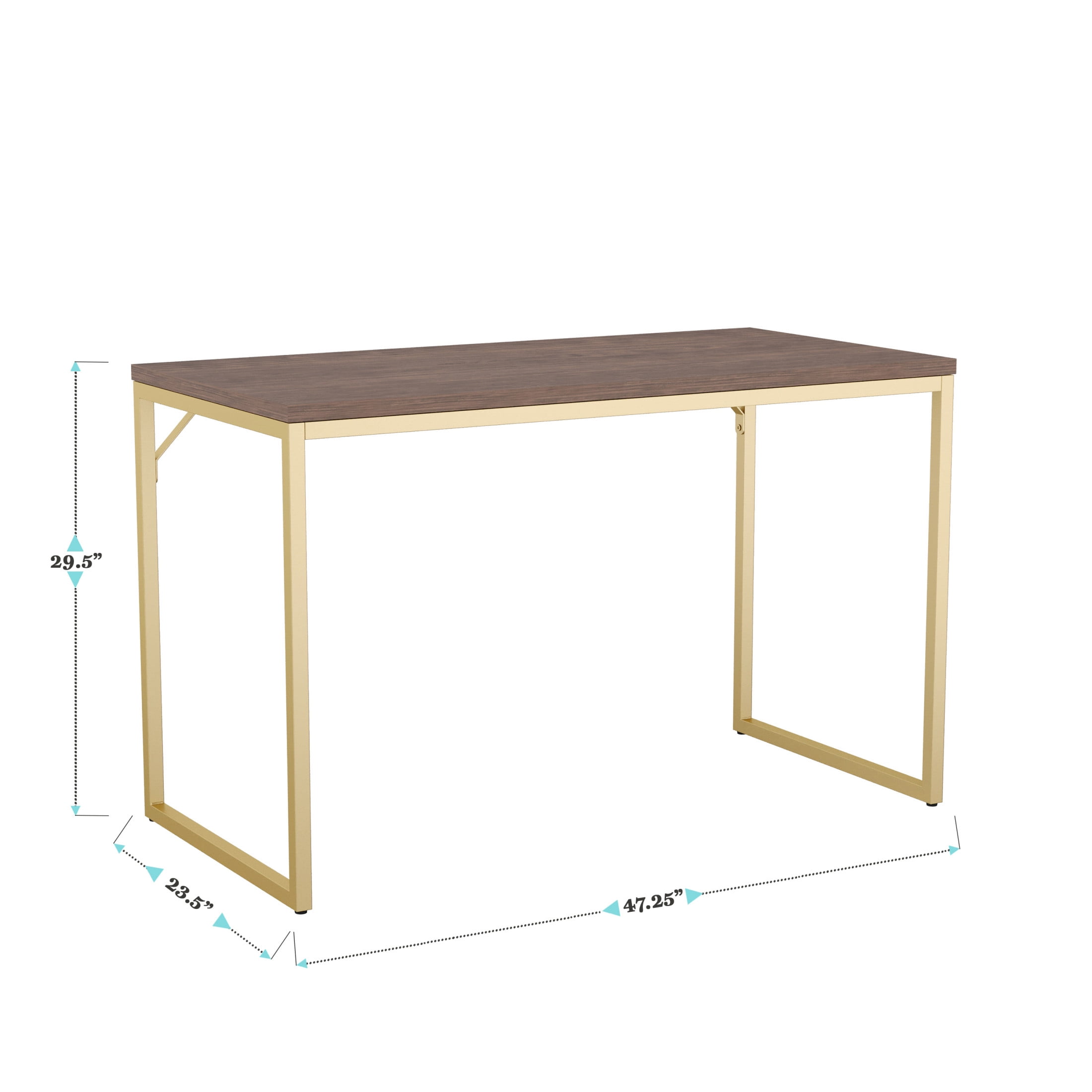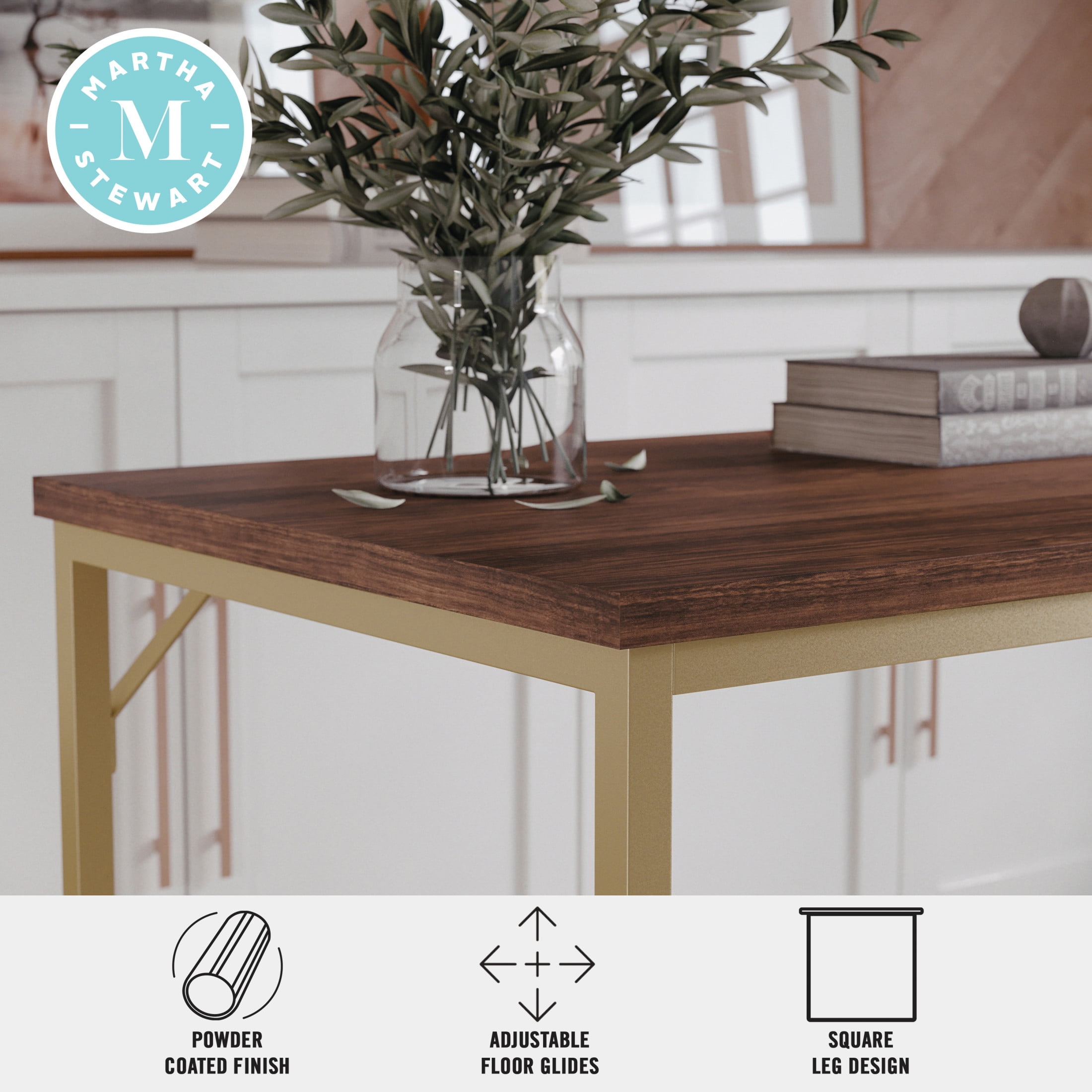 Martha Stewart Noah Home Office Parsons Desk in Walnut Wood Grain with Polished Brass Metal Frame Modern open framework home office desk Durable Engineered Wood with a black wood grain melamine finish Powder coated steel frame in polished brass Square leg design Adjustable floor glides ensure a level surface while protecting your flooring Wipe clean with a damp cloth Assembly required tools included Dimensions – 47.25″W x 23.5″D x 29.5″H; Maximum Static Weight Capacity: 200 LBS. Static Weight