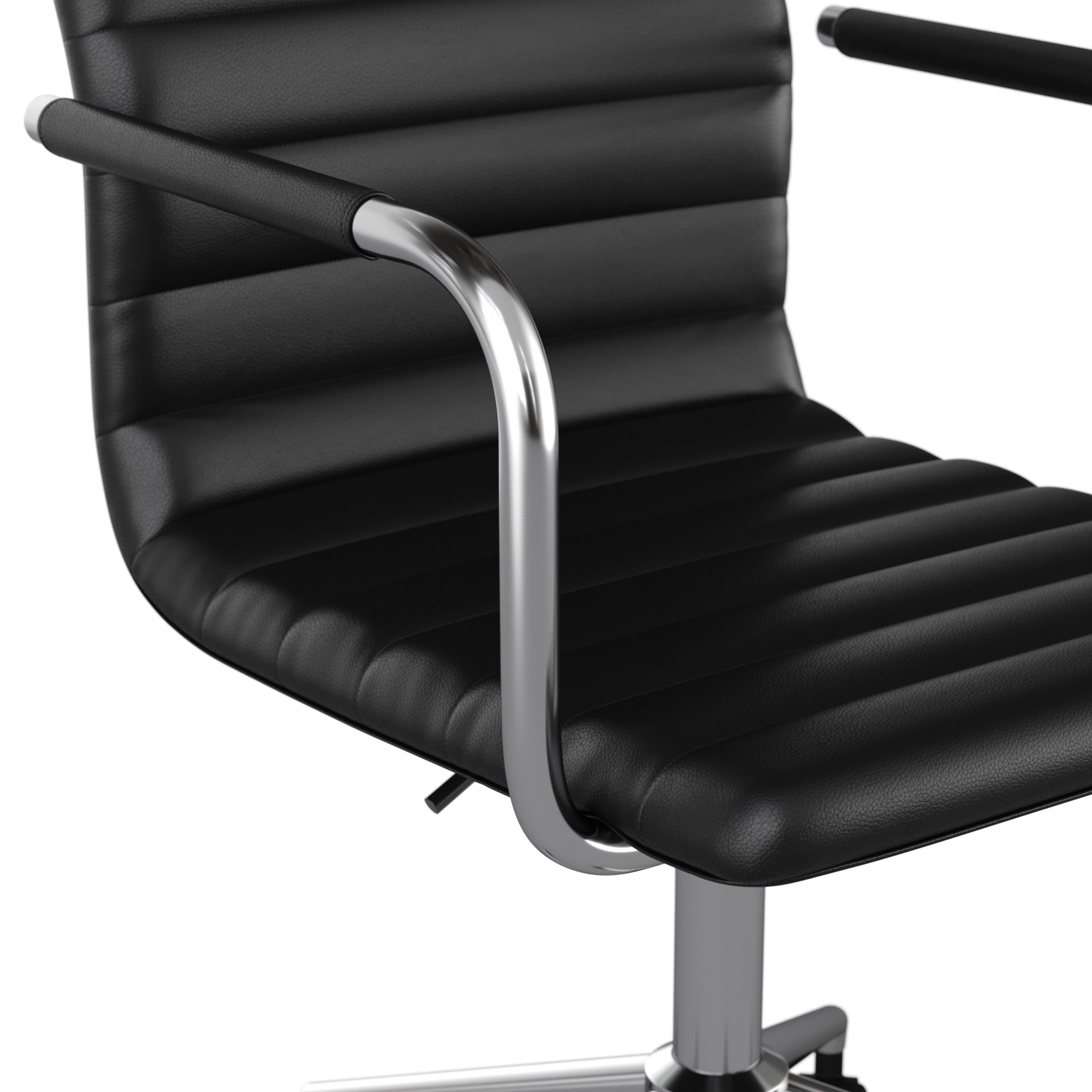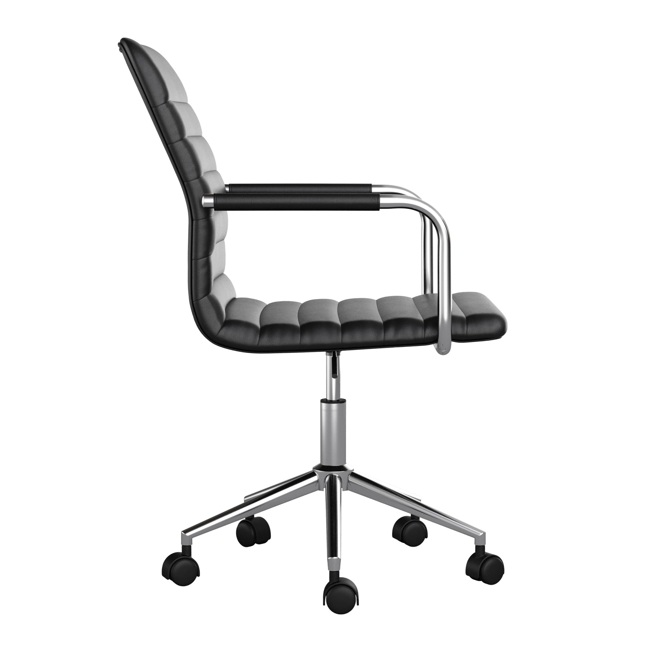 Martha Stewart Taytum Upholstered Office Chair in Black/Polished Nickel Modern office chair features simple elegance for any home office Contemporary style office chair in black faux leather upholstery Faux leather accented armrests Polished nickel metal frame with dual wheel casters Pneumatic height adjustable 360° swivel seat Built-In Lumbar Support Maximum static weight capacity: 300 lbs. Wipe clean with a dry cloth Dimensions – 25.5″W x 25.5″D x 36.25″H; Seat Size: 17.25″W x 16.75″D x 20″H; Back Size: 17″W x 16.5″H; Arm Size: 26.5″H from floor; 7.5″H from seat; Maximum Static Weight Capacity: 300LBS