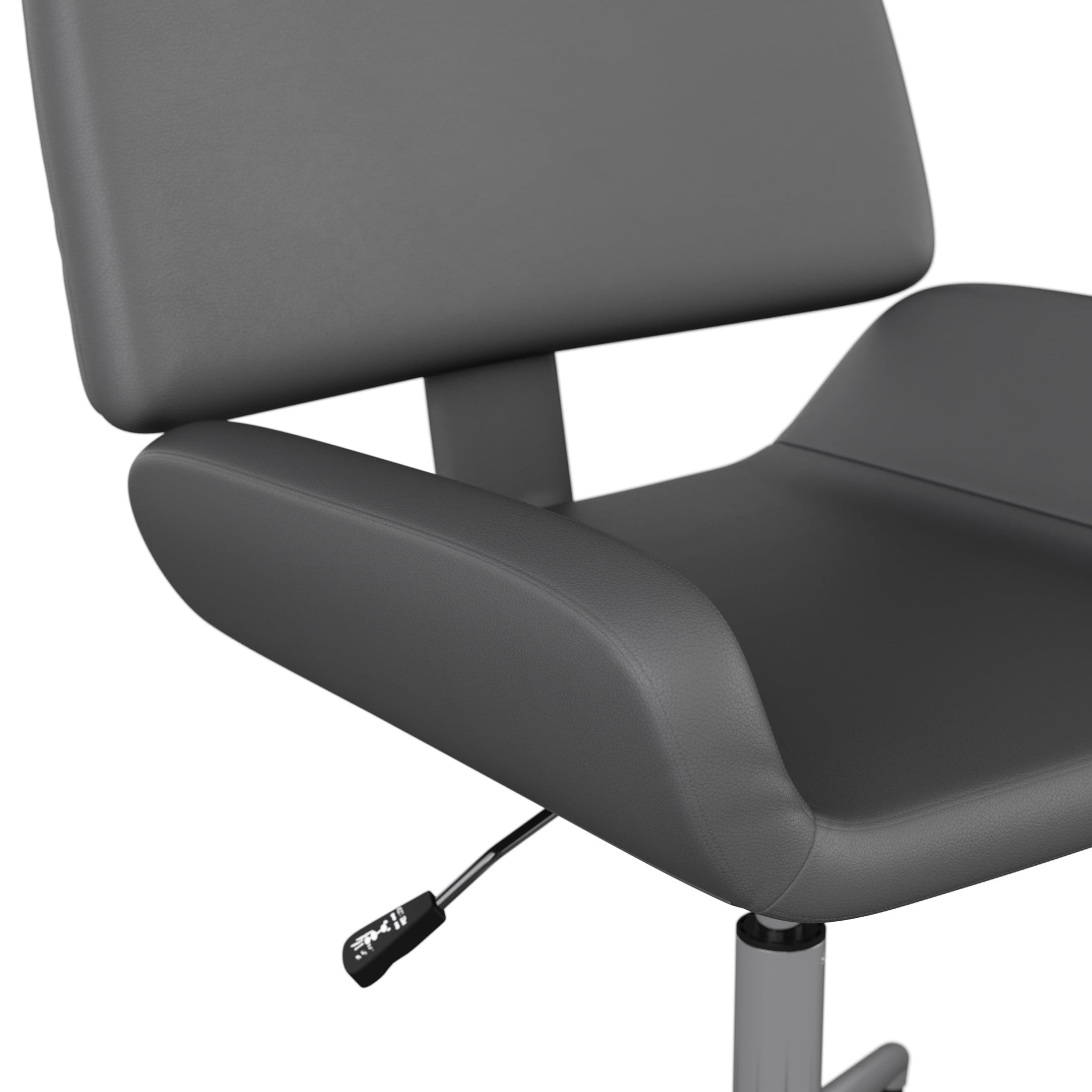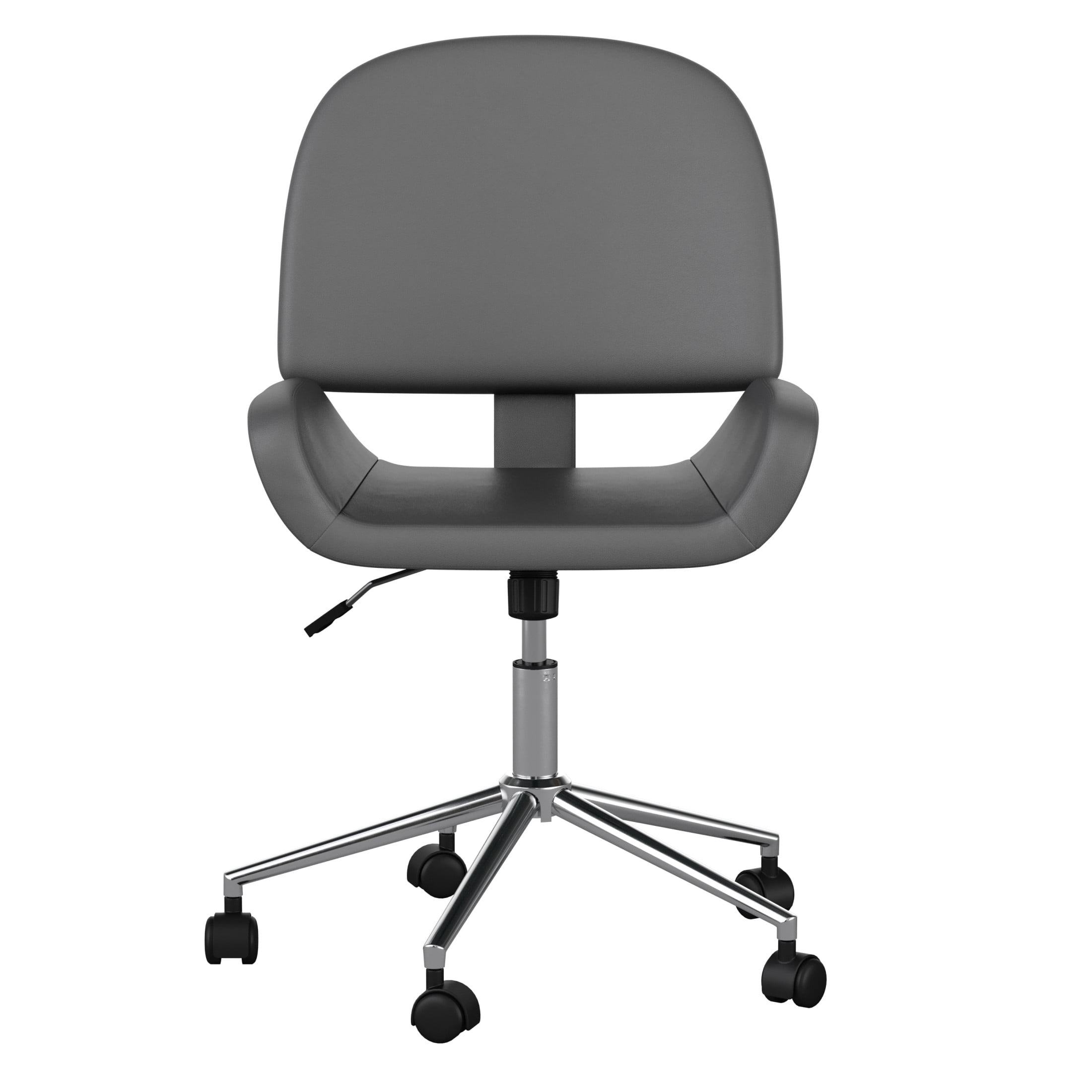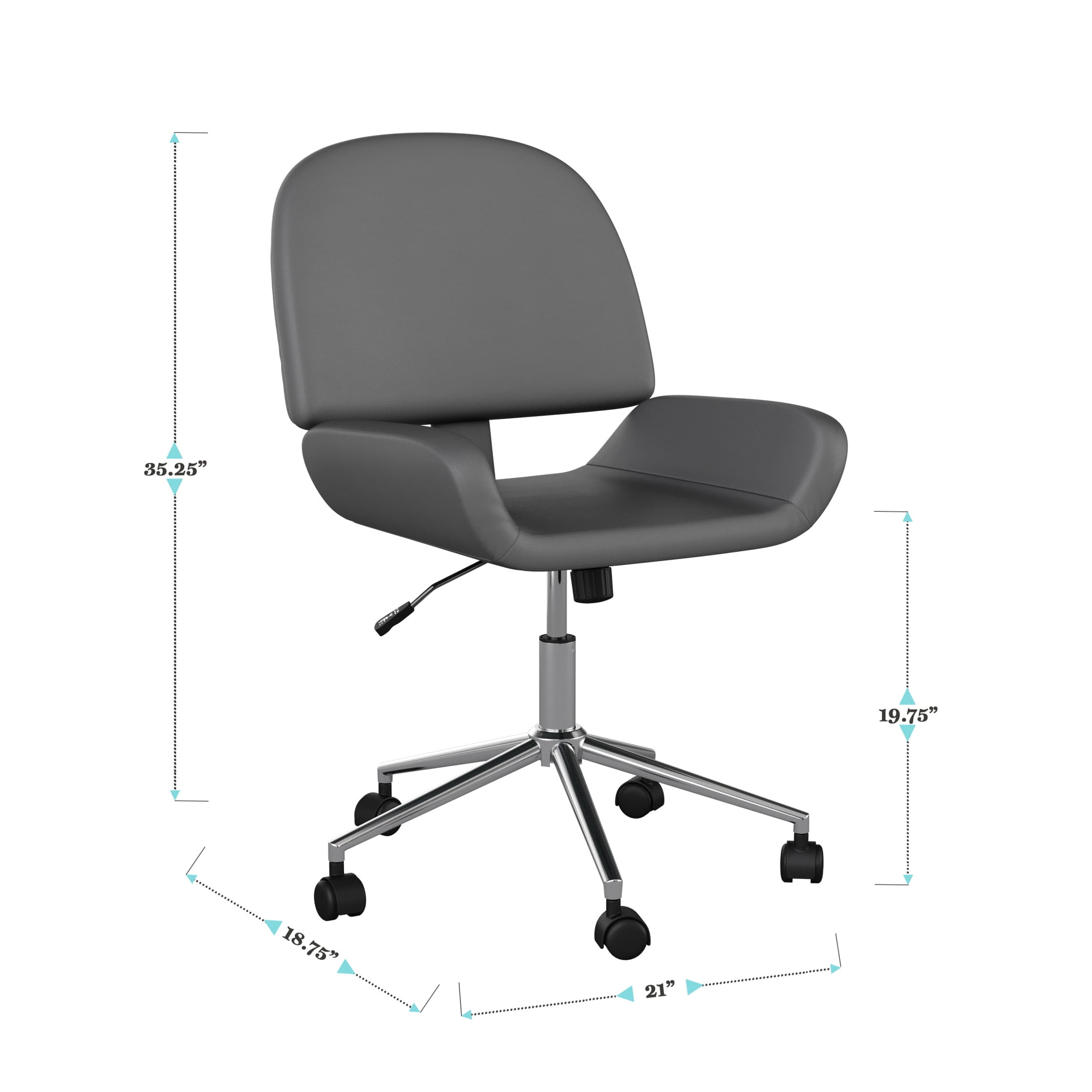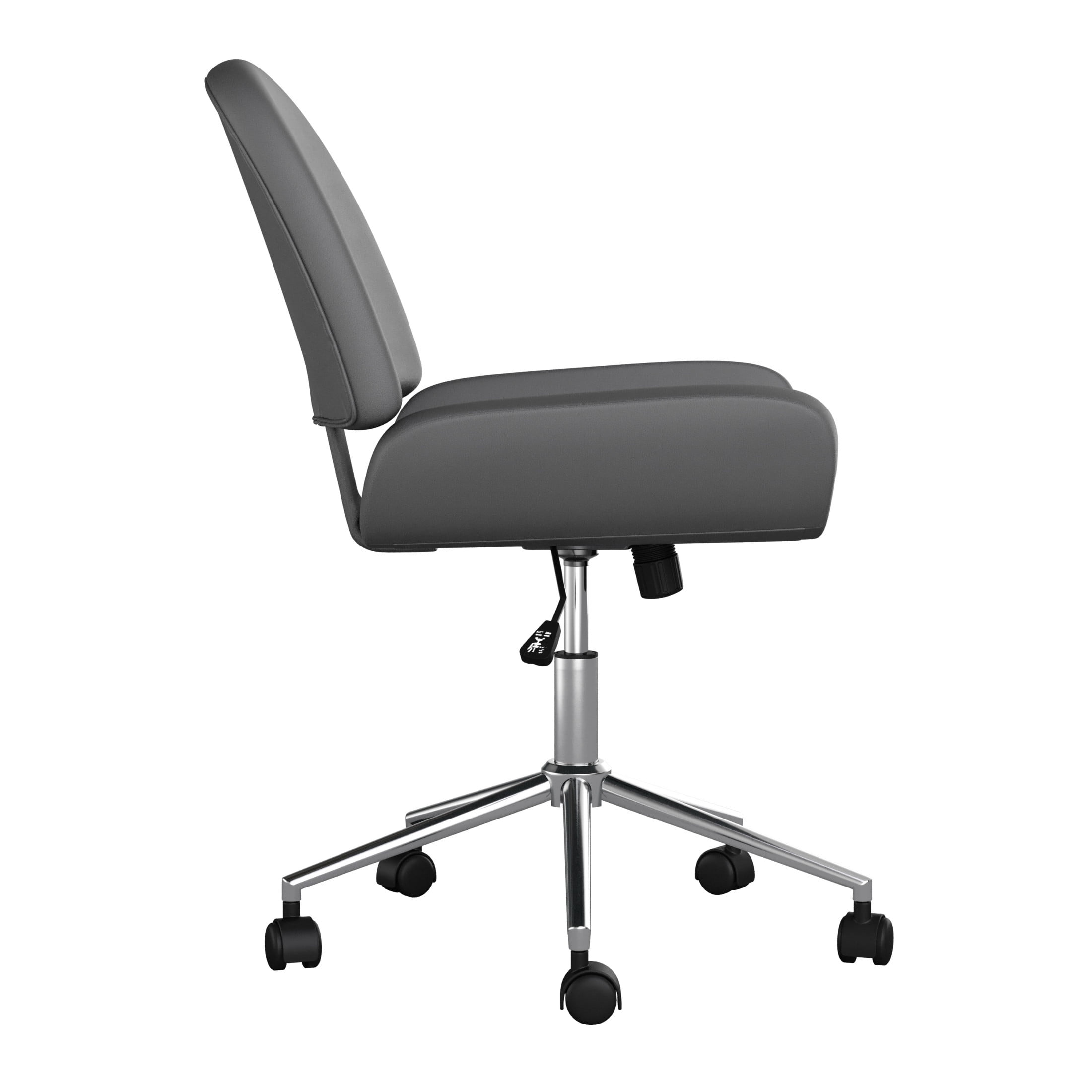 Martha Stewart Tyla Upholstered Office Chair in Gray/Polished Nickel Newly designed office chair elevates any home office space Contemporary style office chair in gray faux leather upholstery Space-saving armless design Polished nickel metal frame with dual wheel casters Pneumatic height adjustable 360° swivel seat Tilt lock and tilt tension controls Maximum static weight capacity: 330 lbs. Wipe clean with a dry cloth Dimensions – 21″W x 18.75″D x 35.25″H; Seat Size: 14.5″W x 18.75″D x 19.75″H; Back Size: 20.25″W x 20.5″H; Arm Size: 18.75″H from floor; 3.25″H from seat; Maximum Static Weight Capacity: 300LBS