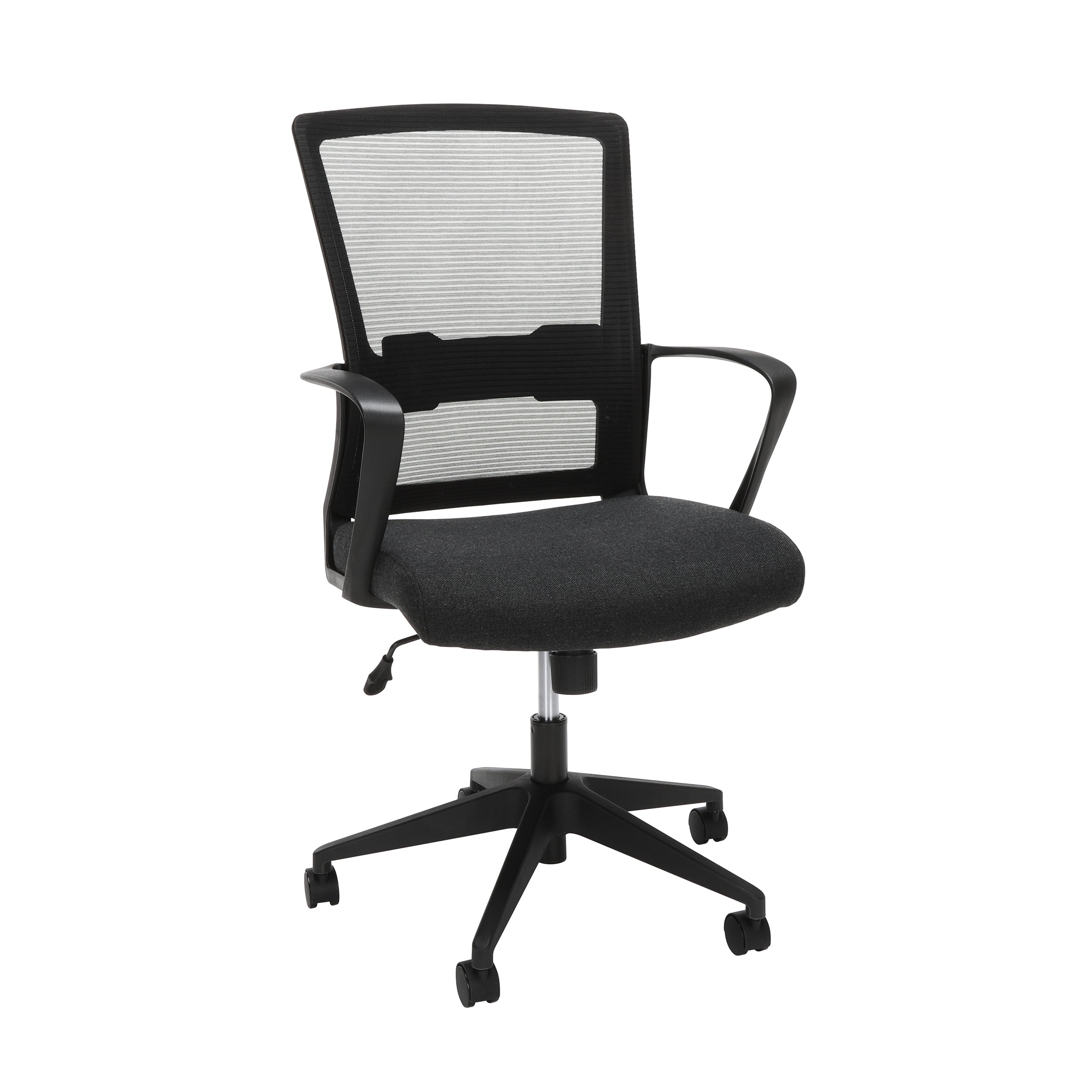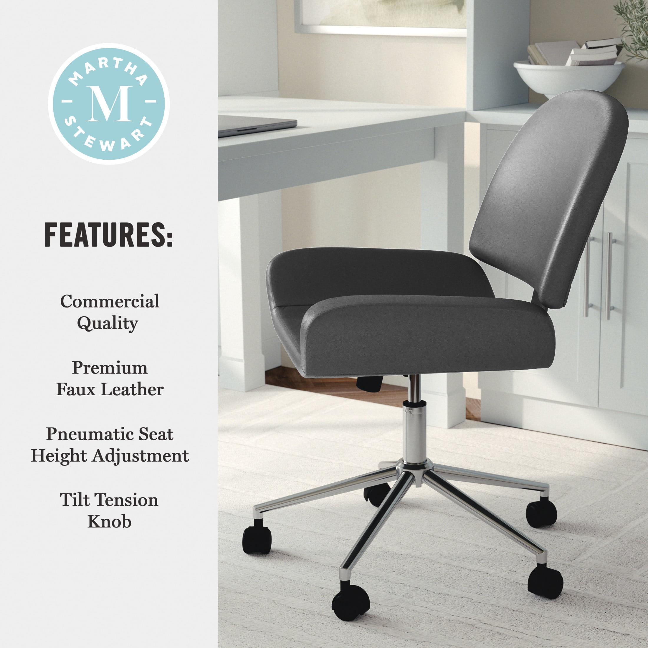 The Martha Stewart Tyla Office Chair is an updated classic that lends instant charm to your home office. This faux leather desk chair features an armless upgradeed nickel frame that adds elevated sophistication to any decor. A pneumatic height adjustment lever tucked beneath the 360° swivel seat offers a custom seating experience to keep you comfortable throughout your workday. Assembly is easy with the included tools and step-by-step instructions.