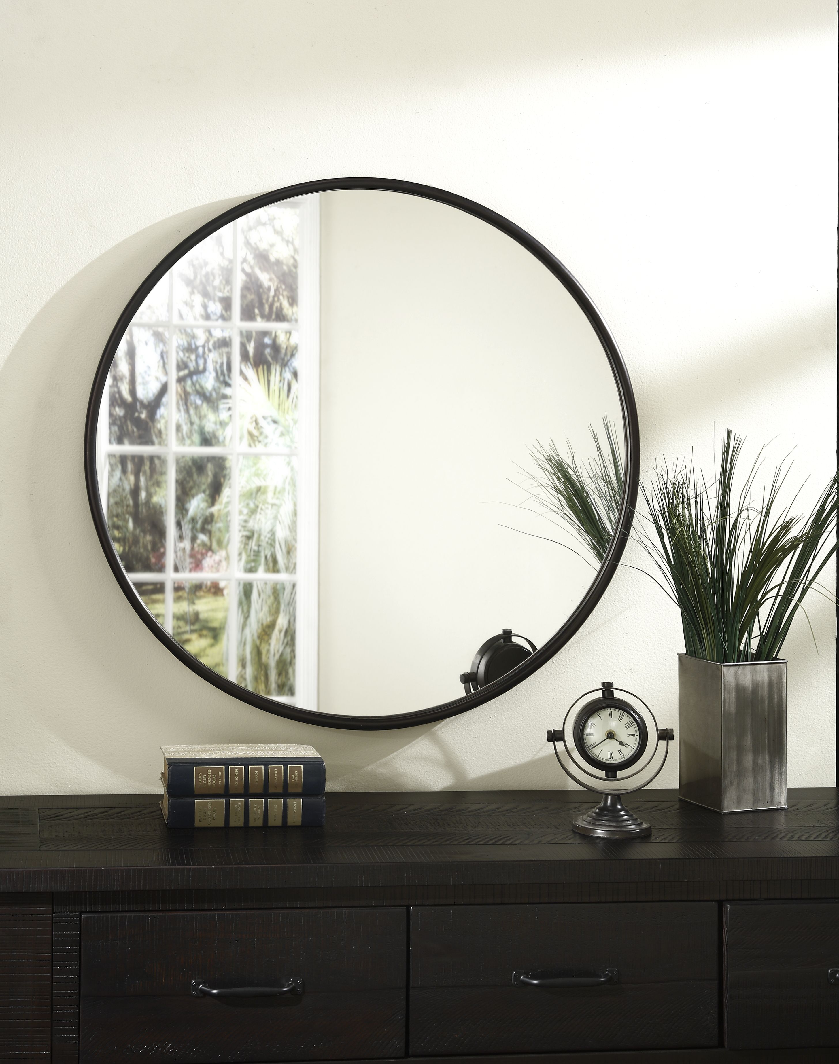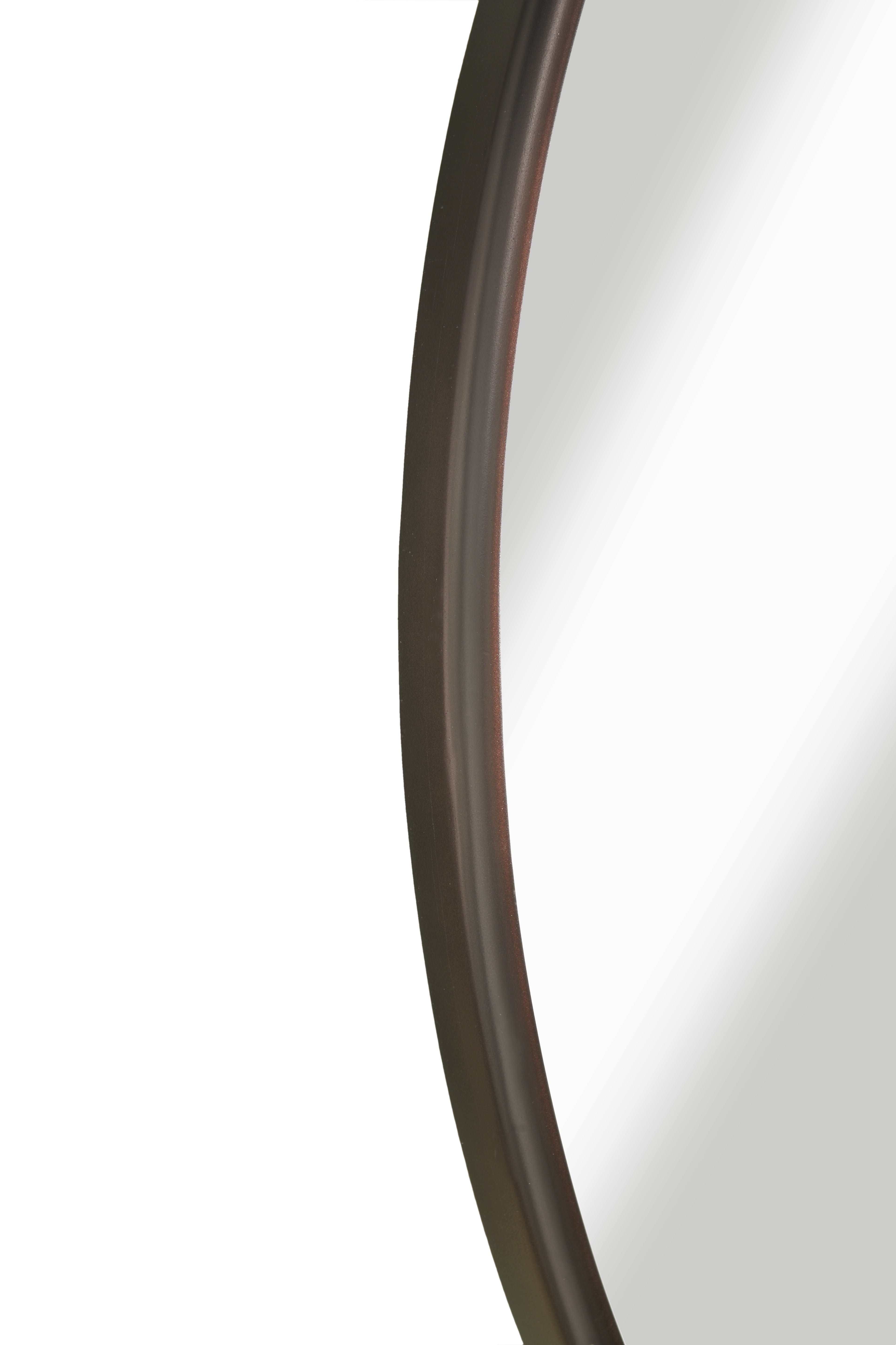 Finish: Oil Rubbed Bronze Classic round style mirror with a slim metal frame fits in with modern, contemporary, or industrial styles Perfect to use in the bathroom, living room, bedroom, hallway, or entryway Two keyhole hooks that are provided on the back of the mirror in order to hang without the use of a wire Overall Dimensions: 36” H x 36 W” x 1” D. Glass Dimensions 34” x 34”