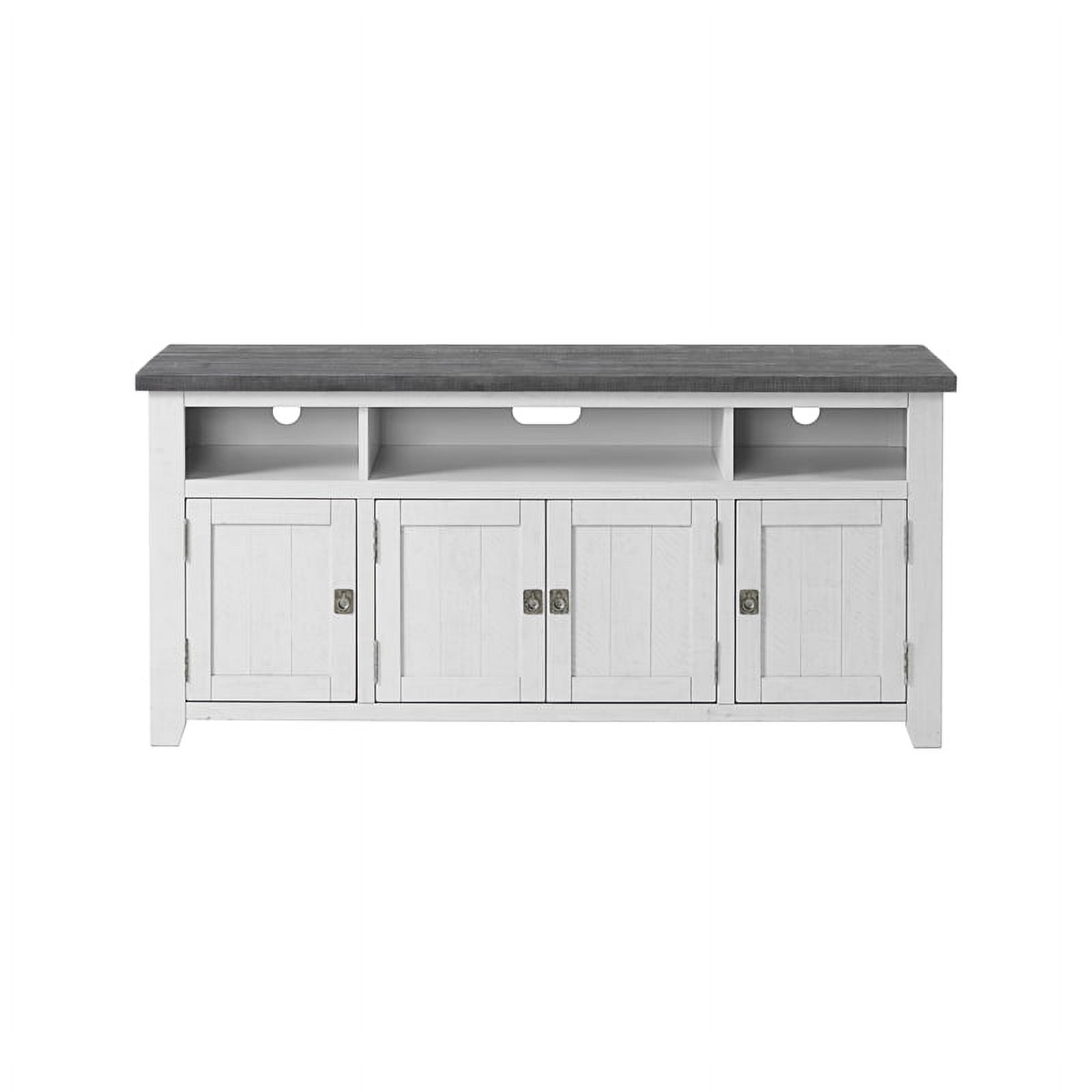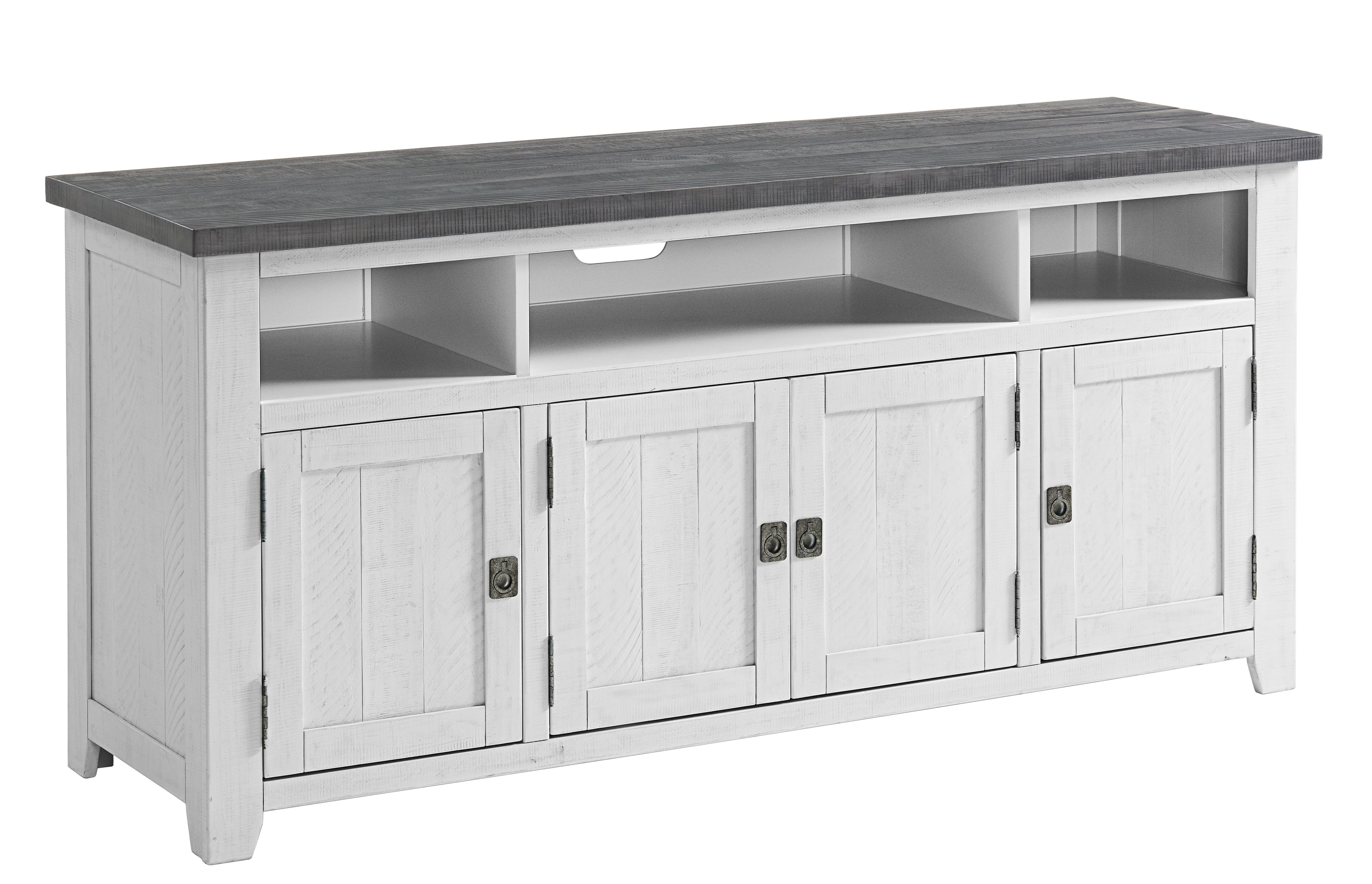 Lend some lodge-style casual charm to your living room design with the Coffee Plantation 65 in. TV Stand. This wide stand is rendered from solid pine hardwood and engineered wood, complemented by scratches and scuffs. For storage, three open shelves let you easily install cable boxes, game consoles, and more. The base has two single-door cabinets and a wide double-door cabinet, each featuring adjustable shelves and vented backing. Your choice of availalbe finish options.