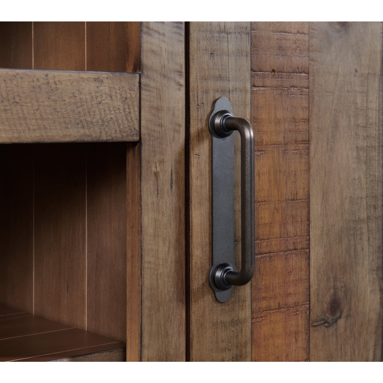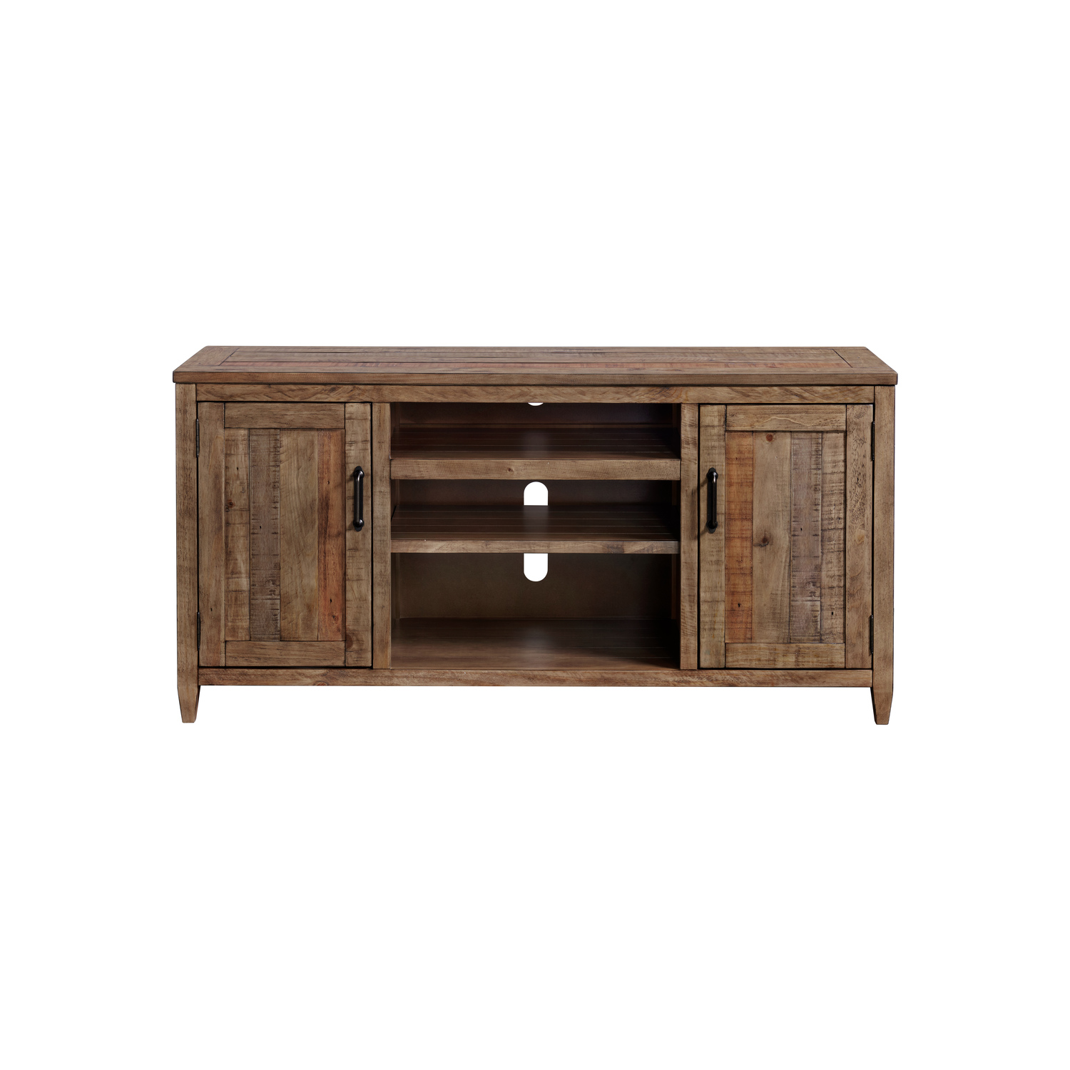 Finish: Reclaimed Natural Perfectly designed and scaled for large 65″ to 70″ flat panel TVs Two nicely sized cabinets, a large center open area, and an open upper cubby allow for plenty of storage options; Three (3) adjustable and removable shelves Oil rubbed bronze finished door pulls are reminiscent of a cask door found at a winery; Constructed of solid New Zealand Pine and MDF for extra durability and strength Assembled Dimensions: 65″ W x 32″ H x 18″ D. Approximate Side Cabinet Dimensions: 15.5” W x 25.5” H x 16” D, Center Opening: 26” W x 17.25” H x 16” D, Open Cubby Dimensions: 26” W x 5.25” H x 16” D