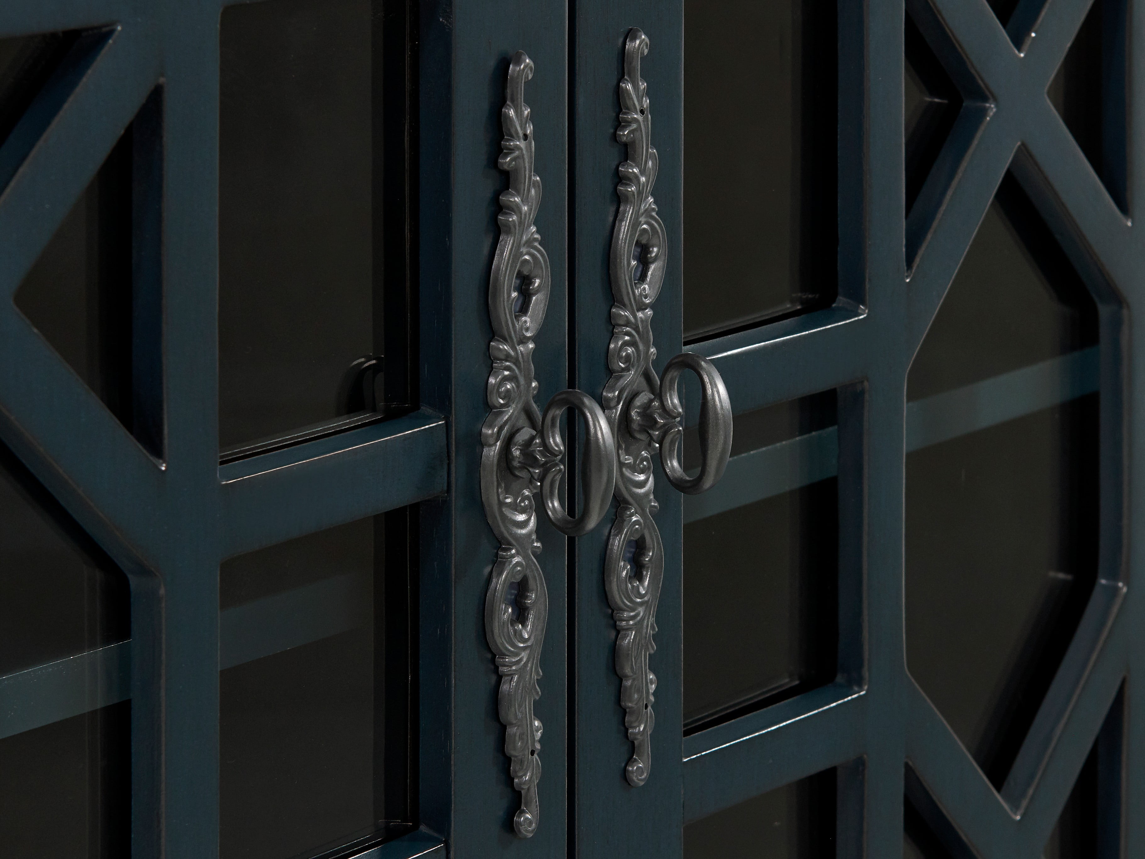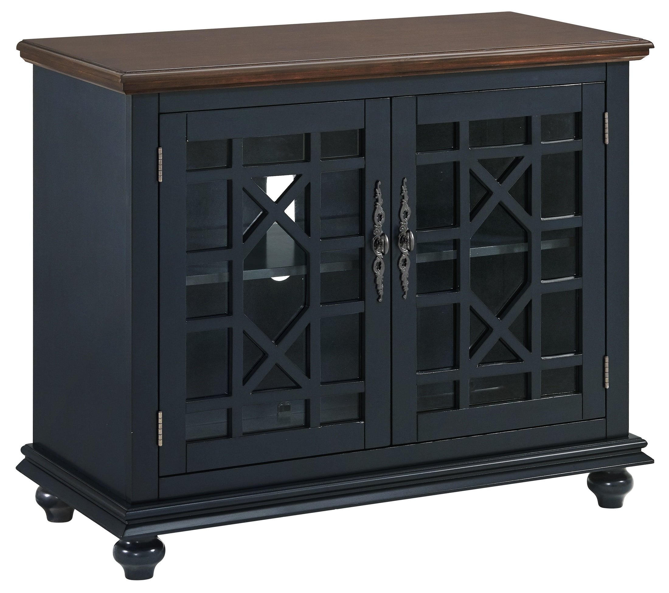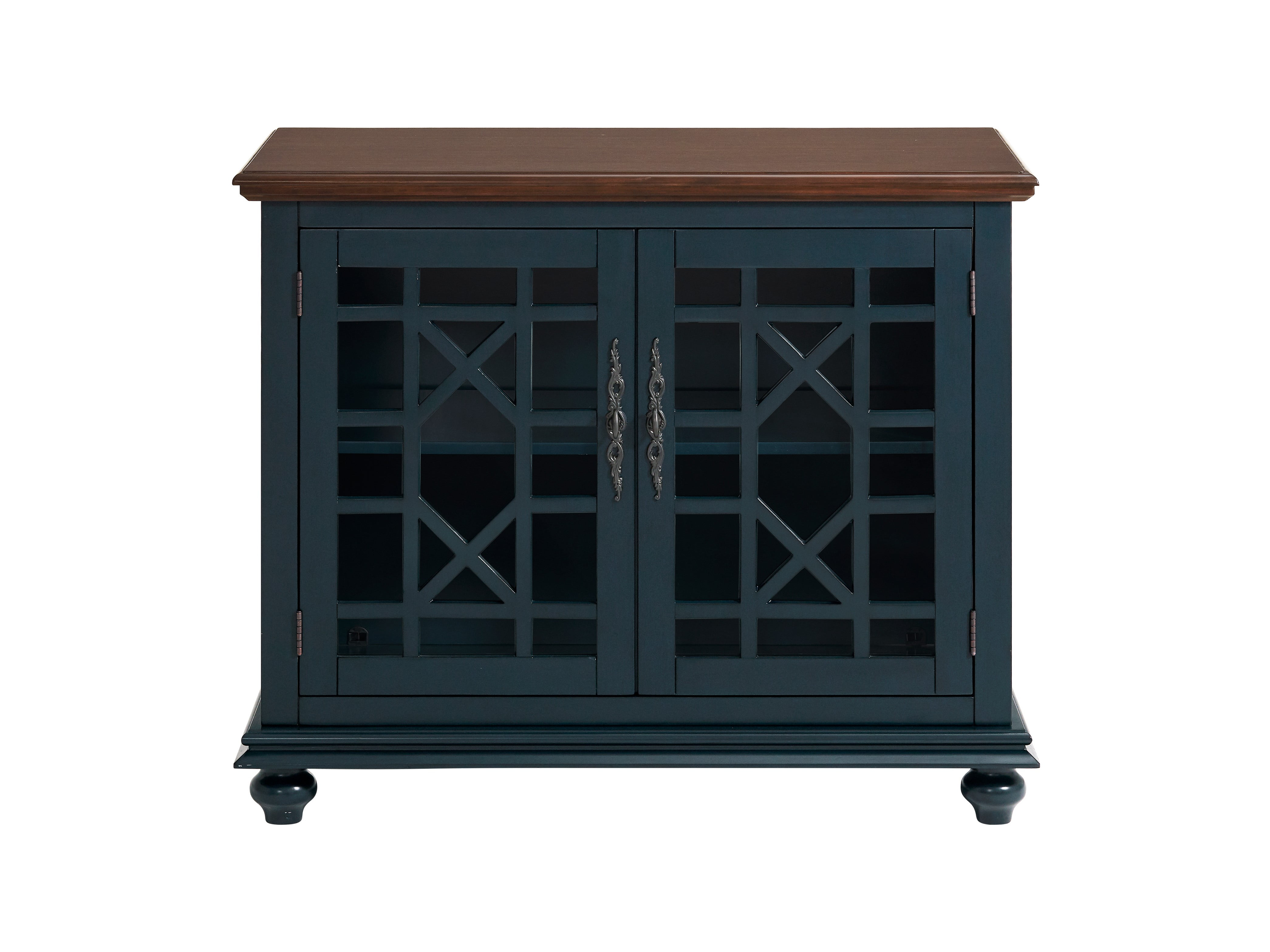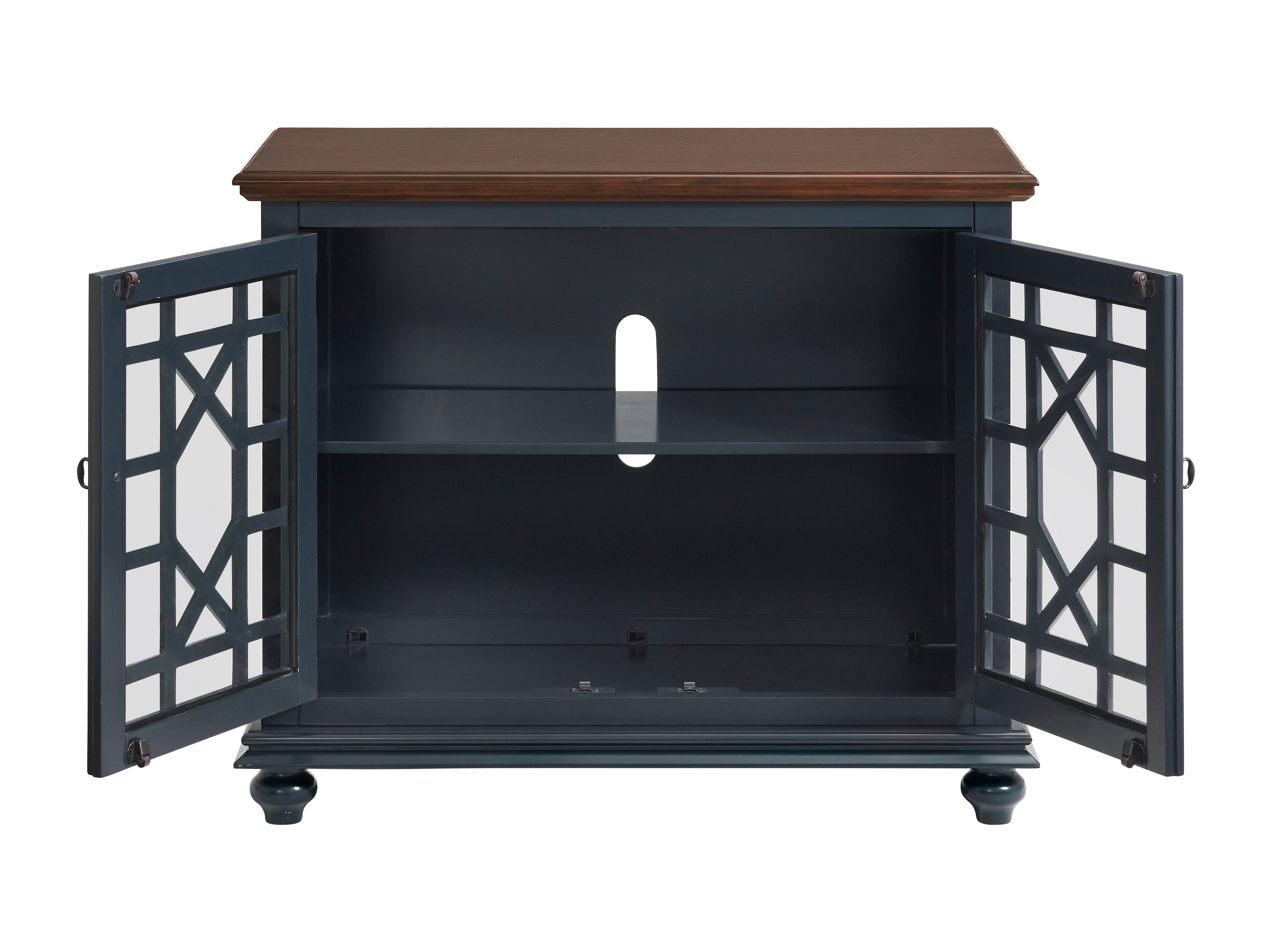 Two tone finish with Catalina Blue finish case and Coffee Walnut Finish Top Versatile design allows for the piece to be used as a small TV stand, as an accent or occasional cabinet, or credenza in the entryway, hallway, living room, dining room. Design features include slightly distressed painted finish, intricately cast door pulls, turned bun feet, and architectural moldings; Two tempered glass doors with an elegant trellis design and an adjustable shelf allowing for plenty of storage for TV components, games, books, and other belongings; Vertical cable management cutouts