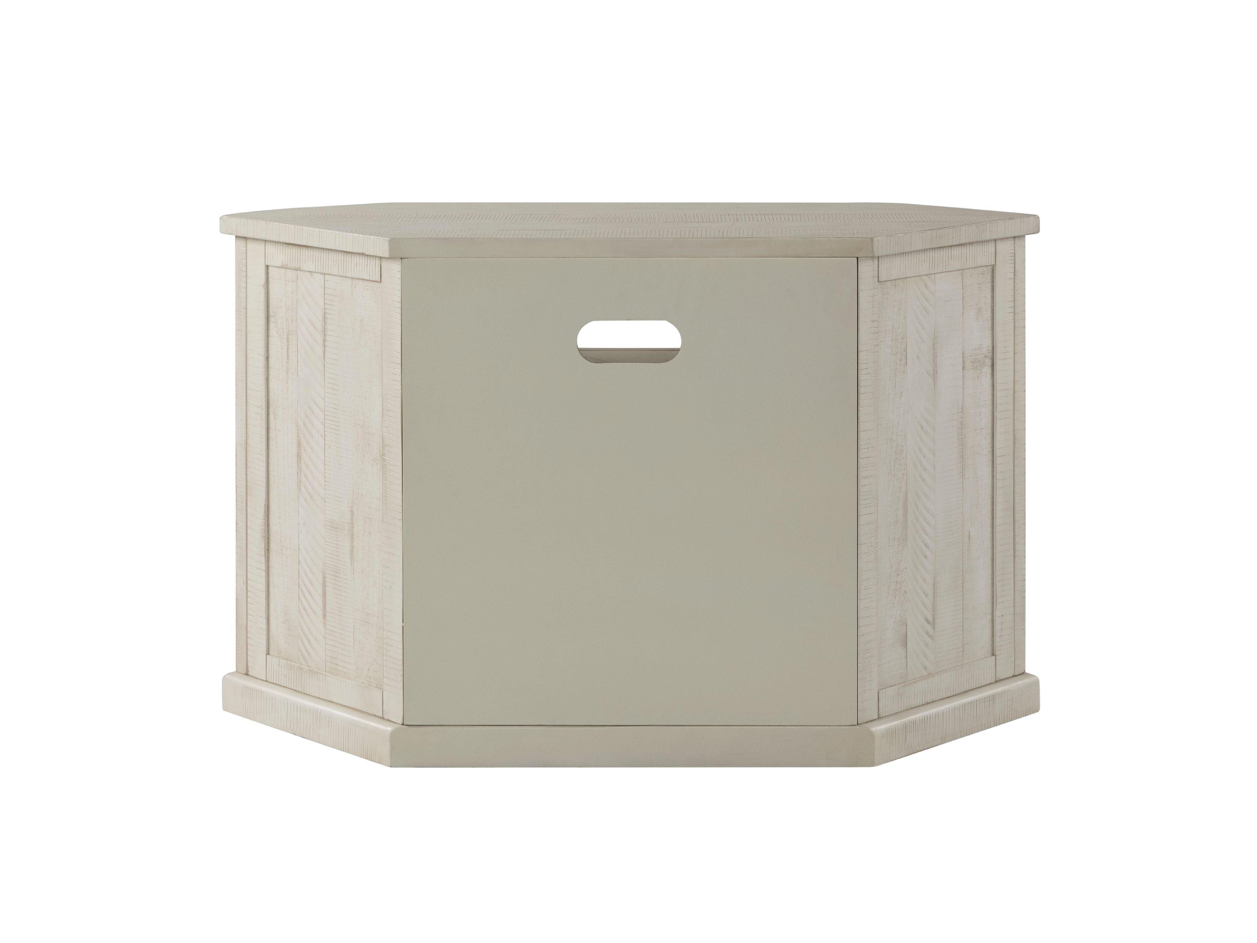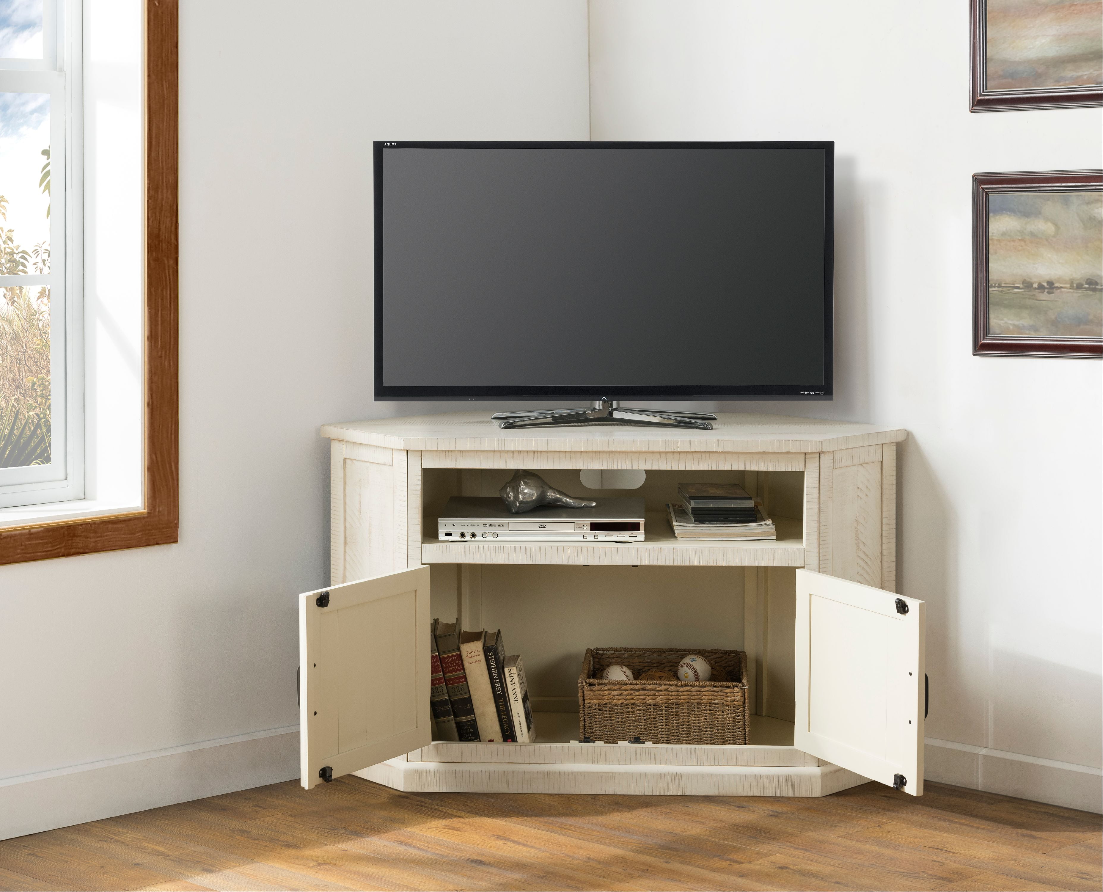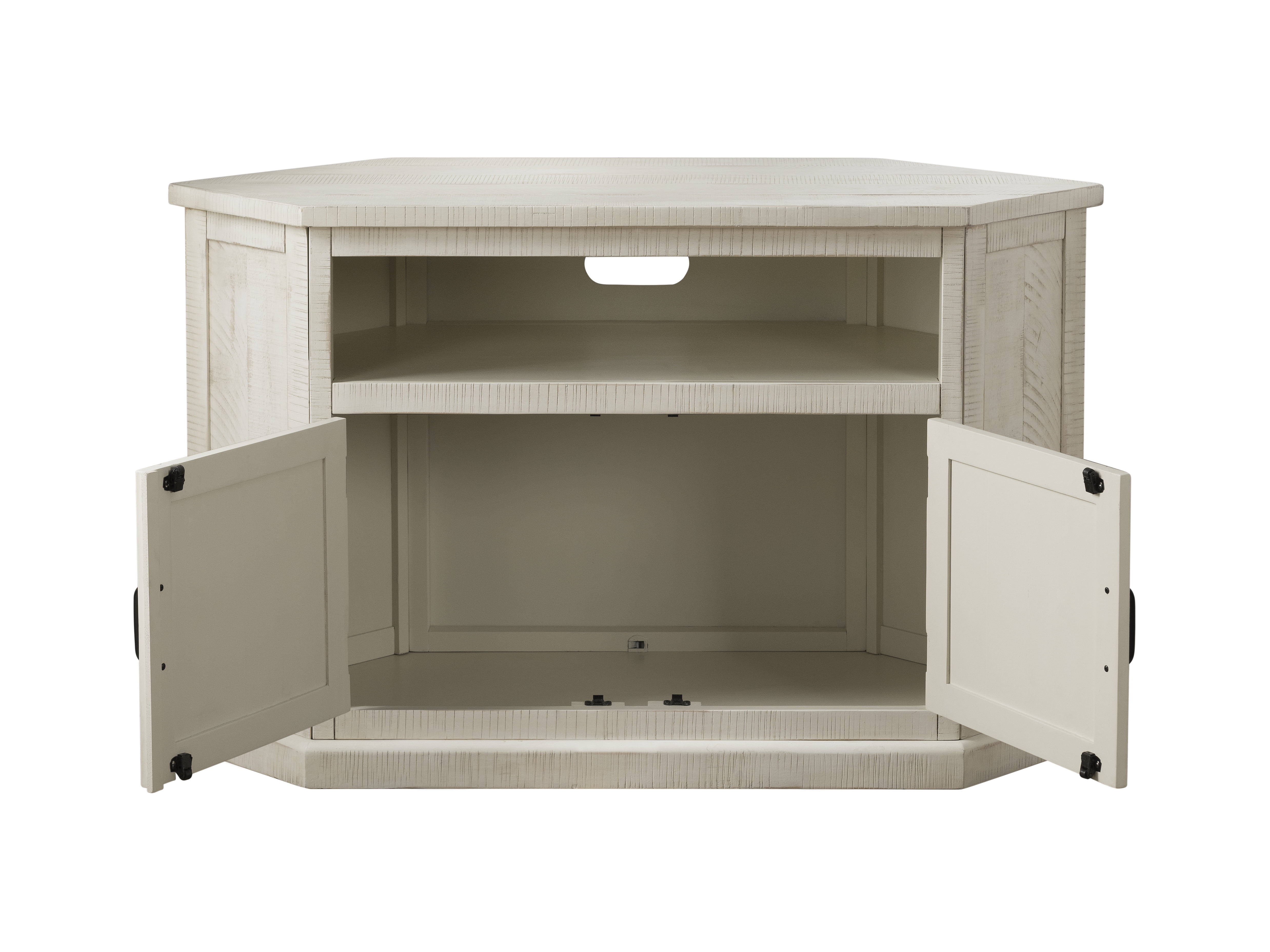 Finish: Antique White Constructed of solid wood – New Zealand Pine Corner TV stand design perfectly fits in the corner of the living room for extra space saving Open cubby offers plenty of room for cable box, gaming systems, or a sound bar Large cabinet design provides for versatile storage options for additional audio, video, gaming components, or other belongings Ideal for most 55″ flat panel TVs Cubby opening dimensions: 31″ W x 6.5″ H