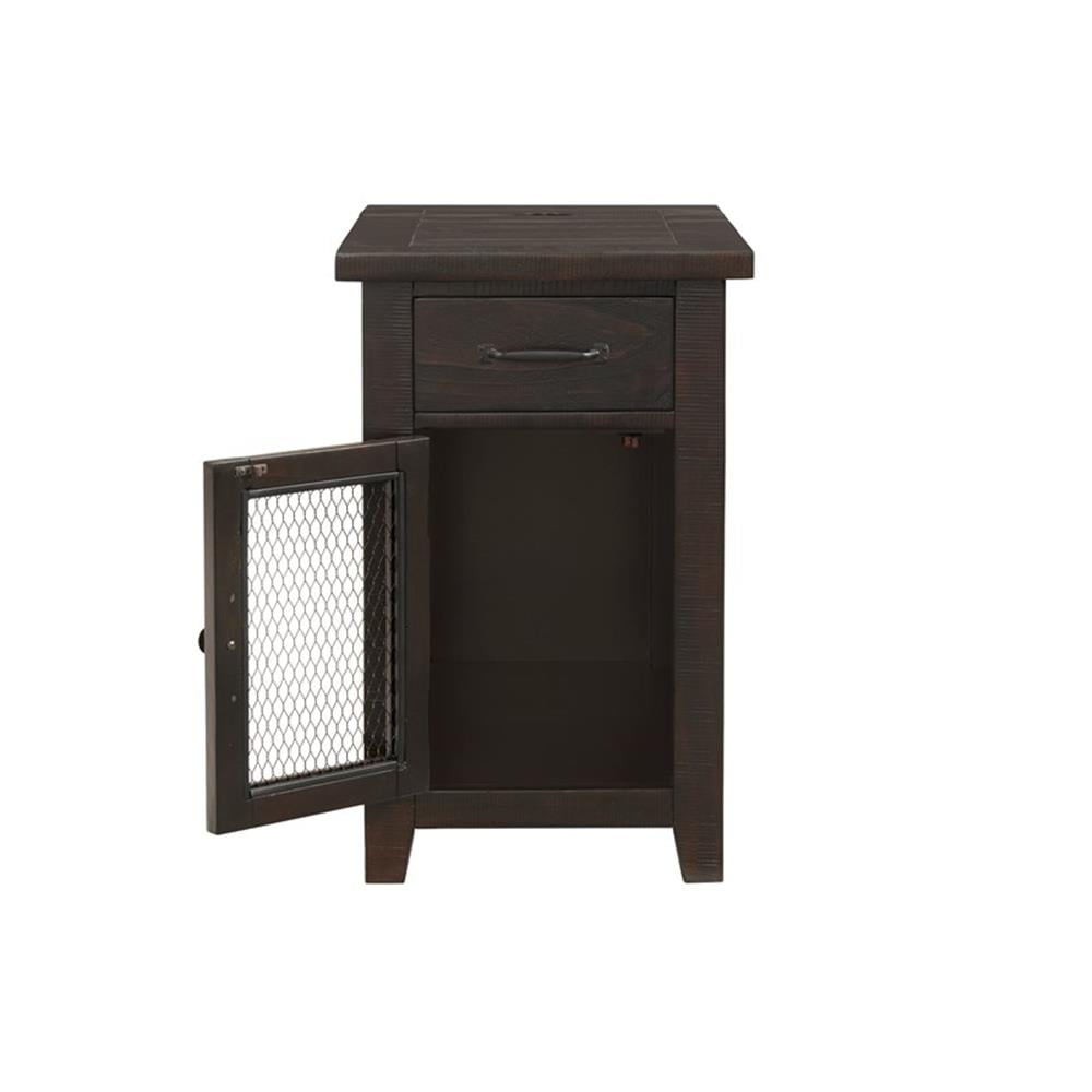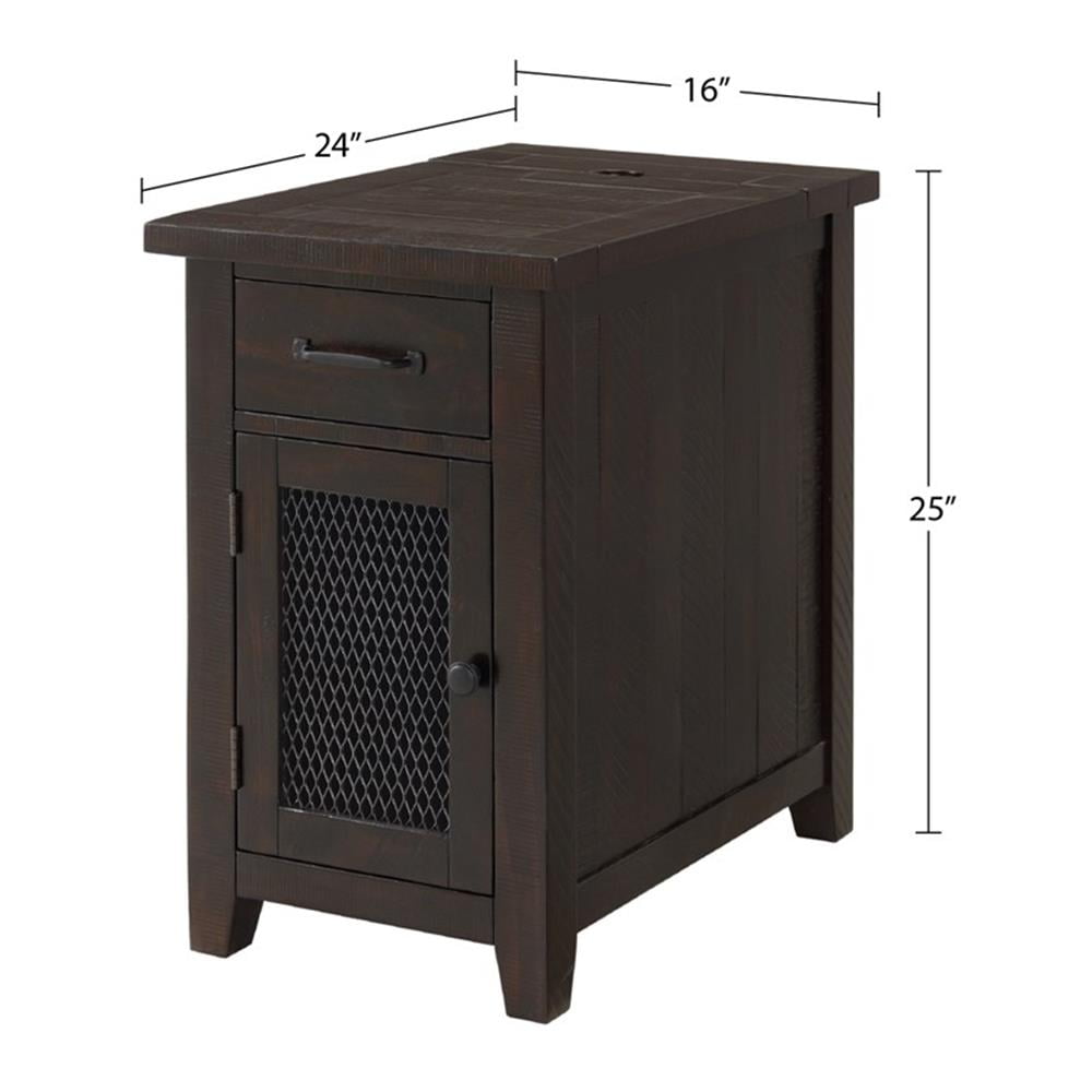 The Rustic Chairside Table with Power features Rustic and Farmhouse styles in to fashionable and functional table. A hidden flip top cover on the top reveals a power bank with (2) outlets and (2) USB ports for convenient charging. One (1) drawer and one (1) cabinet area offer plenty of storage space for books, magazines, and games. Crafted from solid Pine and finished in with rustic sawmarks in Espresso. Drawer slides out on smooth ball bearing roller guides. The cabinet door features a metal wire door insert with complementing hardware that add extra farmhouse detail to the collection. Perfect to also be used as a side table, end table, or nightstand. Assembled product dimensions: 16″ W x 24″ D x 25″ H. Approximate Drawer Dimensions: 8.5″ W x 10″ D x 3.5″ H , Approximate Cabinet Dimensions: 10″ W x 14″ H. Product materials: Solid wood – New Zealand Pine. Item ships assembled. Made in Vietnam.