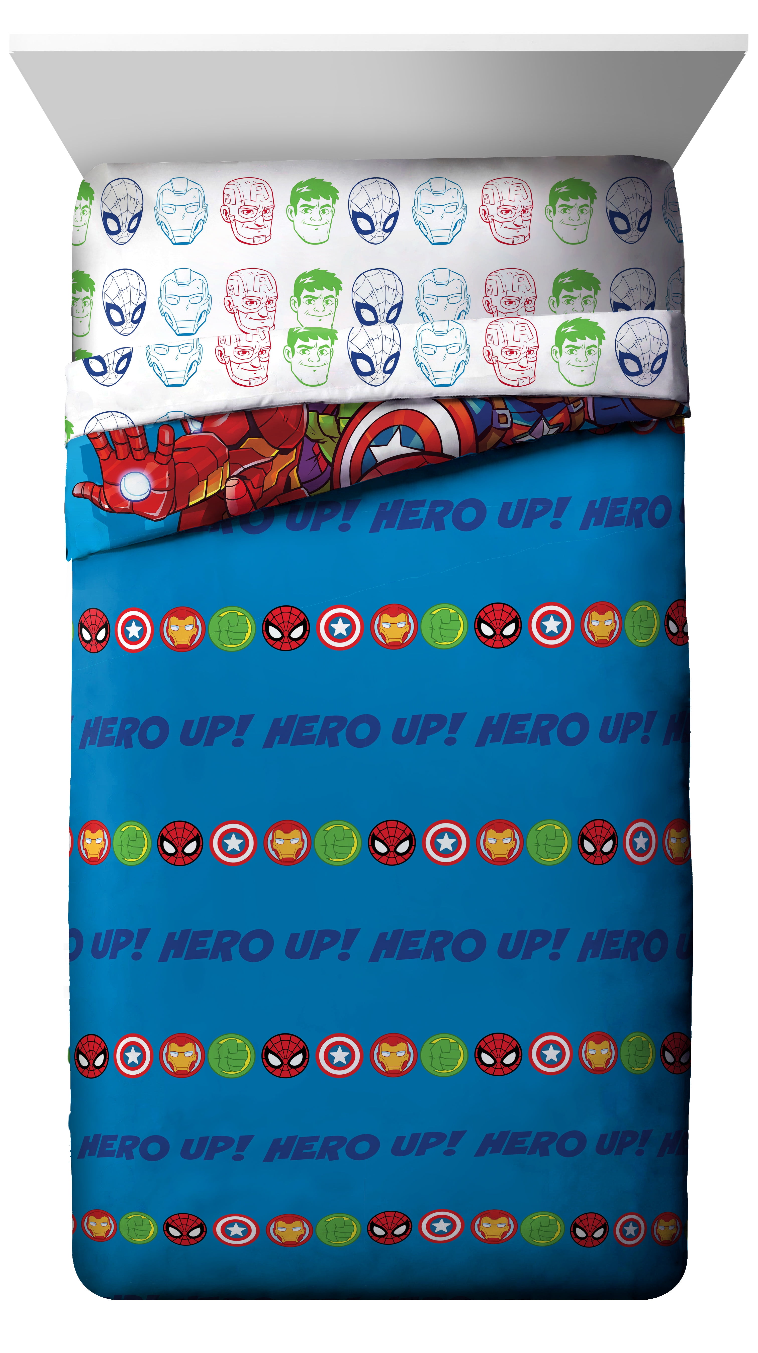 Reversible comforter features dual designs Made from 100% microfiber Machine wash cold, tumble dry low Pillowcase features Hulk and Spiderman on blue background Reverses to Captain America and Iron Man on red background