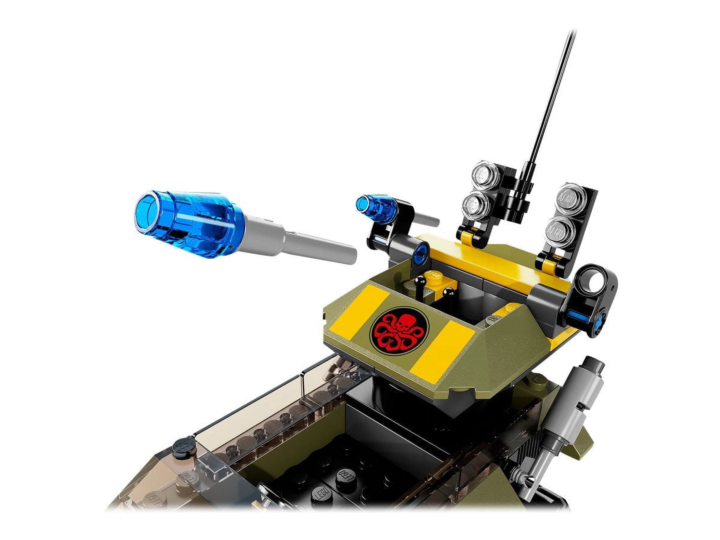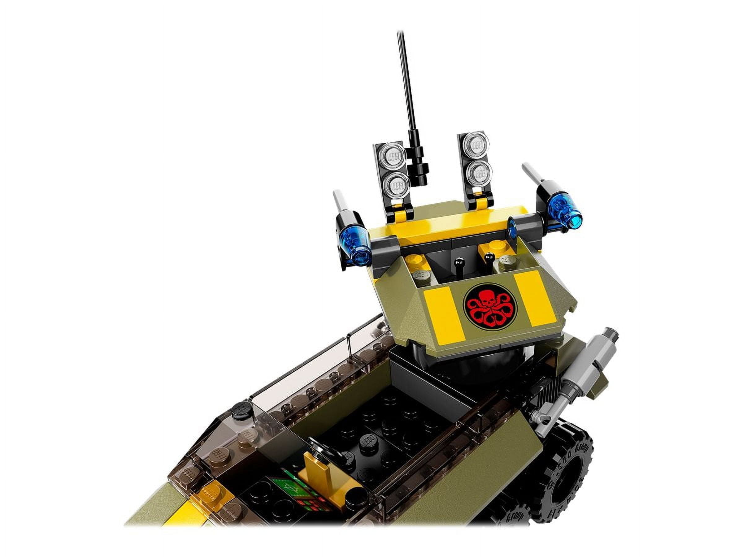 The evil Red Skull has seized the cosmic cube and is bringing chaos to the world in the rugged Hydra off-road vehicle with working suspension wheels, rotating turret and dual flick missiles. Hop on the motorcycle and race Capta to the rescue. Will he be able to disarm it using his impenetrable shield and recover the cosmic cube? Includes three minifigures with assorted accessories: Capta, Red Skull and a Hydra henchman.
