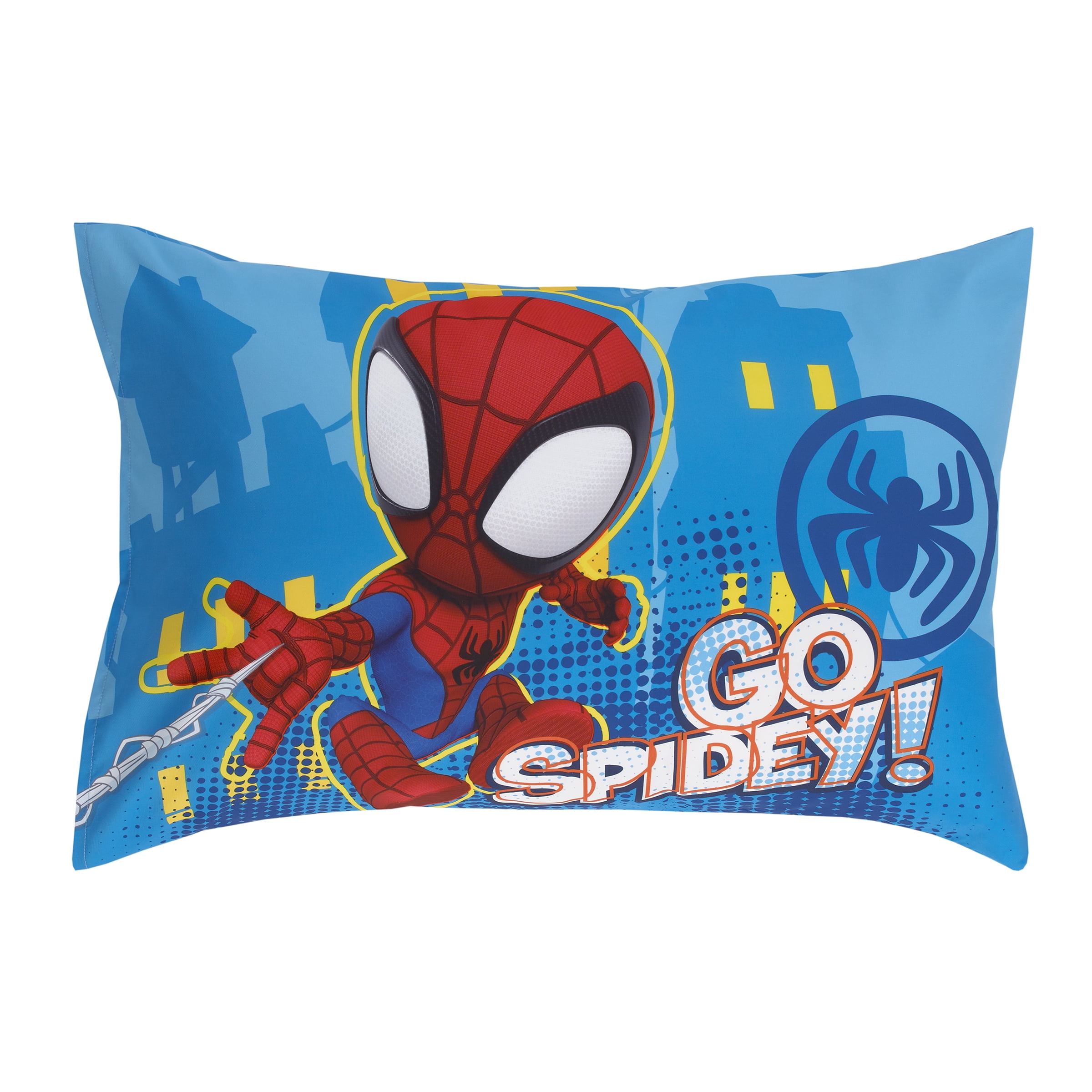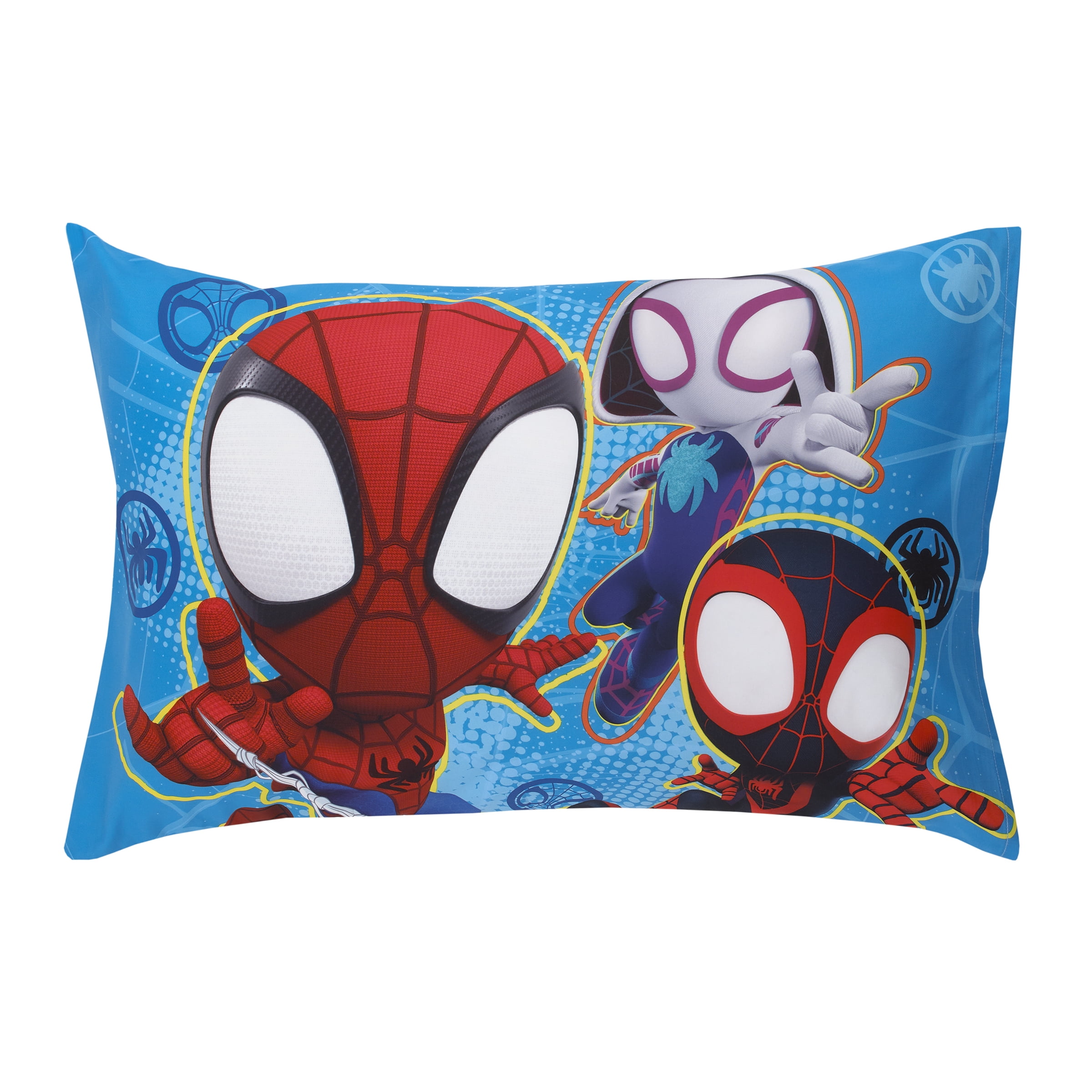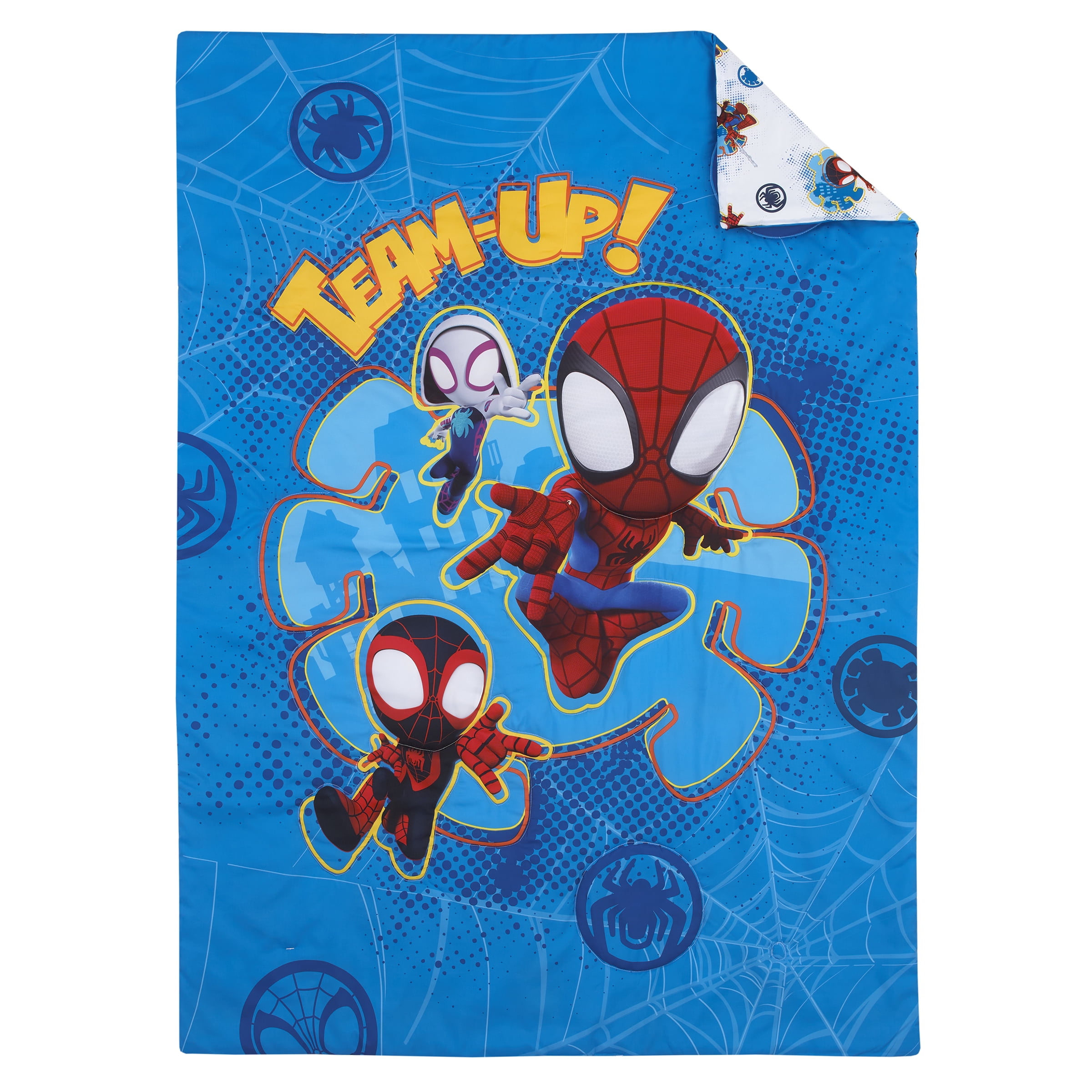 Spidey Team 4-Pc Toddler Bed Set includes a comforter, fitted bottom sheet, flat top sheet, and reversible pillowcase Made of super soft plush fabrics Bold colors of red, white and blue – perfect for a little boy’s bedroom