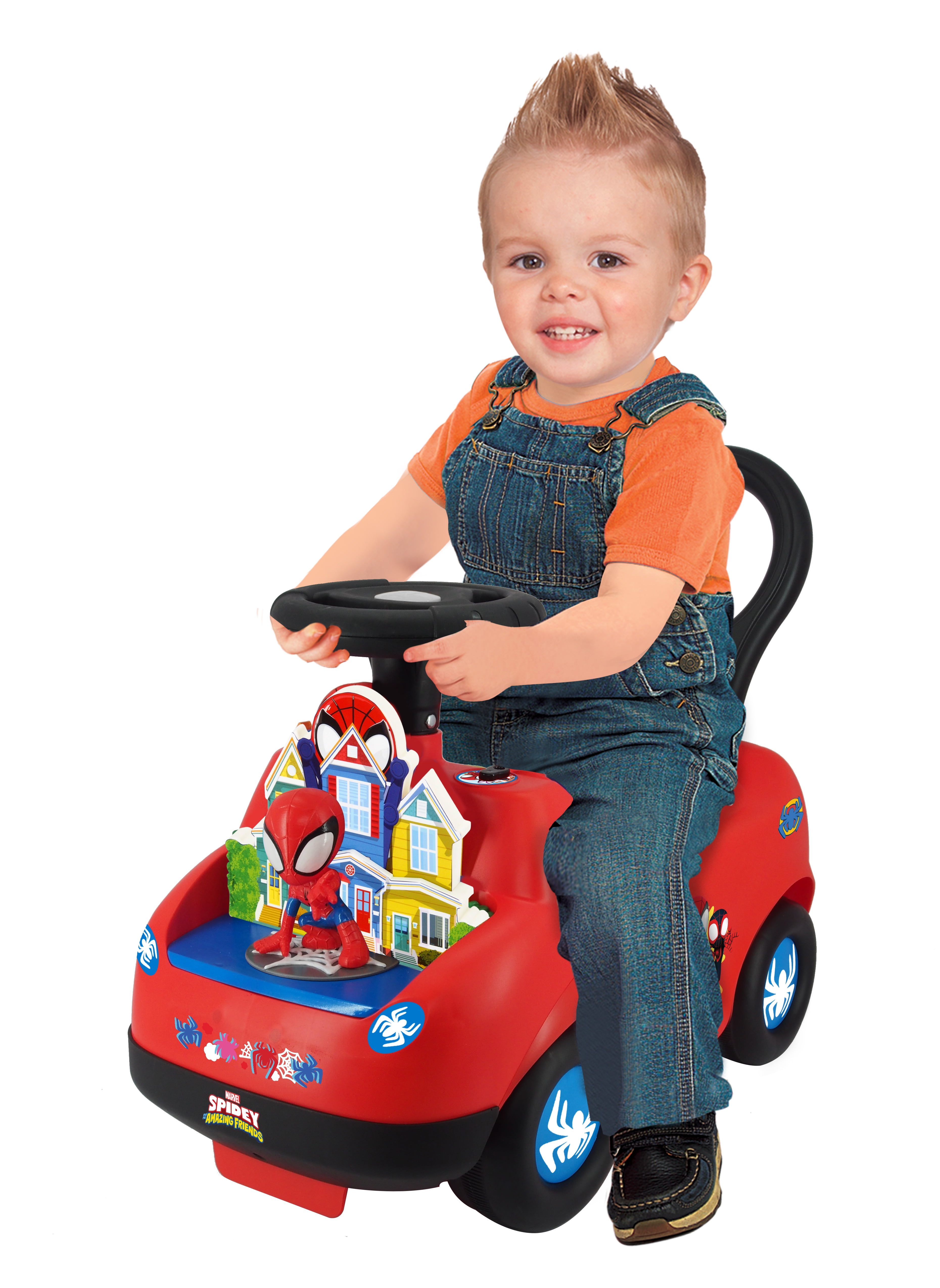 Marvel Lights N’ Sounds Spider-Man Spidey Adventure Ride-on Age Range: 1-3 years. Provides kids hours of ride on play fun and it is easy to clean. Ride-on plays sounds and has flashing lights! Slide gearshift to see Spidey move forward and back in his neighborhood! Interactive dashboard with electronic activities features a revving engine and other fun sounds Safe and durable construction for hours of riding fun.