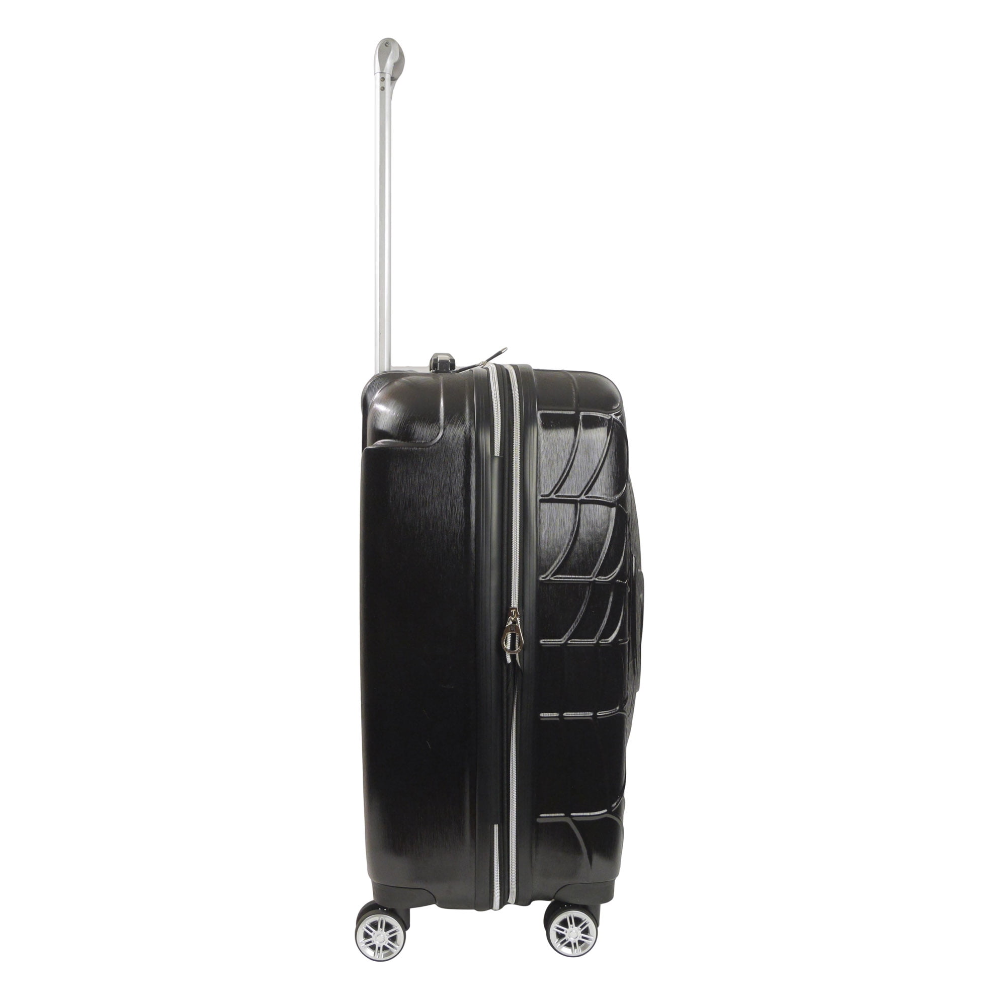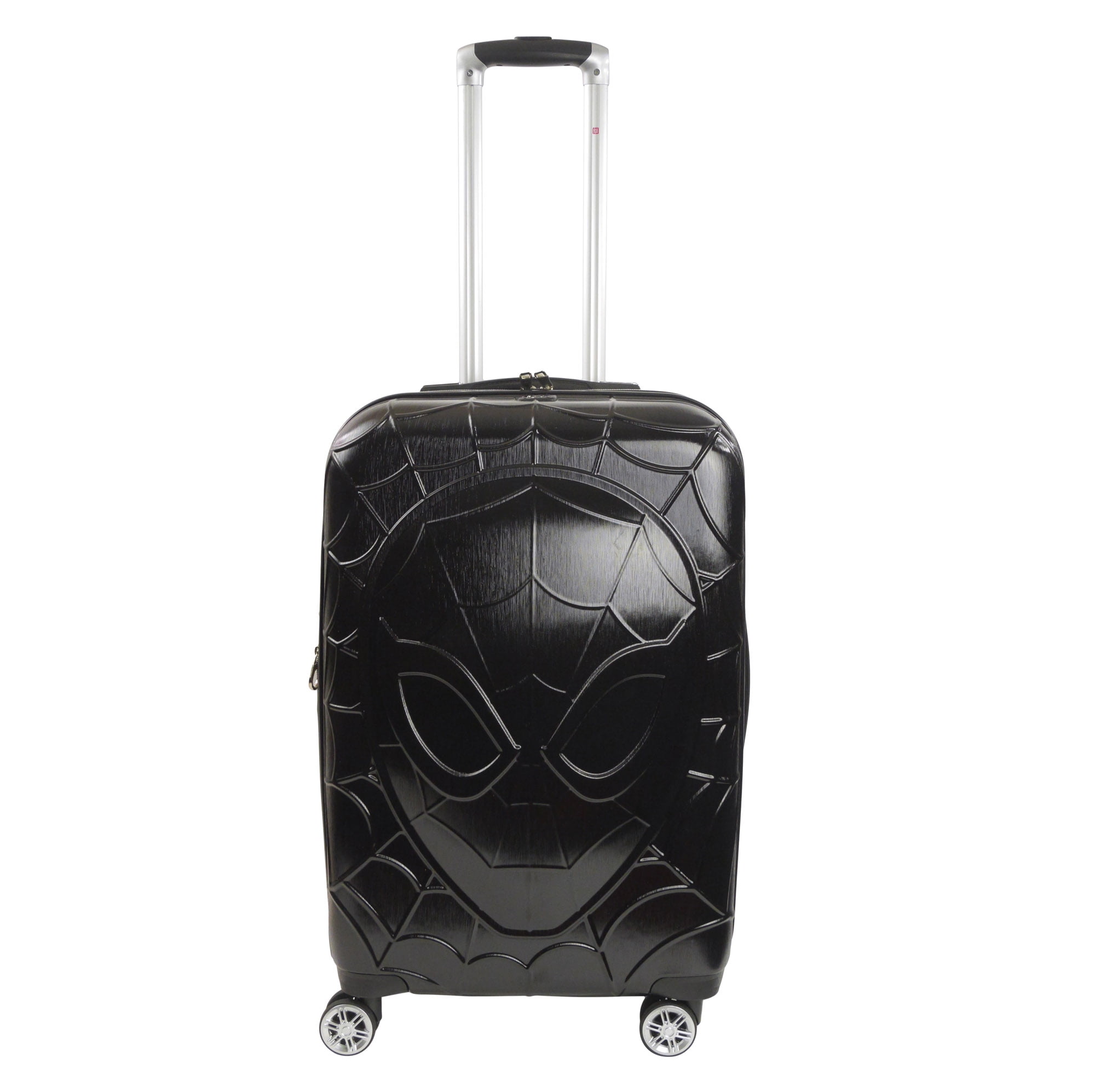 Molded hardshell luggage featuring a stylish black Spider-Man mask design; Hardshell luggage carrier is intended as checked baggage for airlines Hard luggage features a sizable polyester-lined main zip compartment for easy packing, a zip wet dry compartment for personal essentials, and clothing compression straps to keep clothing from wrinkling; expandable 2 inch gusset allows for additional storage space Wheeled luggage features a lightweight upright design with eight 360-degree multi-directional spinner wheels and retractable handle which allows for effortless movement; top and side handles allow for easy carrying and for loading into cars and trunks Travel luggage bag features a hard shell ABS plastic case which protects your luggage and is easy to spot clean; hardside luggage is an officially licensed Marvel product Lightweight luggage spinner measures 26 H x 16.5 W x 12 D in inches, and weighs 7.5 lbs