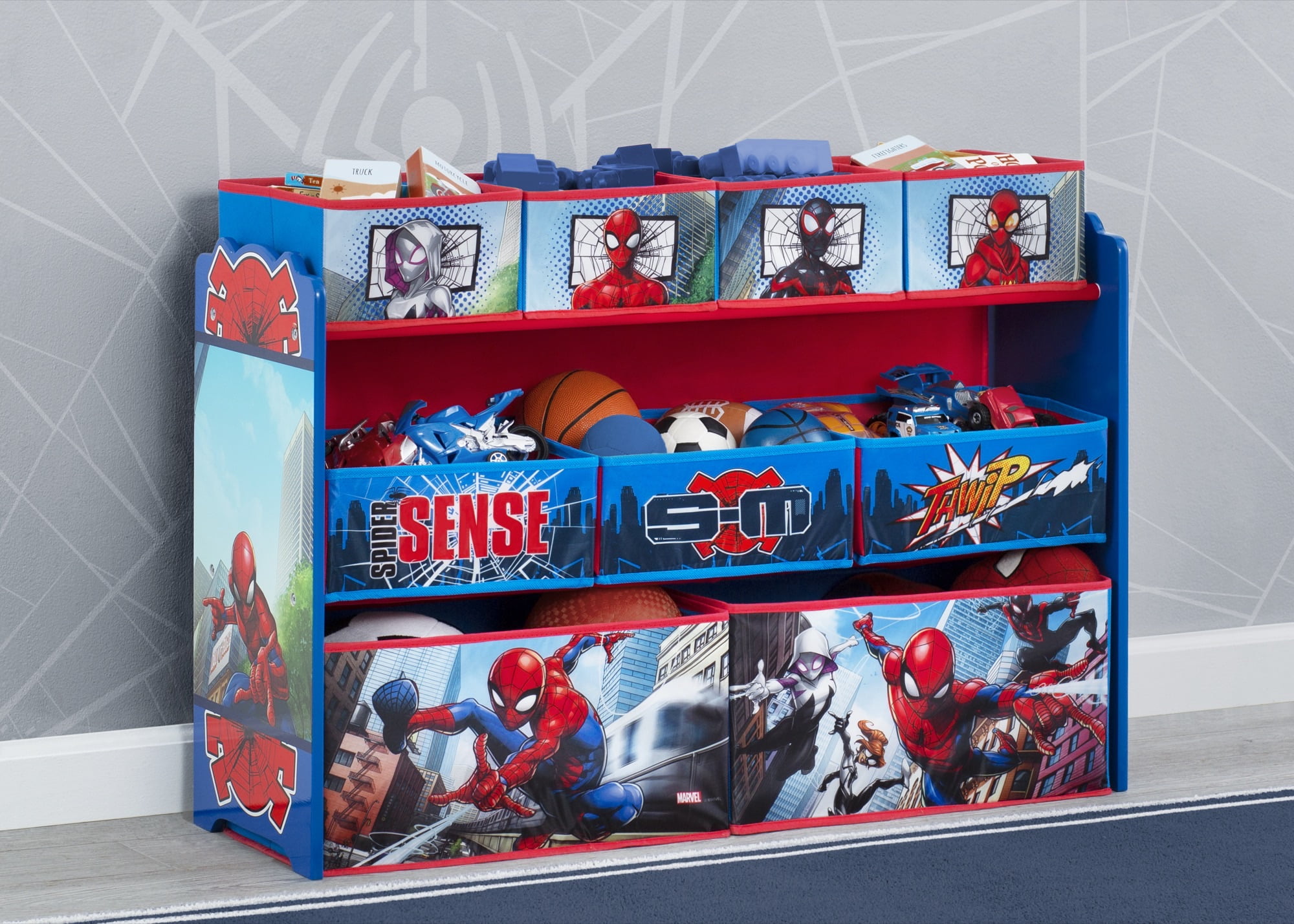Marvel Spider-Man Deluxe 9 Bin Design and Store Toy Organizer by Delta Children. Designed for little kids with big imaginations, this cool toy storage bin features colorful graphics of Spider-Man. Plus, this convenient toy bin comes with reusable vinyl cling stickers that allow your child to decorate the sides themselves. Supported by a sturdy frame, this practical storage piece features nine fabric toy bins in three different sizes to stow a ton of toys. A great option for any bedroom, playroom or living room.