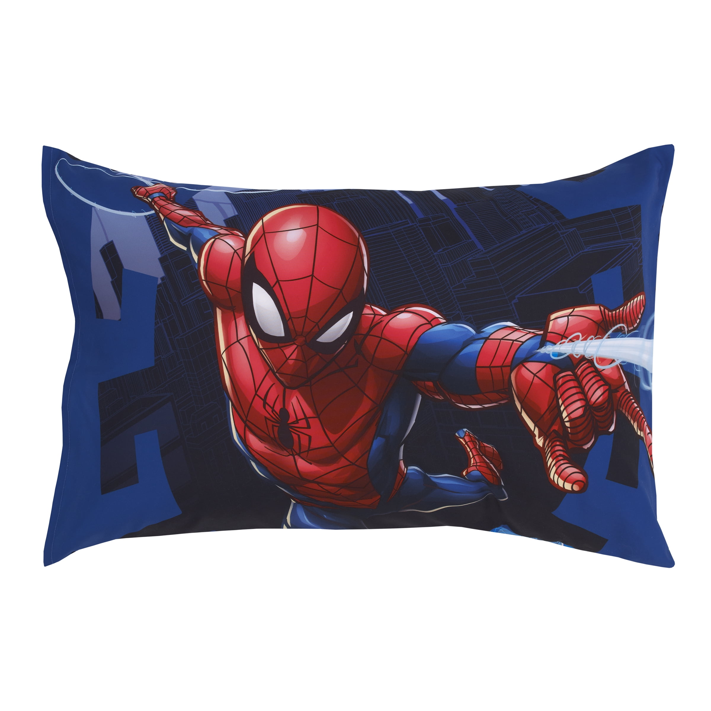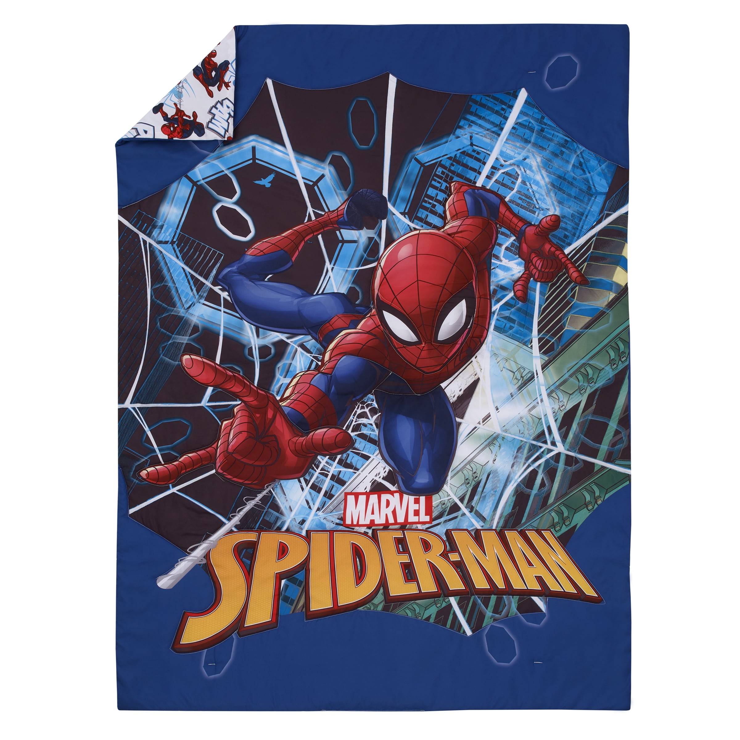 This 4-piece toddler set Includes a comforter, fitted bottom sheet, flat top sheet, and reversible pillowcase Features Spiderman ready for action in bold colors of blue, red, yellow, and white Includes everything you’ll need for a coordinated look