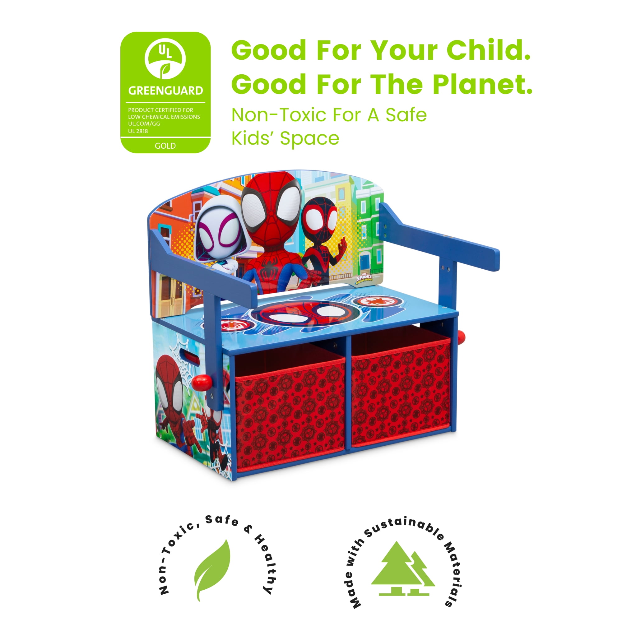 GREENGUARD GOLD CERTIFIED: This bench/desk meets the most stringent chemical emissions standards to create a healthier home for your child. Tested for more than 10,000 chemicals and VOCs, this bench/desk contributes to cleaner indoor air RECOMMENDED USE: Recommended for ages 3+ MULTI-FUNCTIONAL 2-IN-1 DESIGN: Easily converts from storage bench to desk | Offers perfect space for playtime, crafts, homework and more | Two fabric bins under the seat provide plenty of storage for books, toys or art supplies FOR THE SPIDER-MAN FAN: Features fun and colorful graphics of Spidey and His Amazing Friends QUALITY CONSTRUCTION: Built to last, made of sturdy, engineered wood and fabric | Meets or exceeds all safety standards set SIZE: 26.5″W x 17.25″D x 22.75″H | Easy assembly