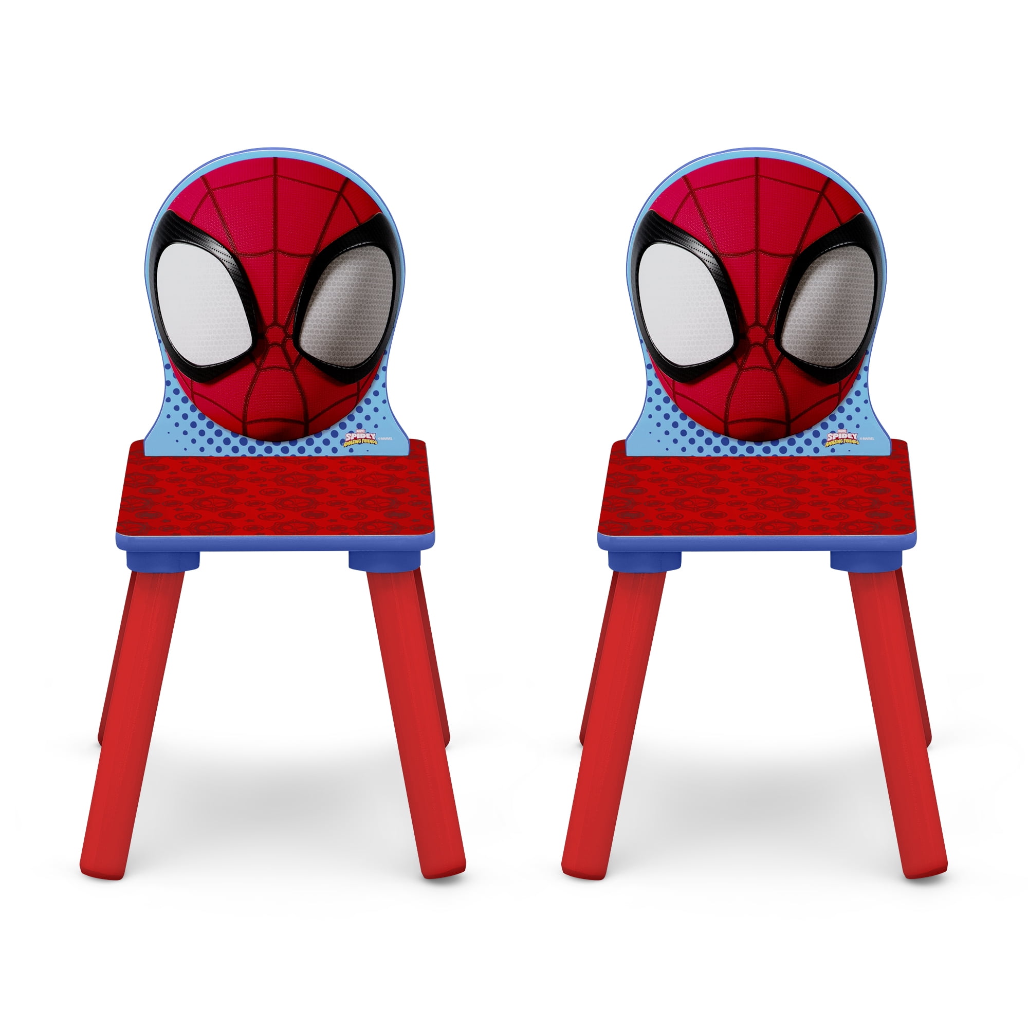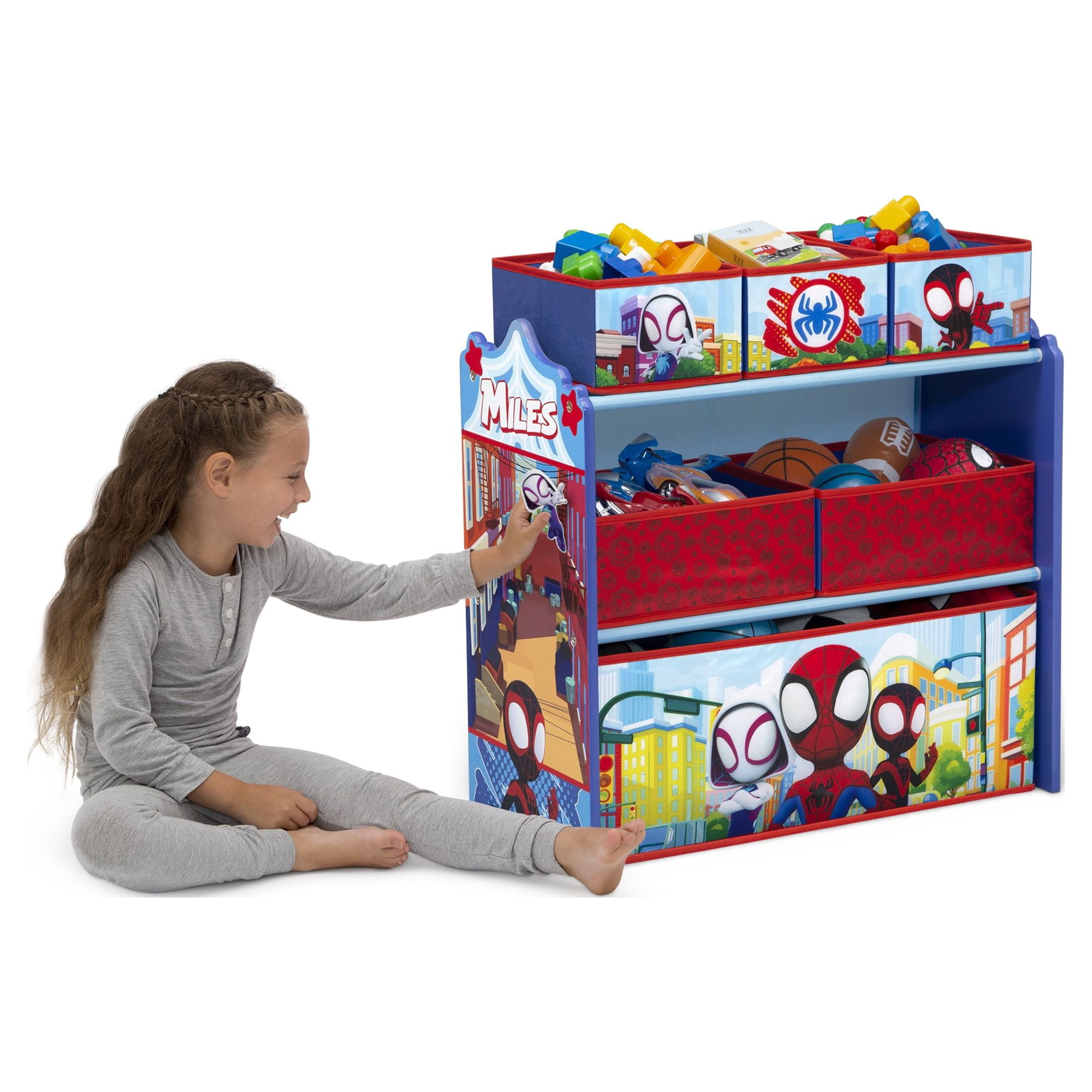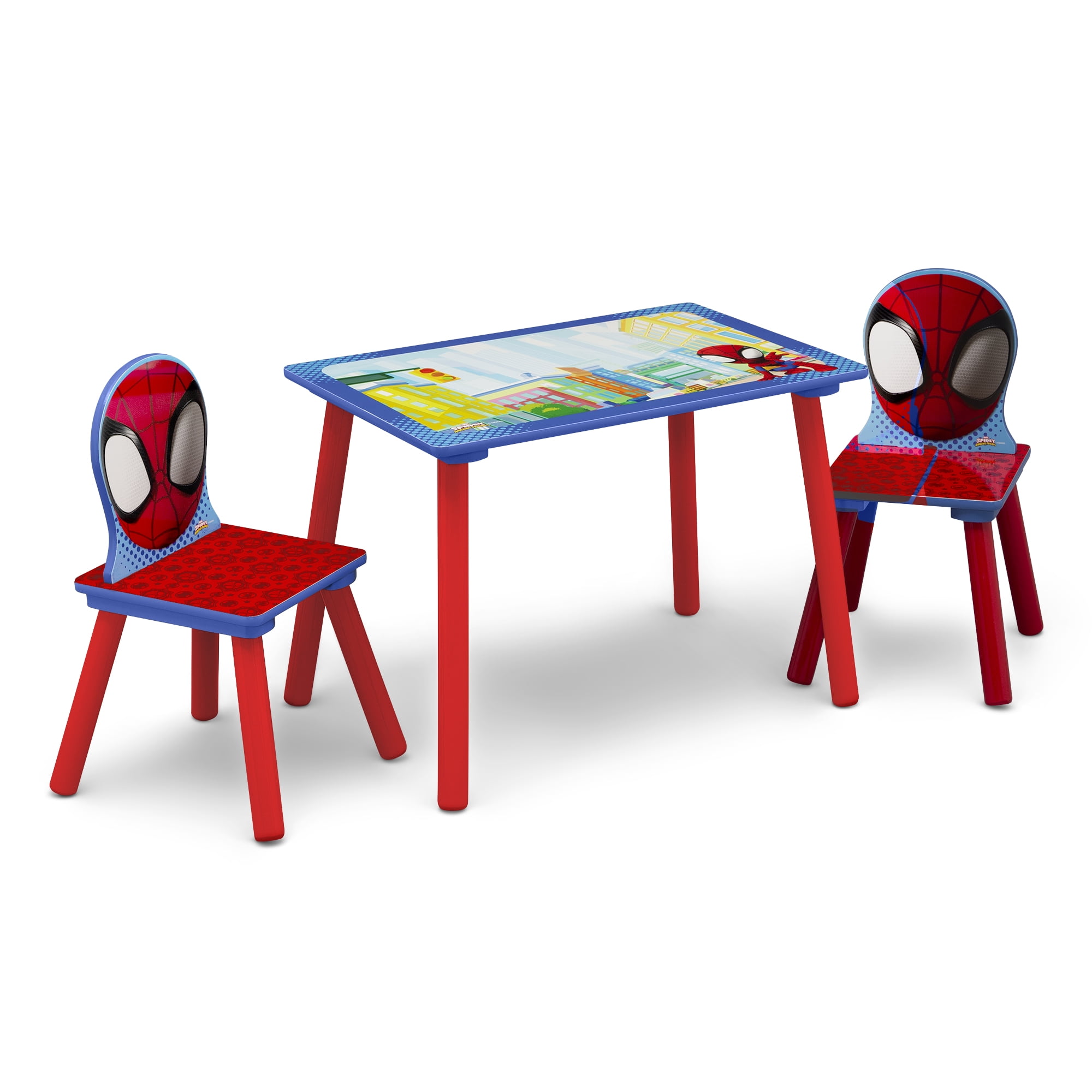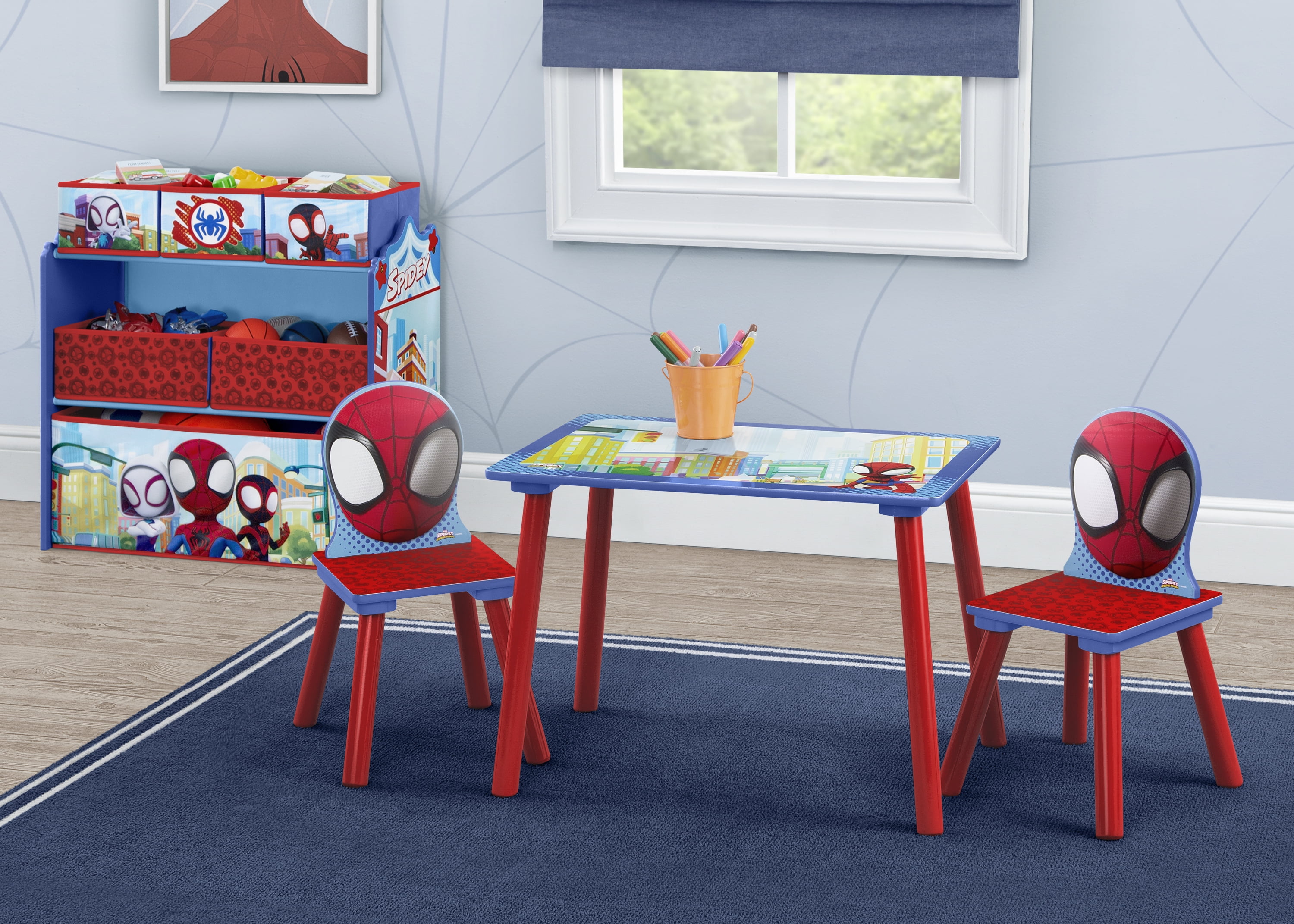 TABLE AND 2 CHAIR SET RECOMMENDED USE: For toddlers and kids ages 2+ | Each chair holds up to 50 lbs. DURABLE CONSTRUCTION: Made of engineered wood and solid wood | Scratch-resistant finish protects the table’s colorful graphics | Easy assembly SAFEST OPTION: Meets or exceeds all safety standards set by the CPSC SIZE: Assembled dimensions: 24”W x 20”D x 17.5”H” DESIGN & STORE 6 BIN TOY STORAGE ORGANIZER AGE RANGE: Recommended for ages 3+ | SAFE DESIGN: Bin meets or exceeds all safety standards set by the CPSC FOR SPIDEY FANS: Toy bin features colorful graphics of Spidey and His Amazing Friends | Will encourage your child to keep their space neat and tidy REUSABLE STICKERS: Kids will love arranging the reusable vinyl cling stickers to the sides of this organizer to create a new story every time they play TONS OF STORAGE: Toy Bin has 6 bins in varying sizes to fit a wide variety of toys, from small to large DURABLE CONSTRUCTION: Made of engineered wood, solid wood and fabric SIZE: Assembled dimensions: 24.61”L x 11.81”W x 26.57”H | Three medium bins: 7.75”L x 9.5”W x 5”H, two large bins: 11.6”L x 9.5”W x 5”H, one extra-large bin: 23.5”L x 9.5”W x 9.5”H | Easy assembly