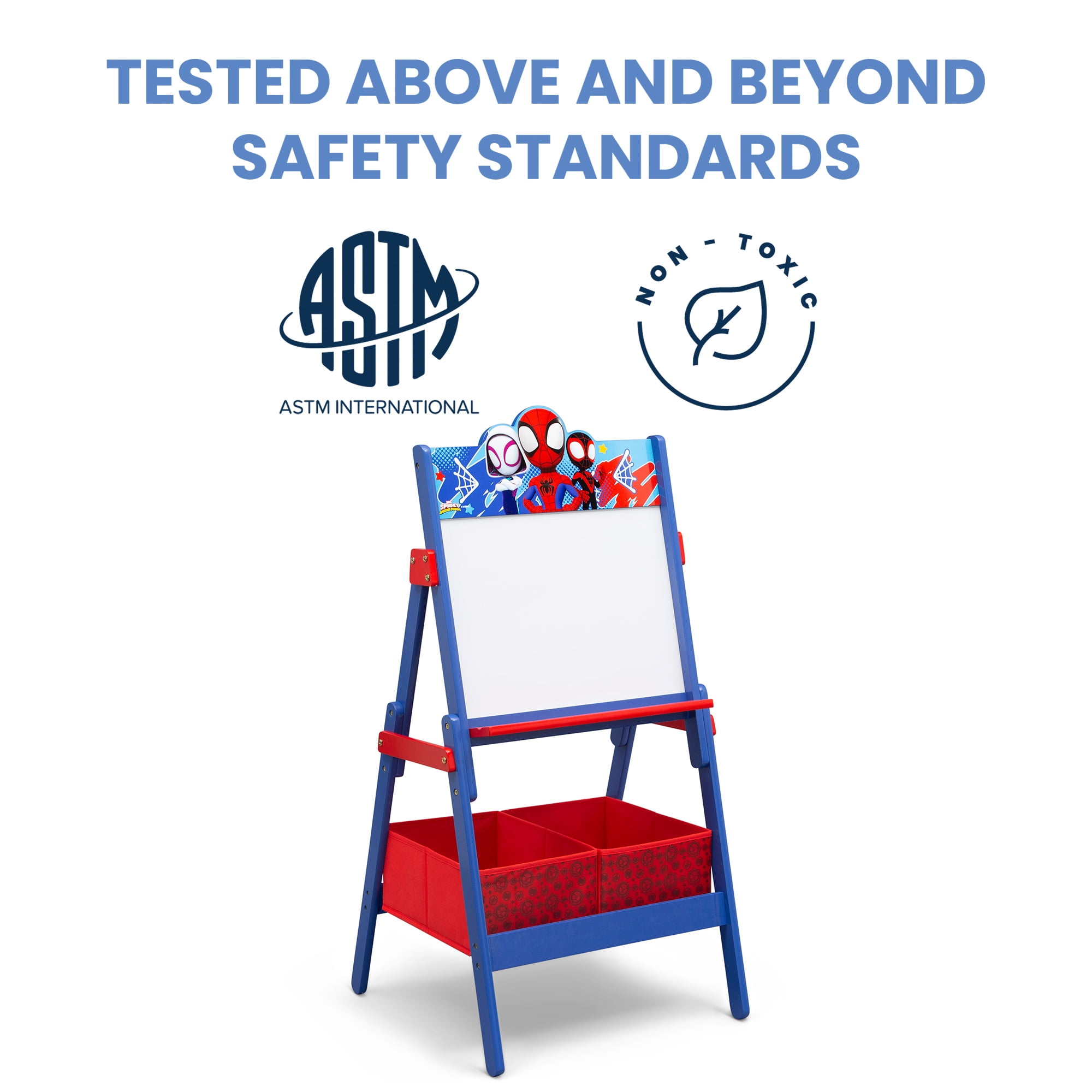 RECOMMENDED USE: Recommended for ages 3+ FOR THE SPIDER-MAN FAN: Features colorful artwork of Spidey and His Amazing Friends ENCOURAGES LEARNING & CREATIVE PLAY: Features a magnetic dry-erase surface | Ideal for pretend play, homeschooling or remote learning GREENGUARD GOLD CERTIFIED: This easel meets the most stringent chemical emissions standards to create a healthier home for your child. Tested for more than 10,000 chemicals and VOCs, this easel is certified to contribute to cleaner indoor air SMART STORAGE: Two fabric bins underneath the easel offer the perfect place to keep art supplies like chalk and markers, as well as art projects QUALITY CONSTRUCTION: Built of strong and sturdy wood to withstand years of use