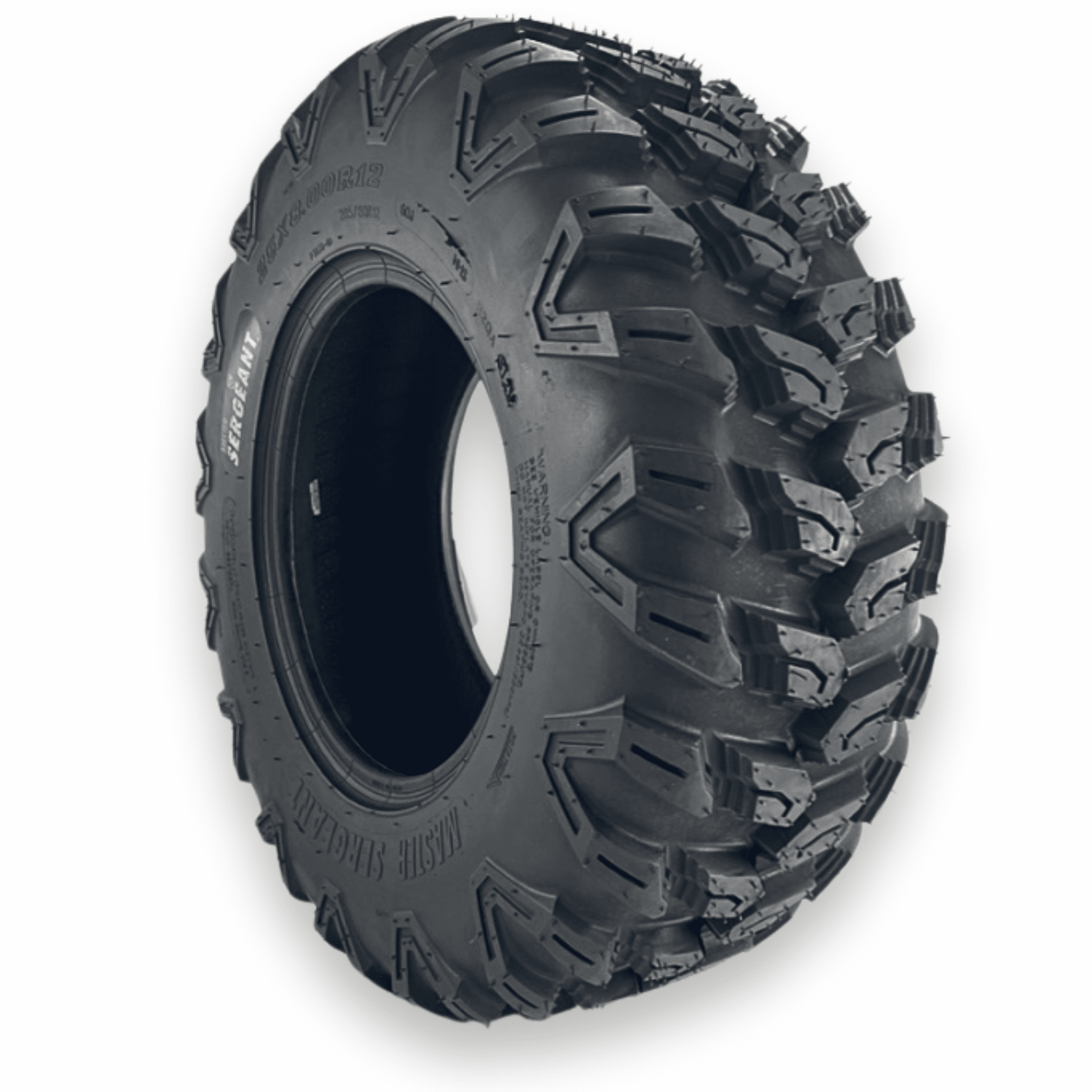 Master Sergeant FEATURES AND BENEFITS All terrain traction Heavy-duty controllability Longer lasting tread life OVERVIEW The Master Sergeant is an all terrain, all season tire manufactured for ATVs and UTVs. The tire greatly upgrades the all terrain traction. The staggered block placement with the stepped block edges greatly improves the soft, loose, and uneven terrain grip during the performance. These tread elements enable the tire’s forward motion at all times, increasing the deep mud and loose terrain traction. The tread elements with the high void ratio enable the tire to keep the footprint clean. They disperse mud and snow from the footprint, preventing them from blocking the surface contact throughout the performance. The durable construction and the ideal tread design work together to improve the heavy-duty controllability. The stronger structure keeps the ideal tire shape under the load and driving pressure. The heavy-duty construction does not allow the tire to deform under the load and driving pressure, boosting the overall load capacity. The ideal shape and the tread design ensure the surface contact, which increases the steering responsiveness and the driving stability. This results in a secure handling as well. The Sergeant enhances the usability as well. The durable, wear-resistant compound and the special damage resistant structure work together to improve the tread life length. The tread design and the stronger compound prevent premature and irregular wear formations. The tread’s self-cleaning nature allows the tire to avoid stone retention from harming the casing. On the other hand, the structural durability also protects the tire from avoiding punctures, cuts, and impact damage. This combination ensures a safer performing power. When it comes to ATV tires, there might be slight visual differences between brands and models even if the tires are of the same size. NOT FOR HIGHWAY USE: This tire model is not DOT-approved for highway use. Manufacturers recommend changing tires every 10 years. As long as tires are properly stored before they are sold, the year of their manufacture will not shorten their service life.